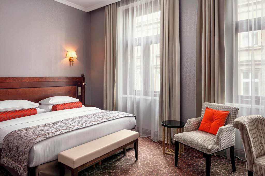 This stylish hotel boasts the perfect blend of traditional, time-worn features and modern design touches. The Next Door restaurant is run by celebrity chef Zdenek Pohlreich and offers an extra-special dining experience. It also features the building?s original ceiling frescoes which date all the way back to 1889! Fancy a quick workout? Make a beeline for the sleek fitness suite, before unwinding in the sauna. When it comes to exploring Prague, you couldn?t be better placed. Public transport stops are right around the corner and the enchanting Old Town and Wenceslas Square are both nearby.Deluxe rooms sleep up to 2 adults and have bathroom containing a bath with shower attachment, air conditioning, hairdryer, bathrobe and slippers, flat screen television, tea and coffee making facilities, mini-bar and safety deposit box. Room upgrade options are also available.