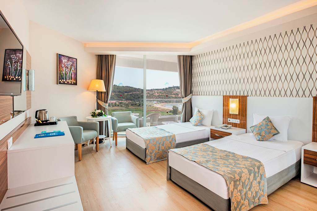 There's something for all the family at Palm Wings Ephesus Beach Resort. This place does terrific Turkish getaways to a tee, with modern, spacious rooms, four outdoor pools, a splash park and a beautiful beachfront location. And better still - when you're on All Inclusive Plus as standard, mealtimes couldn't be more of a doddle. Sit down to dine and six restaurants will be ready to serve everything from local to Mexican dishes! A whopping seven bars means grabbing a cocktail or a coffee on the hop are both easy. Enjoy the enriching spa and range of sports activities, while the kids will love the children's club, choice of waterslides and play areas!Standard Double rooms in the Main Building sleep up to 3 adults and have bathroom, hairdryer, air conditioning (depending on weather), television, kettle and balcony.