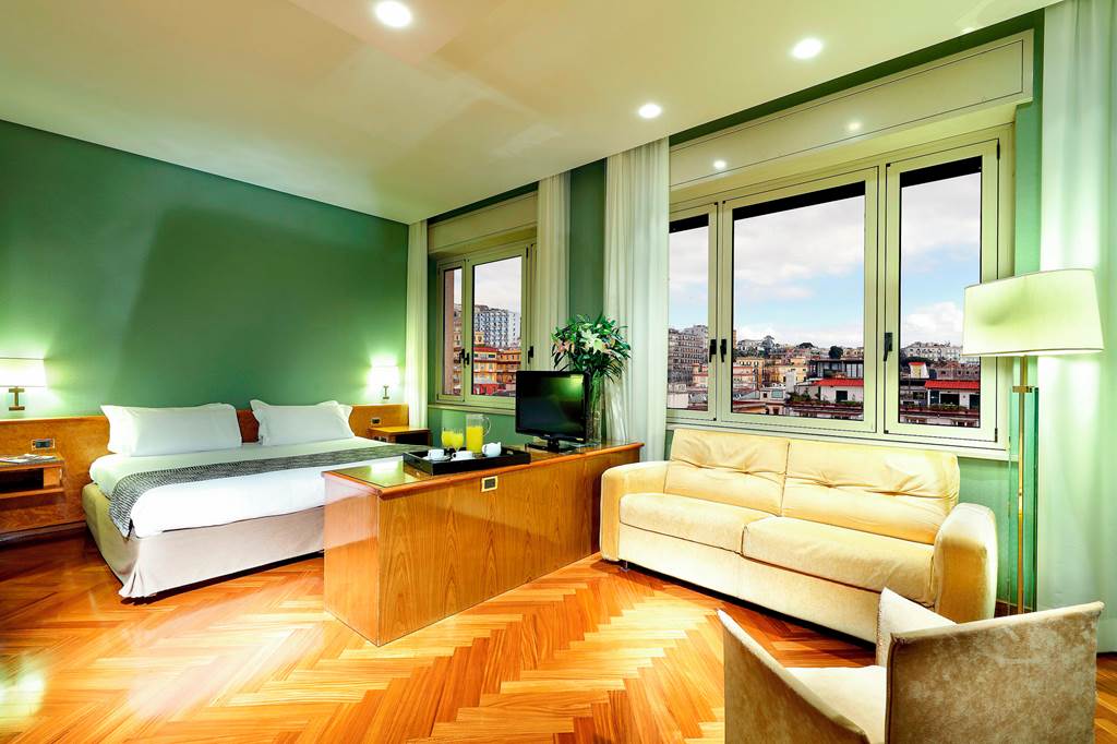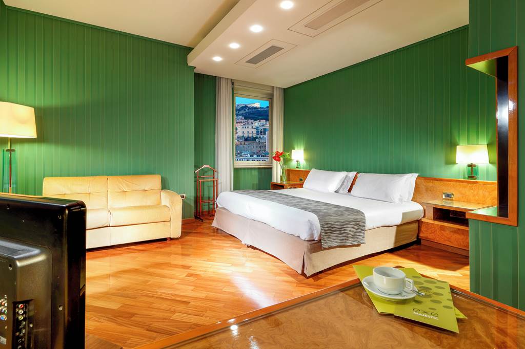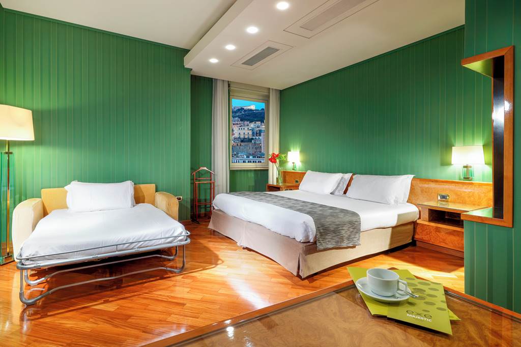 Looking for a comfortable and simple base to be able explore Naples to it?s full, choose to stay at Exec Majestic hotel. Located conveniently close to Theatre San Carlo and a short metro ride to Centro Storico a UNESCO world heritage site, where on foot you can explore a maze of tiny streets, packed with shops and buildings of distinctive character. When you return to Exe Majestic you?ll find comfortable rooms to kick back and relax ready for another day of exploration in Naples.Standard Double rooms sleep up to 2 adults and have a bathroom containing a bath or shower, air conditioning, hairdryer, minibar*, flat screen television and safety deposit box. Room upgrade options and Sole Use rooms are also available.