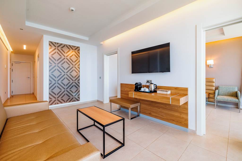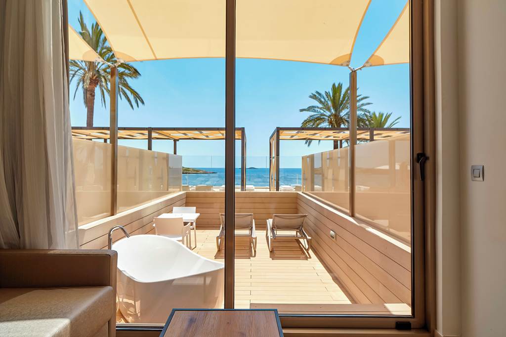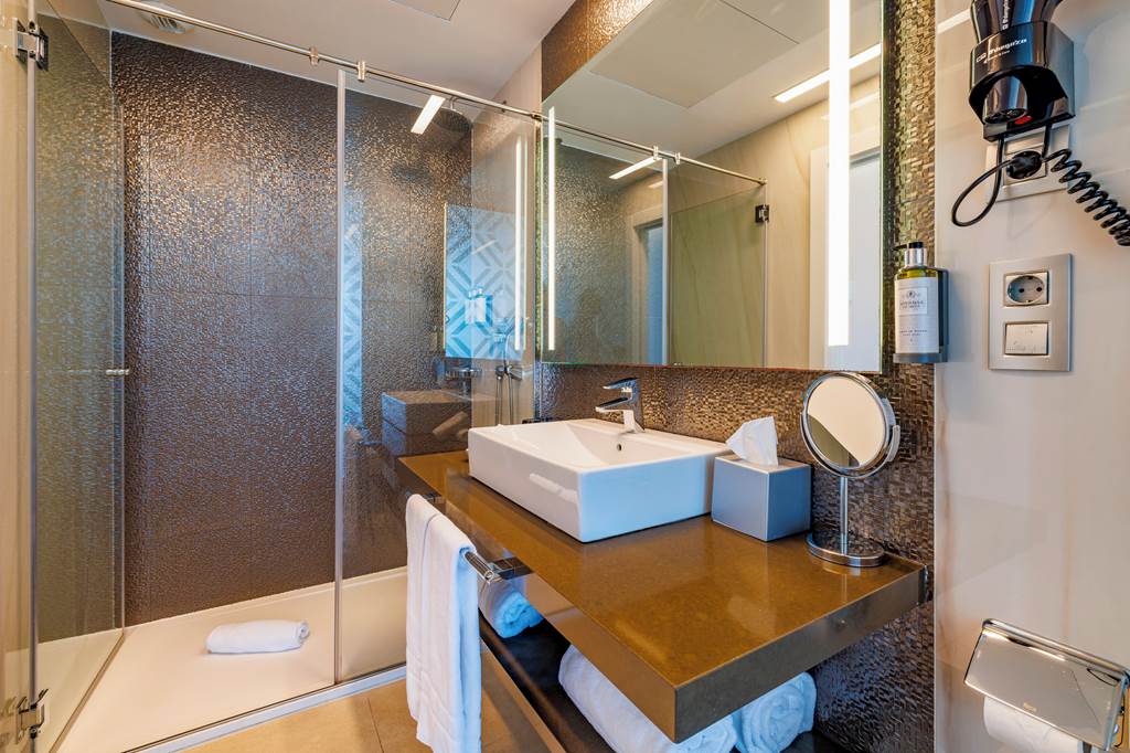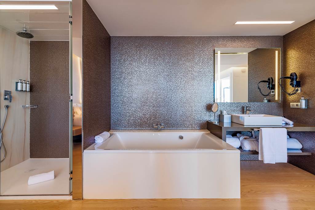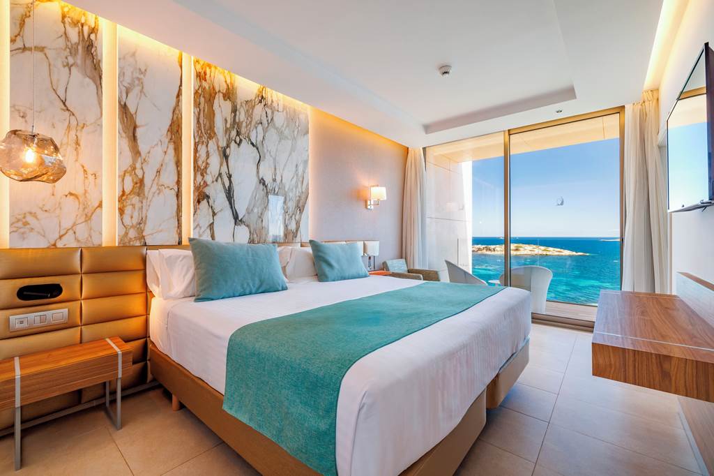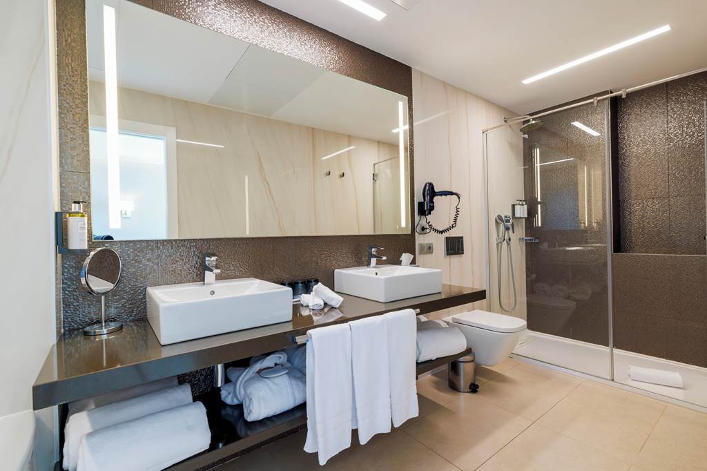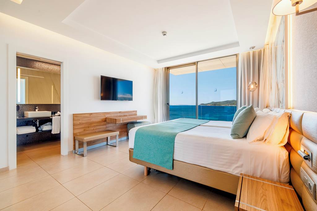 Twin rooms sleep up to 2 adults and have a bathroom with shower, hairdryer, air conditioning, flat screen television, mini-bar* and balcony or terrace. Twin Sea View rooms, Superior Side Sea View rooms, Twin rooms for Sole Use and Half Board are also available. Superior rooms have the same facilities as the twin room plus a mini-fridge with water and soft drinks on arrival.