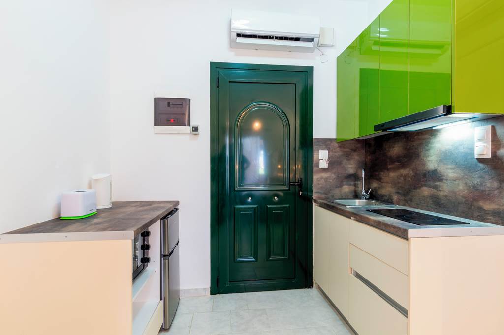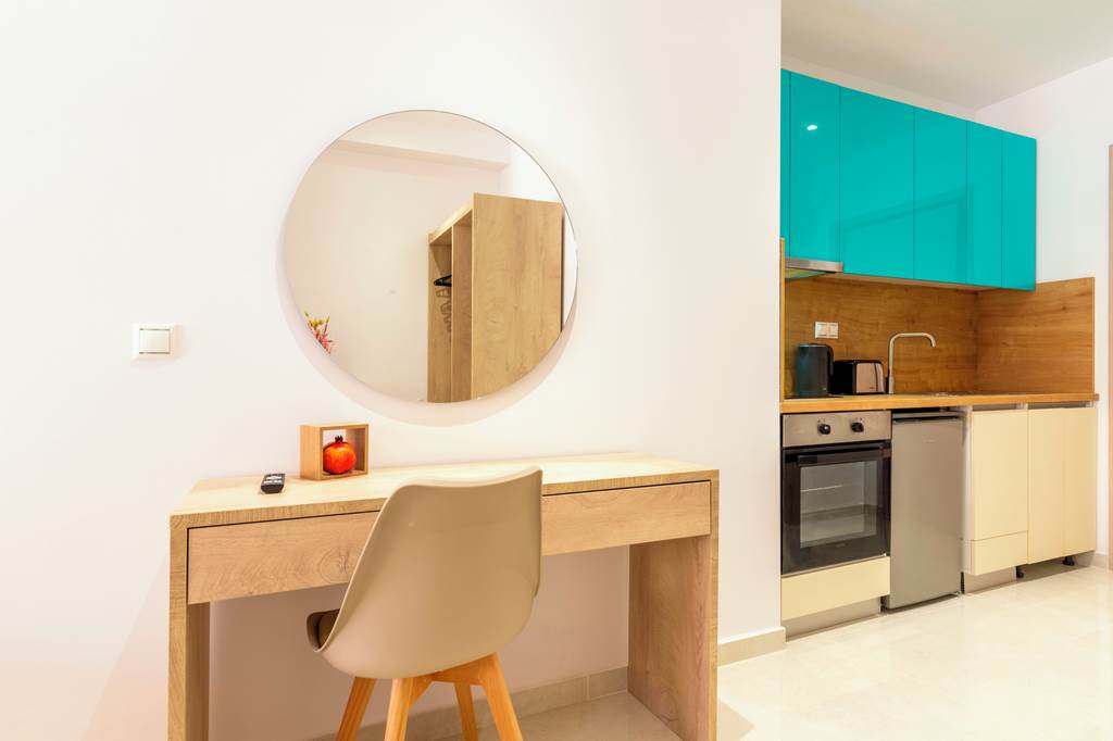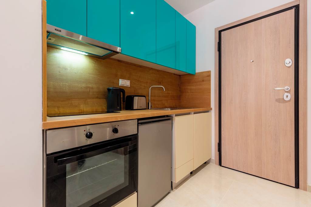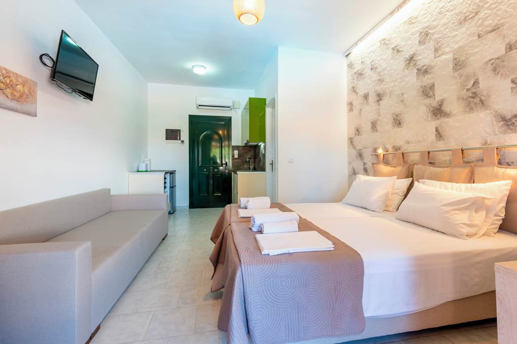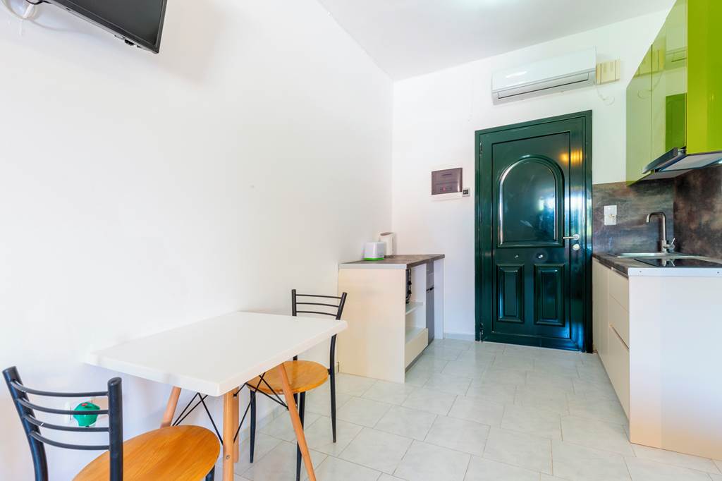 Studios sleep up to 2 adults and 1 child and have bathroom containing a shower, air conditioning* (01 May-31 Oct), hairdryer, television, double cooking rings, fridge, kettle, oven and balcony or terrace.