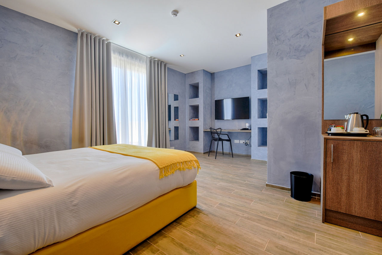 Located in the Xewkija village square with its renowned Baroque architecture, the Quaint Boutique Hotel Xewkija is a great choice for your stay in Gozo. Rooms are contemporary in design and come with all the amenities needed for an enjoyable stay. The hotel also houses an excellent restaurants offering Mediterranean and Chinese cuisine, as well as an ? la carte breakfast option. Public transport links are nearby, meaning it's easy to explore this wonderful resort and all its culture.Standard Comfort rooms sleep up to 3 adults and have bathroom containing a shower, air conditioning, flat screen television, hairdryer, fridge, tea and coffee making facilities, iron and ironing board and balcony. Deluxe suites sleeping up to 3 adults, Superior Penthouse suites sleeping 2 adults and Sole Use rooms are also available.