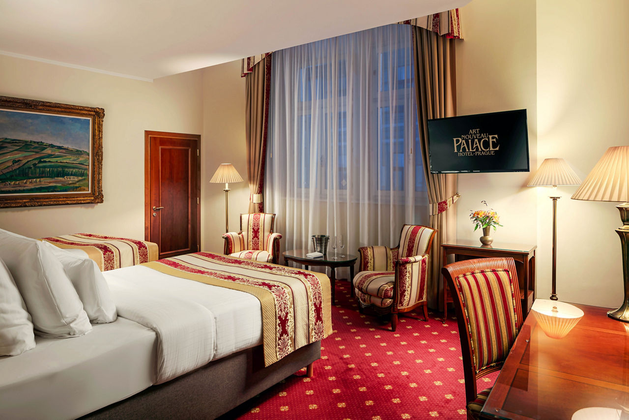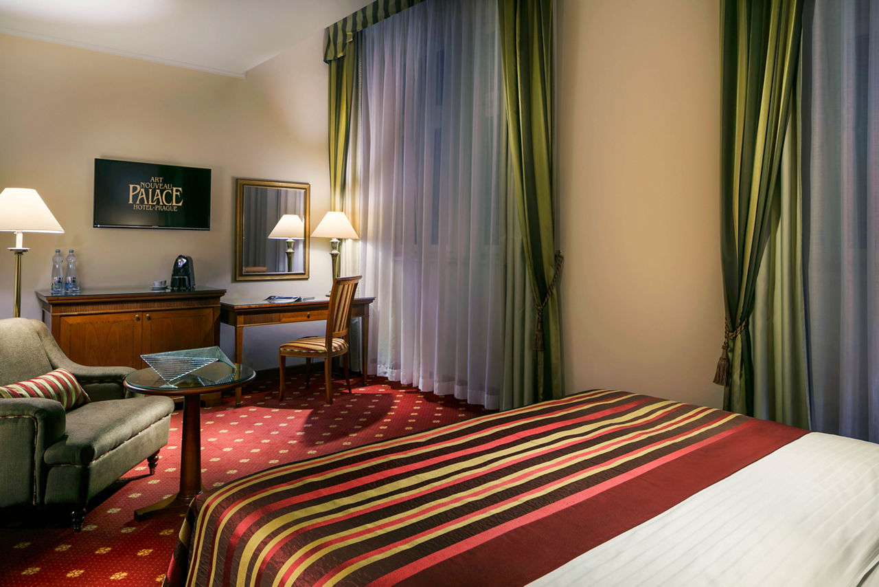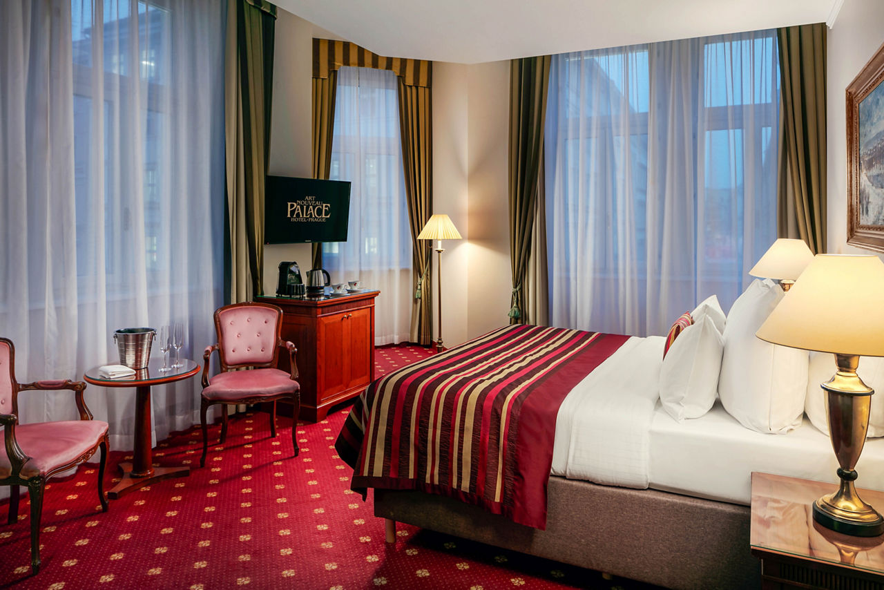 The Art Nouveau Palace Hotel offers quality accommodation in a desirable position on the edge of the Old and New Town in the very heart of Prague. A hotel since 1909, this landmark building retains many of its original fittings and is just a few steps from Wenceslas Square, Old Town Square, shopping areas and the State Opera. This hotel is perfect for guests in search of a central, upmarket establishment brimming with local charm and character.Deluxe Double or Twin rooms sleep up to 3 adults and have bathroom containing a bath or shower, air conditioning (Apr-Oct), hairdryer, television, kettle, mini-bar and safety deposit box. Executive Double or Twin rooms are also available.
