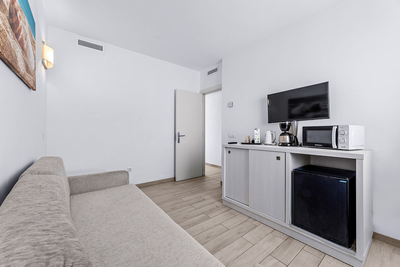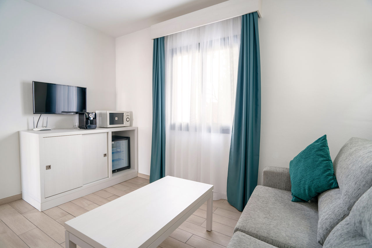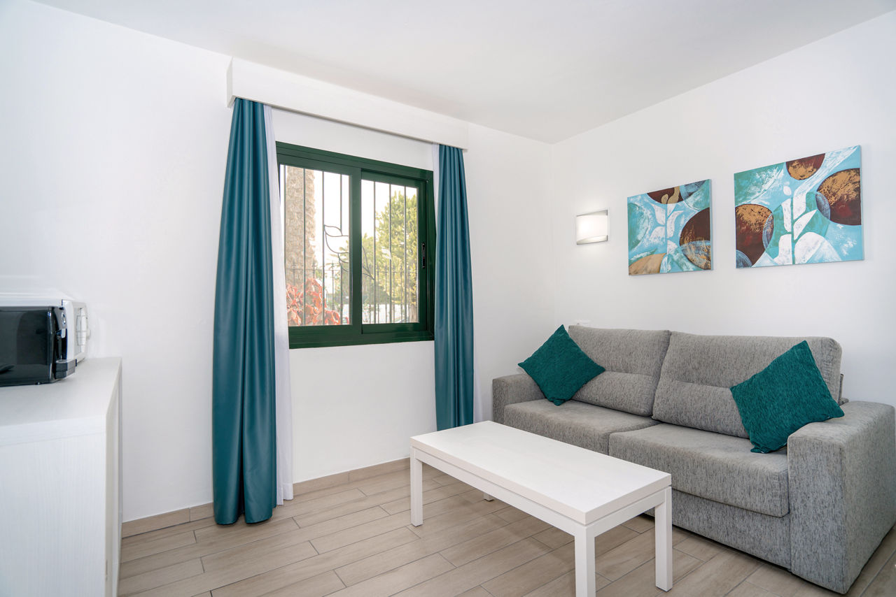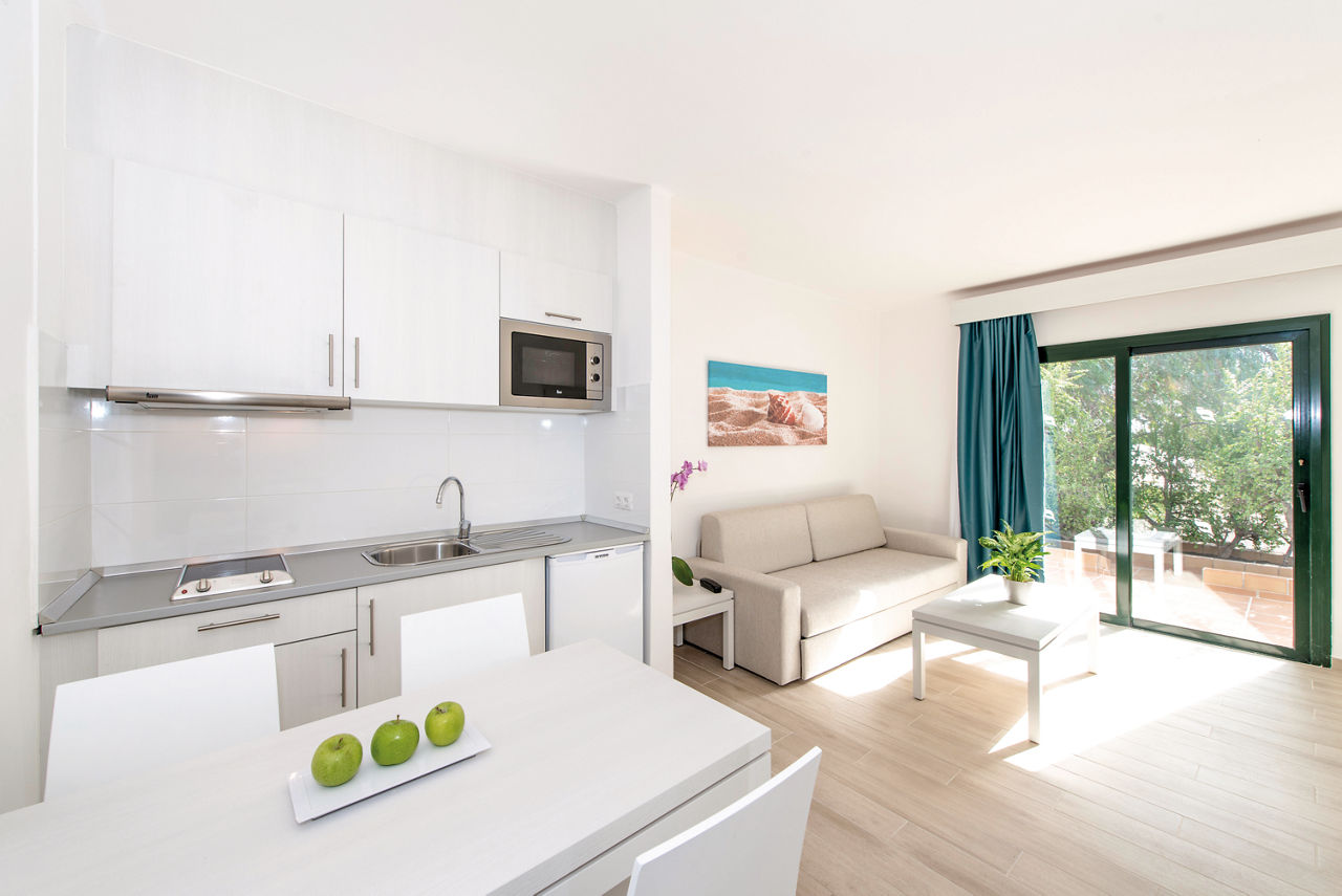Studios sleep up to 2 adults and have full bathroom, satellite TV, kitchen with microwave and balcony. One bedroom apartments sleeping up to 3 adults and Two bedroom apartments sleeping up to 5 adults are also available. Each apartment features twin beds, lounge area (One bedroom apartments only) bathroom, kitchenette (2 electric rings, microwave, toaster, kettle), Wi-Fi*, TV* and balcony or terrace. Cots are also available but may reduce the number of people that can fit in to a room.