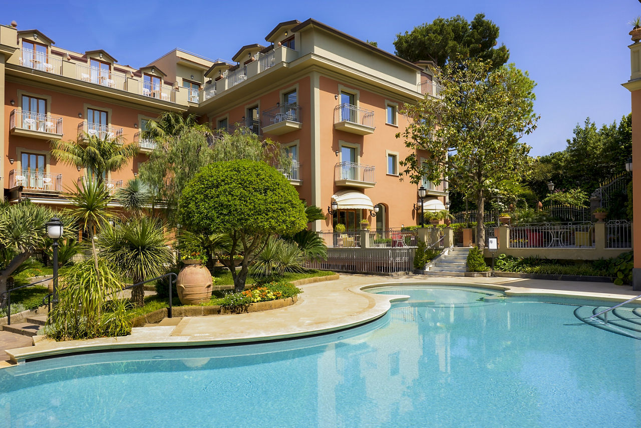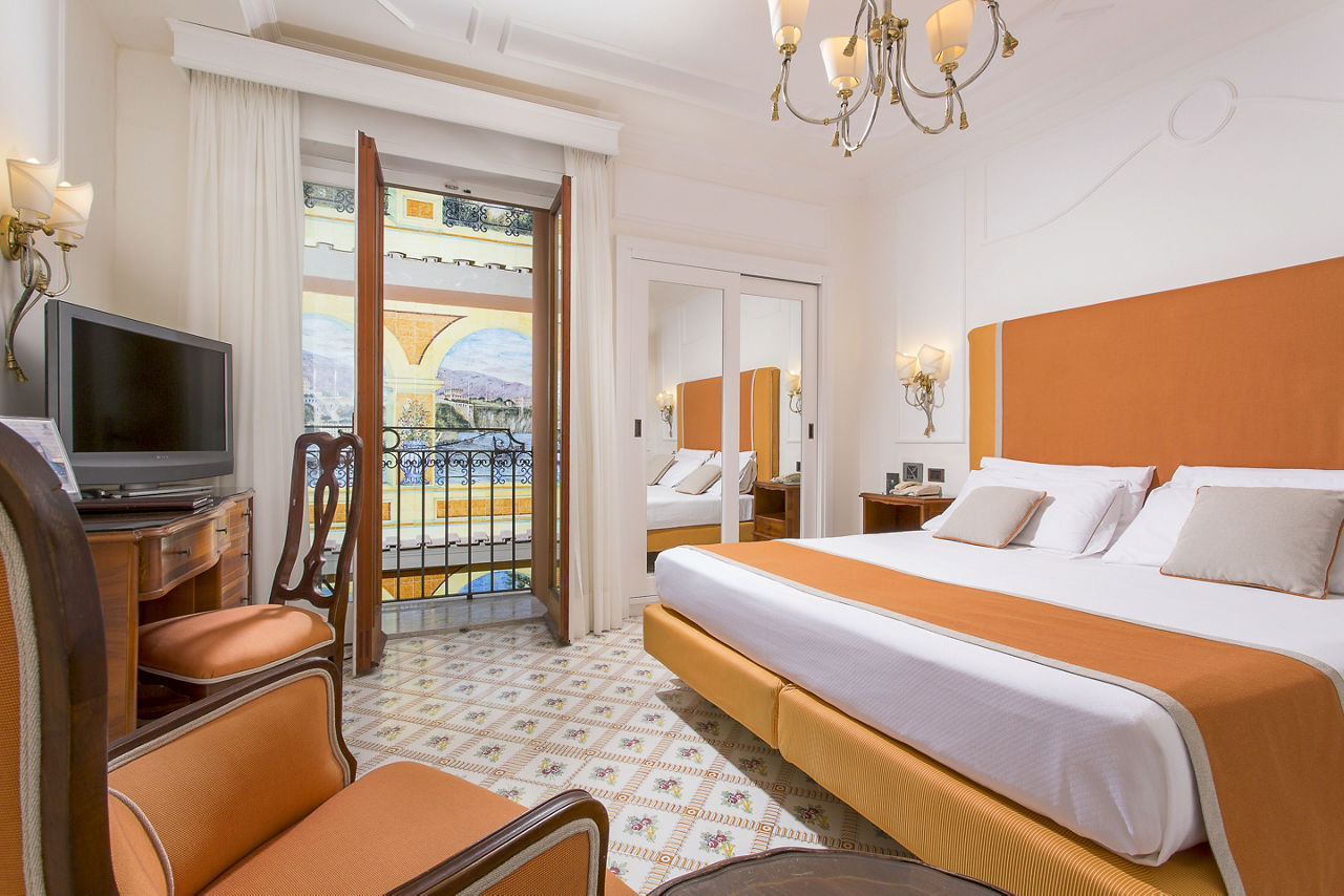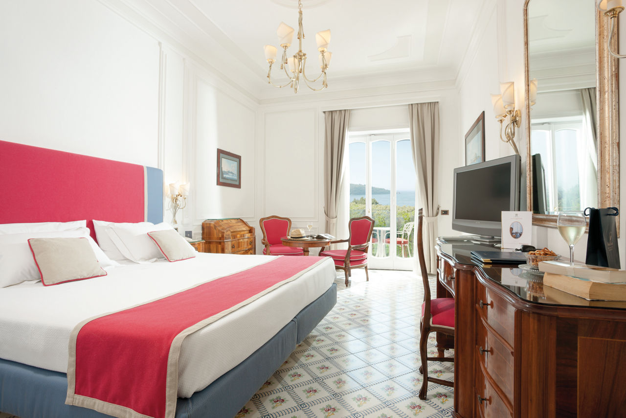 With its prime clifftop location, the Grand Hotel Ambasciatori offers stunning views over the Mediterranean Sea, with the picturesque Bay of Naples and Mount Vesuvius in sight. Surrounded by orange and lemon trees, the hotel is also located in a pretty subtropical park. At the bottom of the cliff, there is a remote beach area which can be accessed via a lift in the summer months. The rooms are stylish, yet laced with traditional Italian charm. You will be spoilt here with the facilities on offer, including a pool with hydro massage jets, a lunchtime grill bar and a restaurant serving buffet breakfast and a la carte dinner.Double or Twin rooms with Side Sea View sleep up to 3 and have bathroom containing a bath with shower attachment, air conditioning (15 May - 15 Oct), minibar*, kettle, hairdryer, flat screen television, safety deposit box and balcony or terrace. Room upgrade options are also available.