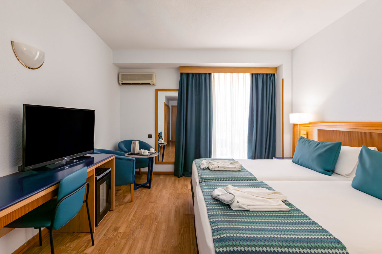 Double rooms sleep up to 3 adults or 2 adults and 1 child and have air-conditioning, satellite TV, hairdryer and full bathroom. Balcony rooms are also available at a supplement.