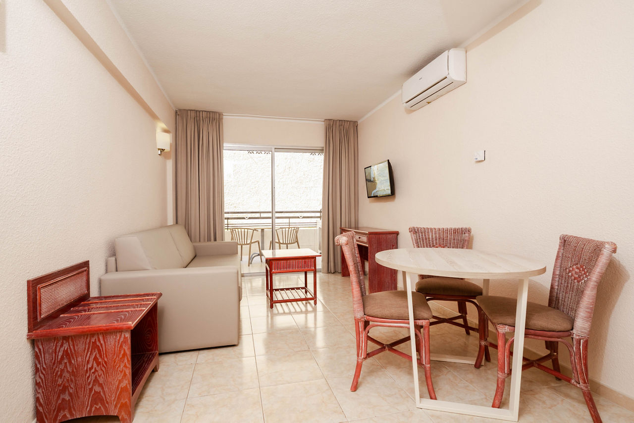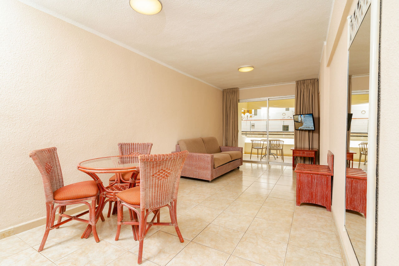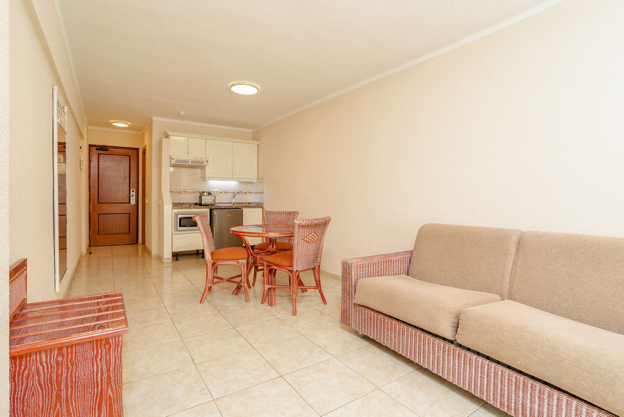 Studio rooms sleeping 2 adults have bathroom with bath/shower, fully equipped kitchen with fridge, satellite TV, telephone and a balcony. One bedroom apartments are also available. Please note that Promo rooms are situated on lower level floors accessed via stairs and are without view.
