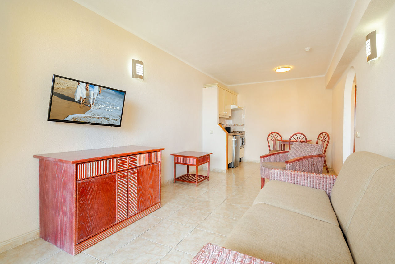 Welcome to HOVIMA Santa Maria Aparthotel, a brilliant by-the-beach base. Between the spacious pool area and bright studios and apartments, you?ll have plenty of room to spread out and relax. And you can play things your way with the long list of board options! Everyone?s catered for here ? that?s thanks to the three pools, mini-disco and children?s club. Dining?s done buffet-style, and daily entertainment seals the deal with the fun factor. Up for a change of scenery? Trade in the on-site sports for a day exploring locally or chilling on the nearby beach.Studio rooms sleeping 2 adults have bathroom with bath/shower, fully equipped kitchen with fridge, satellite TV, telephone and a balcony. One bedroom apartments are also available. Please note that Promo rooms are situated on lower level floors accessed via stairs and are without view.