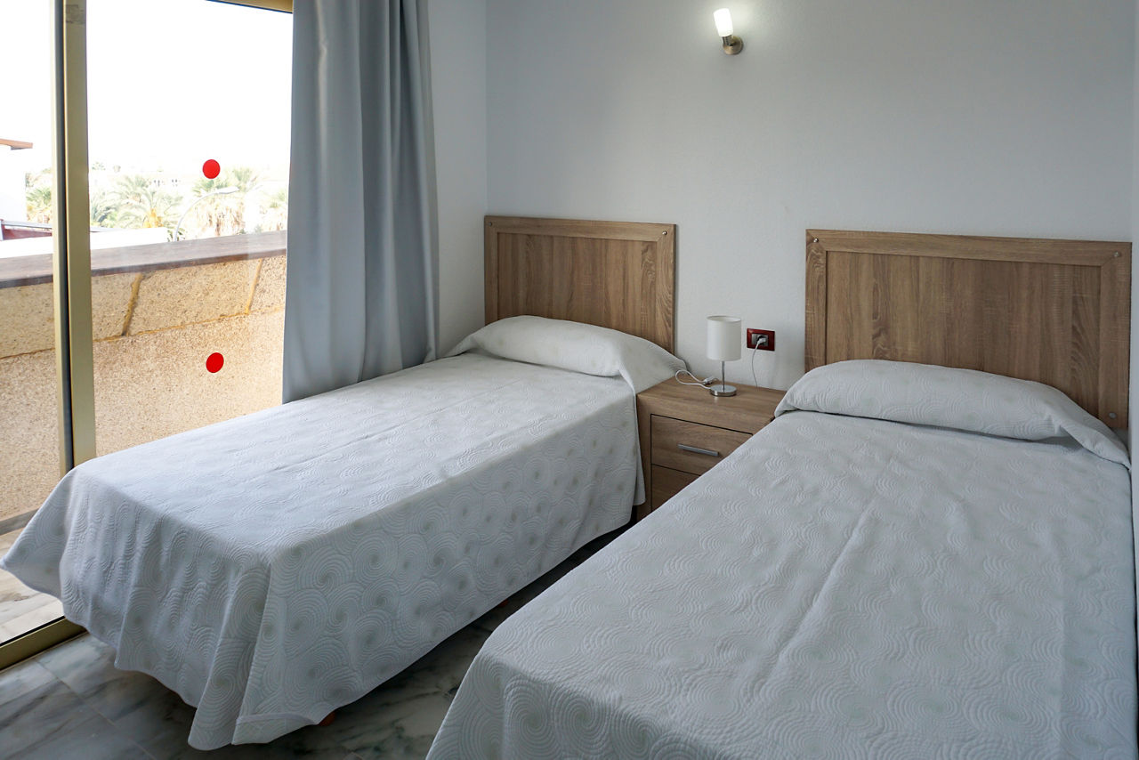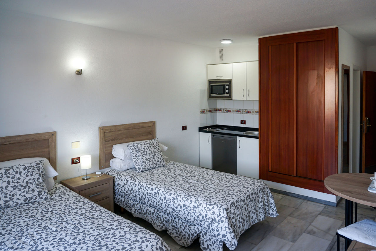 Studios sleep 2 adults with twin beds (studios will sleep up to 3 adults from 01 May 2014), cot space, shower, kitchenette and balcony. One Bedroom apartments sleep up to 4 adults with twin beds and 2 extra beds in the lounge, cot space, bath or shower and a balcony or terrace. Two bedroom apartments sleep up to 5 adults and 1 child.