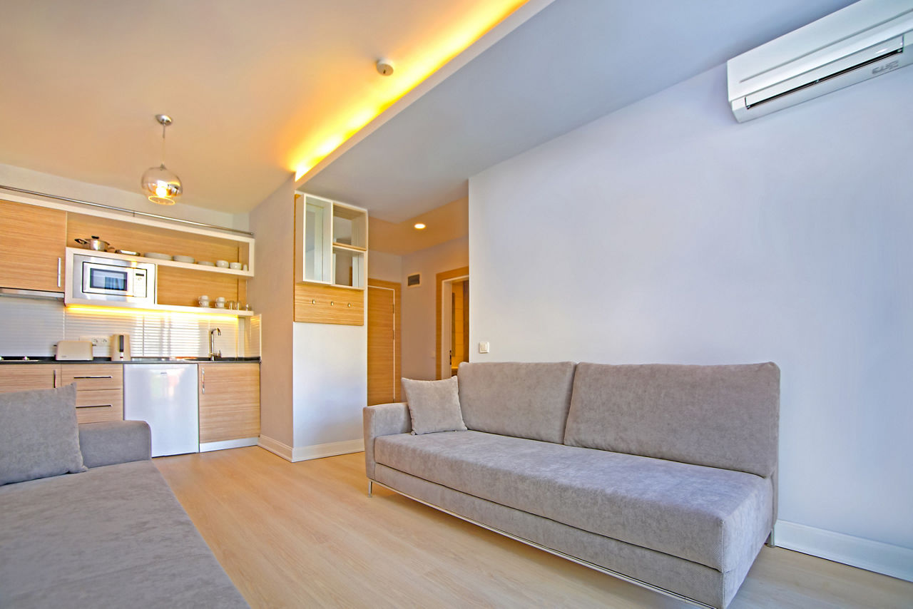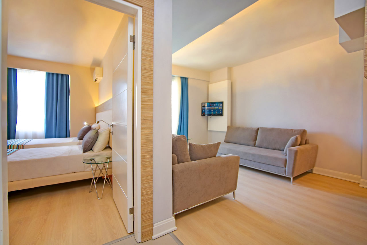 You'll get a warm welcome at Vega Green and fresh, modern apartments with everything you need for a relaxing stay. Both the bustling Alanya resort centre with it's restaurants and bars and the fine white sands of Kleopatra beach are within walking distance. Or you can take the hotel's beach shuttle bus. Back at the apartments, you?ll find a lovely pool area with a couple of waterslides for the little ones, an al fresco restaurant and poolside bar. Look no further, you've found the perfect base for your Alanya getaway with a range of board options to suit your holiday style.One bedroom apartments sleep up to 4 adults or 2 adults and 2 children and have a bathroom containing a shower, air conditioning*, hairdryer, safety deposit box*, television, kitchenette with 2 cooking rings, fridge, kettle, toaster and microwave and balcony.