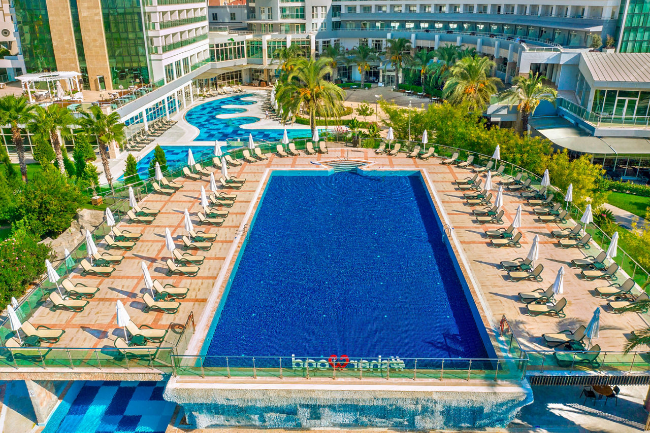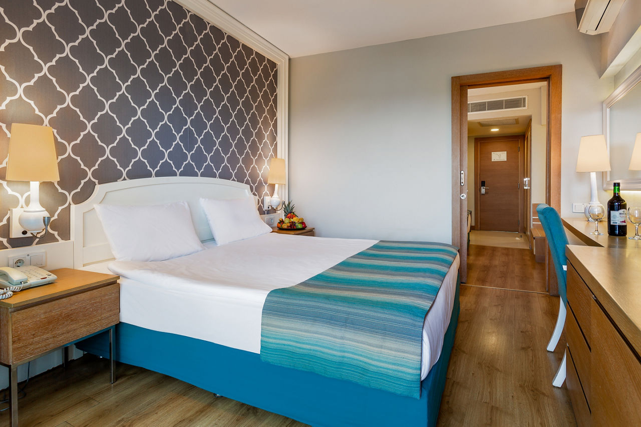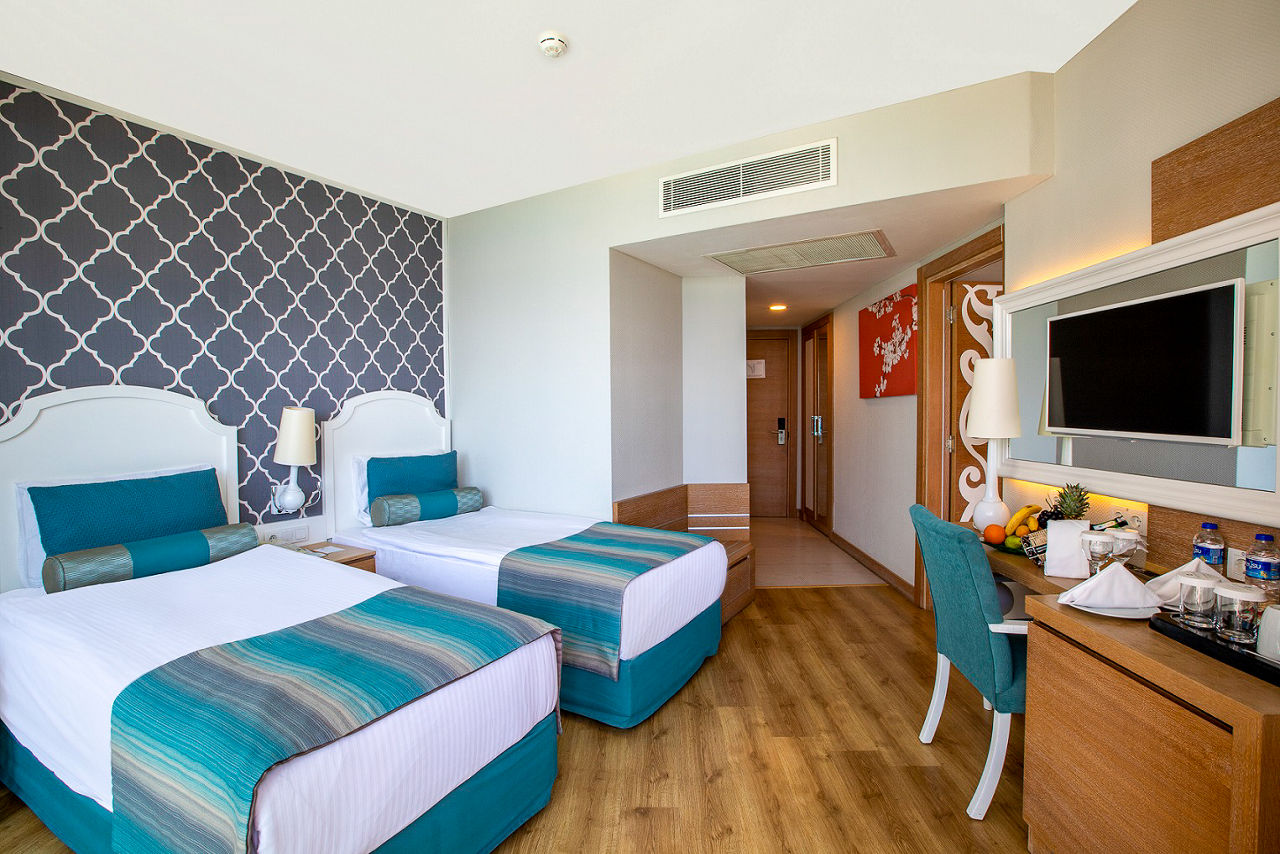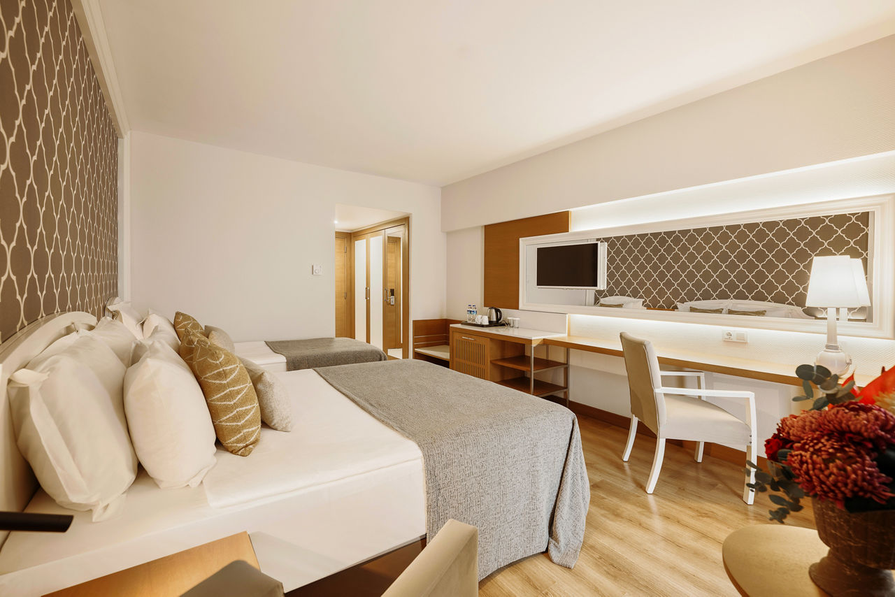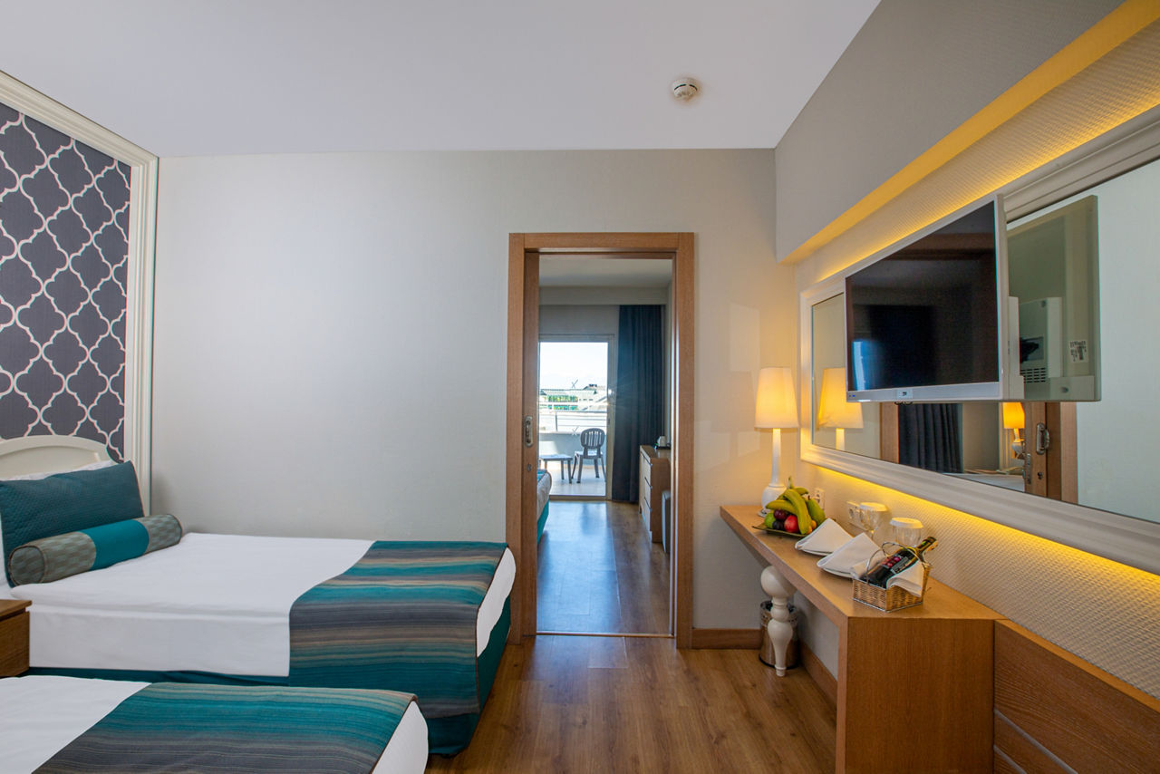 At Sherwood Exclusive Lara, you'll find six outdoor pools and an aqua park to enjoy under the sun, along with a bowling alley, a tranquil spa and a lively evening entertainment programme with the likes of karaoke and cabaret. There?s truly something for everyone! When it comes to dining and drinking, it?s hard to beat. With multiple restaurants and bars, there really is something to suit every taste. For those keen to explore, you?ll be perfectly situated to venture out so why not head to the private seafront or stroll through the vibrant resort of Lara Beach.Standard Double or Twin rooms with Land View sleep up to 3 adults or 2 adults and 1 child and have a bathroom with shower, hairdryer, centrally controlled air conditioning, flat screen satellite TV, tea and coffee making facilities, mini-bar restocked daily with soft drinks and beer and balcony. Standard Double or Twin rooms with Land View for Sole Use, Standard Double or Twin rooms with Side Sea View and Standard Double or Twin rooms with Sea View are also available. Family rooms sleeping up to 4 adults or 2 adults and 2 children have two bedrooms with connecting doors, bathroom with shower and the same facilities as standard rooms, and are available on request. Junior Family rooms sleep up to 4 adults or 2 adults and 2 children and have the same facilities as standard rooms, and are also available on request.