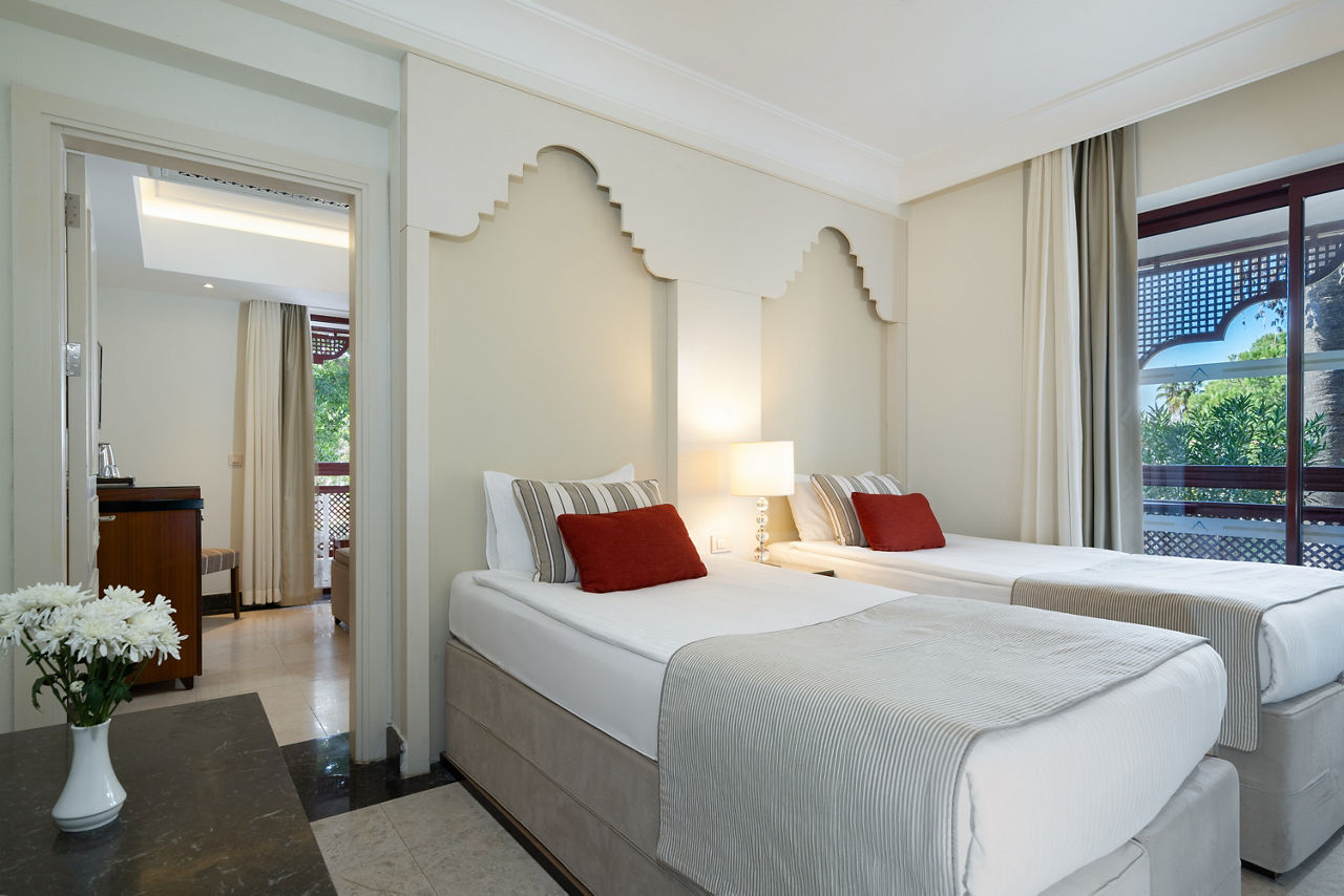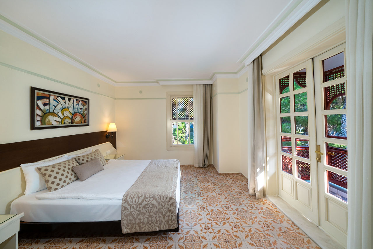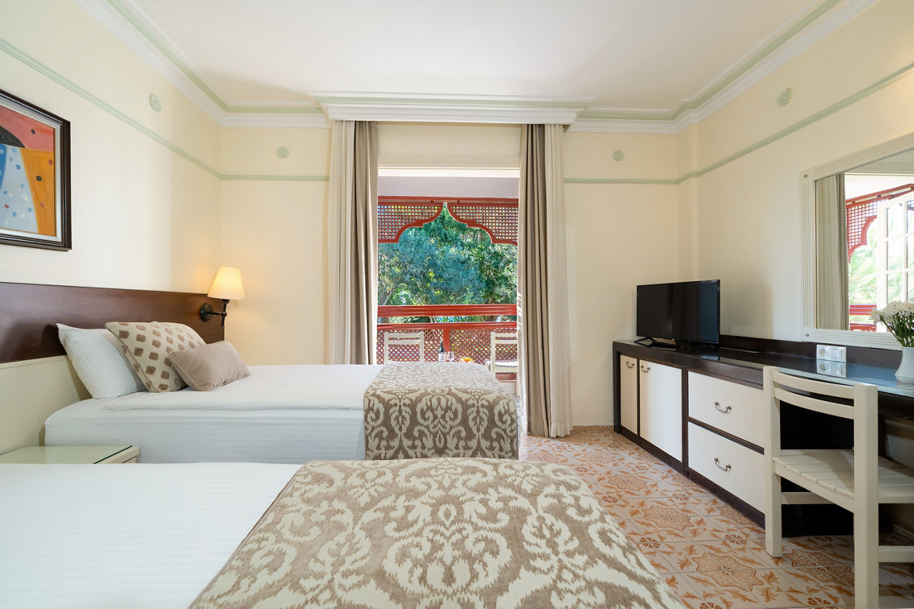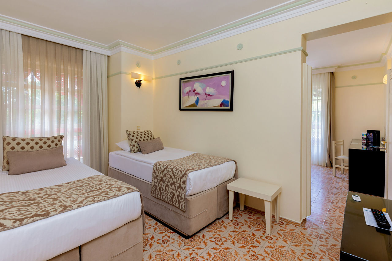 Spanning an expansive complex, the Ali Bey Park Manavgat is an impressive hotel resort with heaps of facilities and activities on-site. A holiday paradise for families with children of all ages, the hotel boasts its own huge aqua park with 25 slides, ranging from little splashes to a kamikaze and a freefall! If you like to keep active on holiday, there?s plenty on offer with a range of sports, an adventure park and a whopping 61 tennis courts - one of the world's largest tennis centres! If chilling is your thing, you are perfectly positioned right on the beach and there?s a relaxing spa on hand for all your pampering needs.Standard Double or Twin rooms sleep up to 3 adults and have bathroom containing a shower, air conditioning, hair dryer, flat screen television and balcony or terrace.