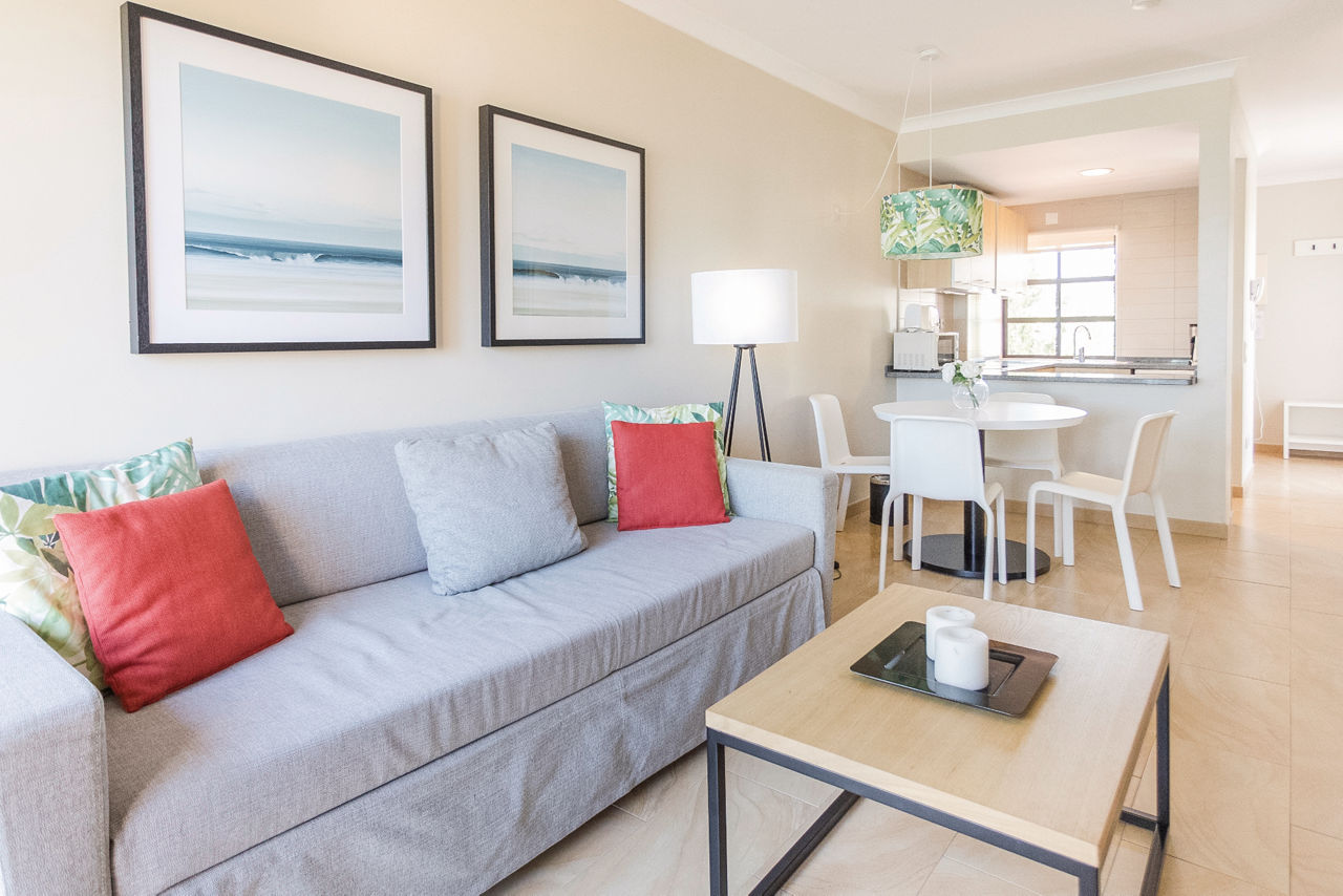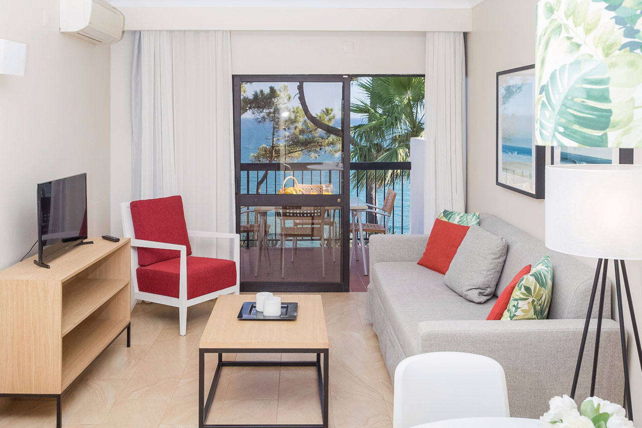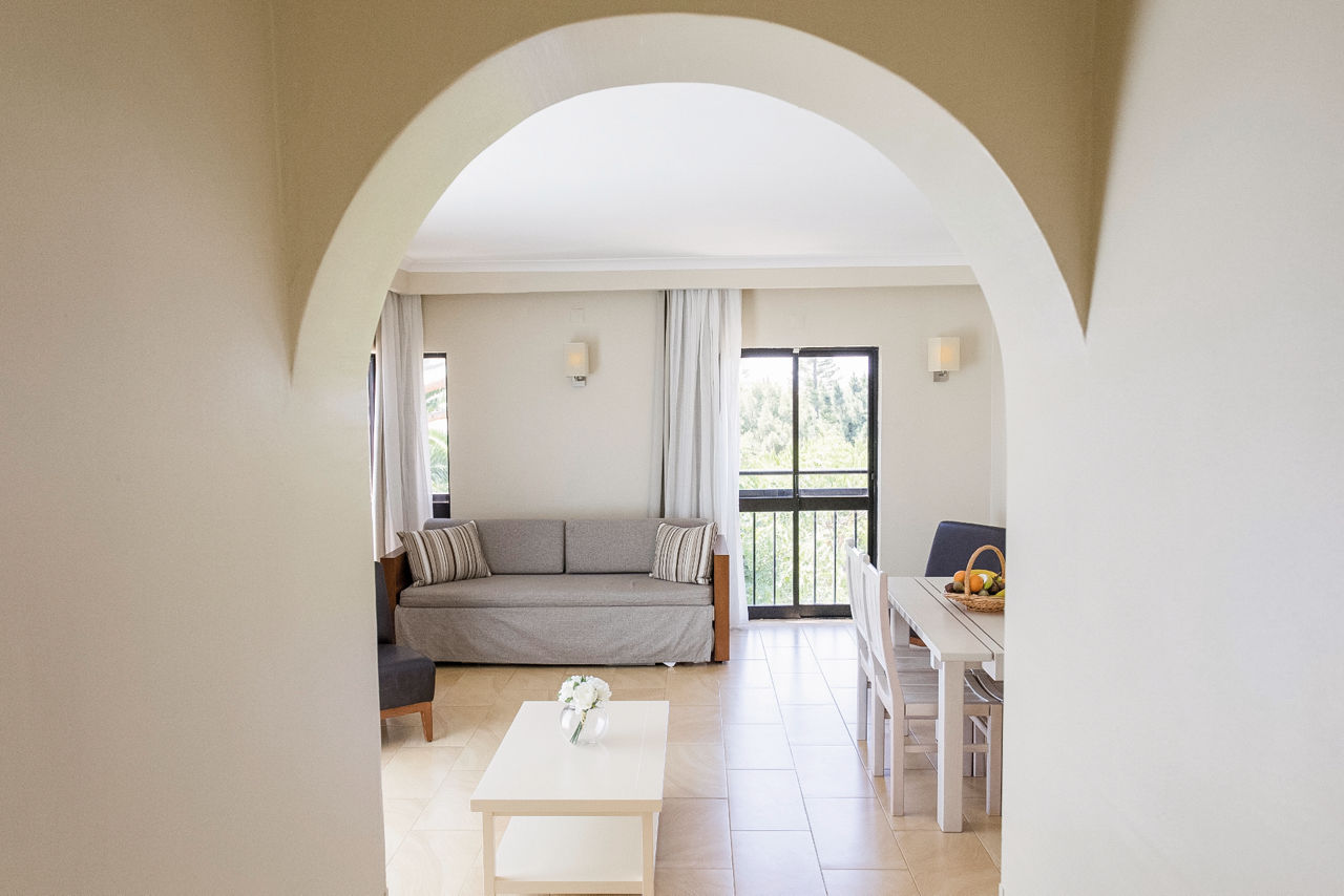 One Bedroom apartments with garden view sleep up to 4 adults. All apartments include bathroom/shower, living area with sofa, dining table and chairs, balcony/terrace, satellite TV and fully fitted kitchen with kettle, toaster, microwave or oven, fridge, 4 cooking rings and oven and ironing board . Sea View apartments and Two bedroom apartments are also available.