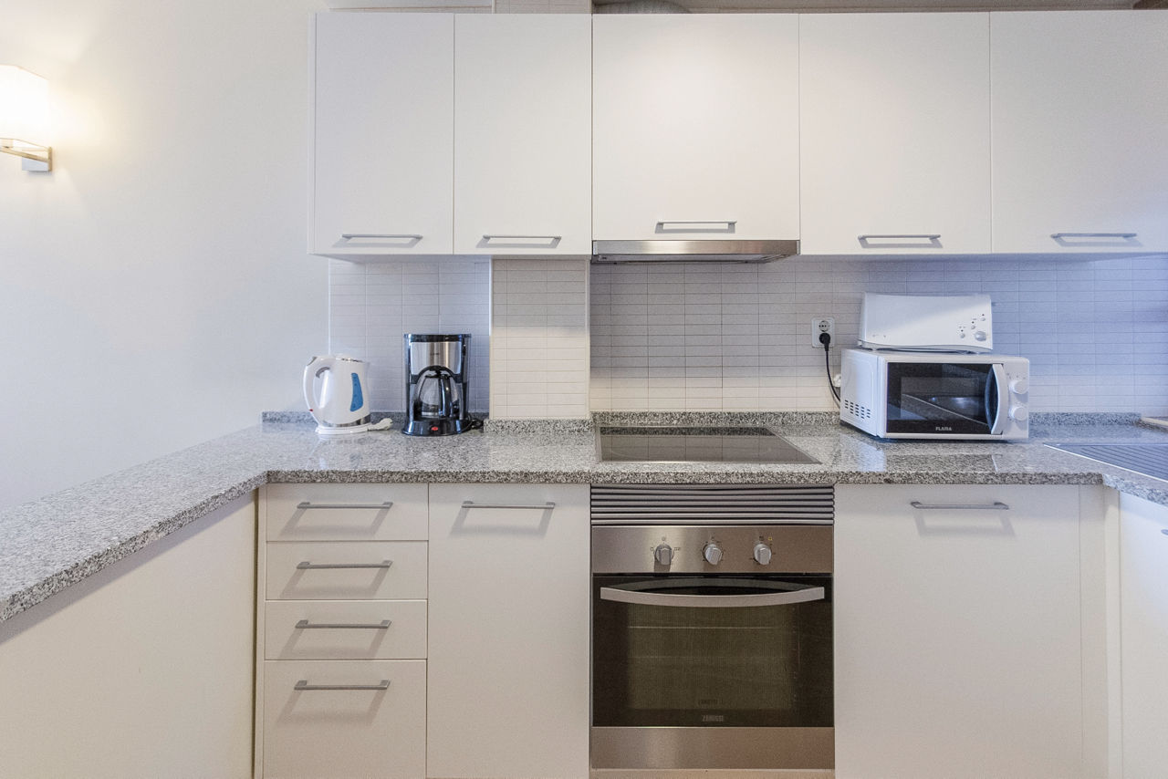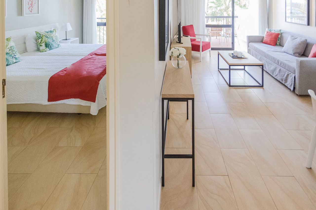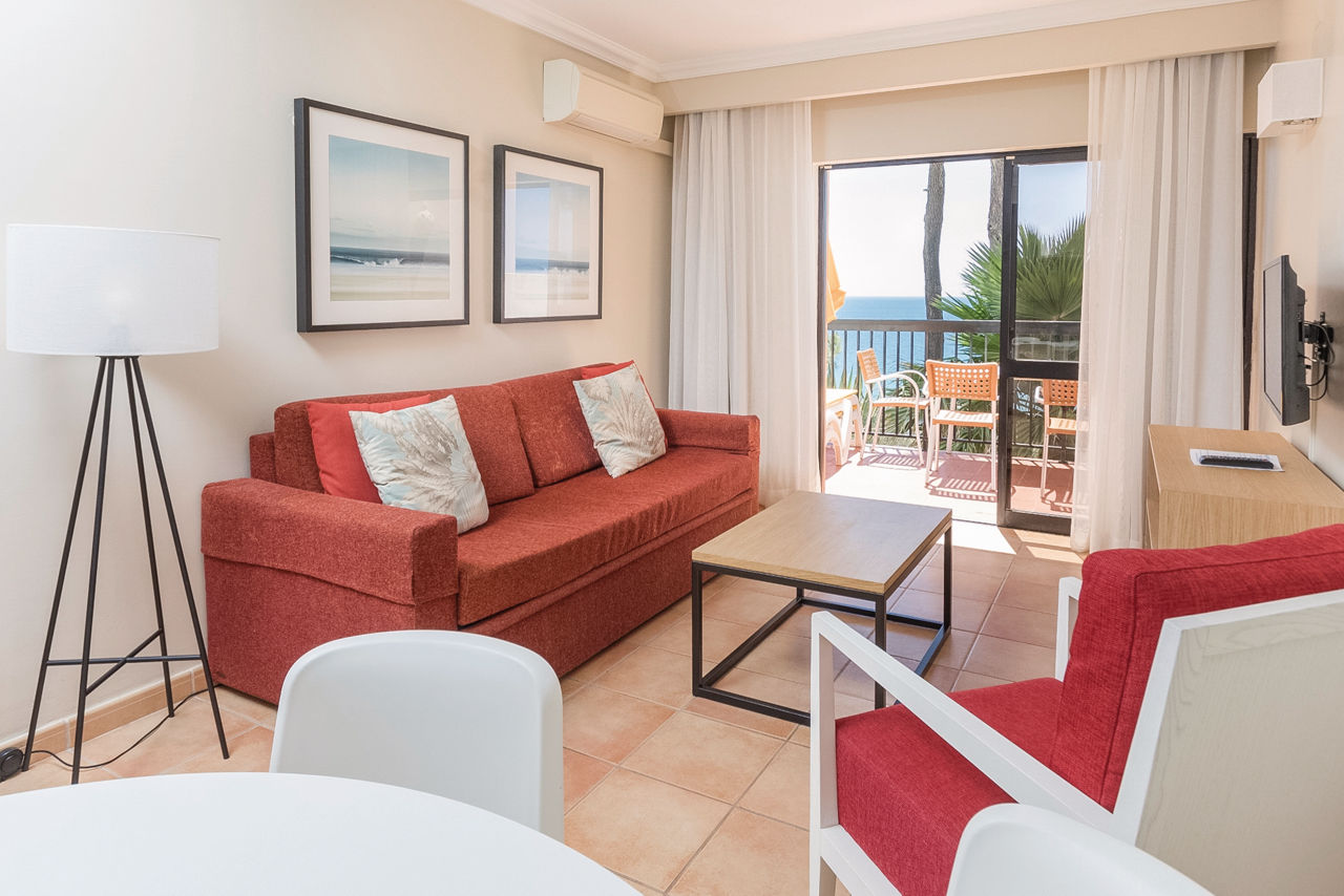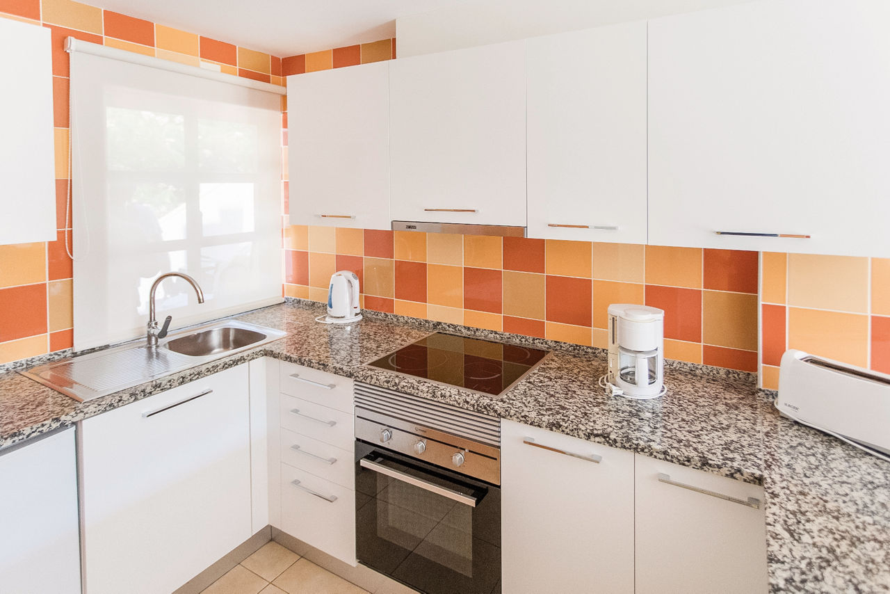 One Bedroom apartments with garden view sleep up to 4 adults. All apartments include bathroom/shower, living area with sofa, dining table and chairs, balcony/terrace, satellite TV and fully fitted kitchen with kettle, toaster, microwave or oven, fridge, 4 cooking rings and oven and ironing board . Sea View apartments and Two bedroom apartments are also available.