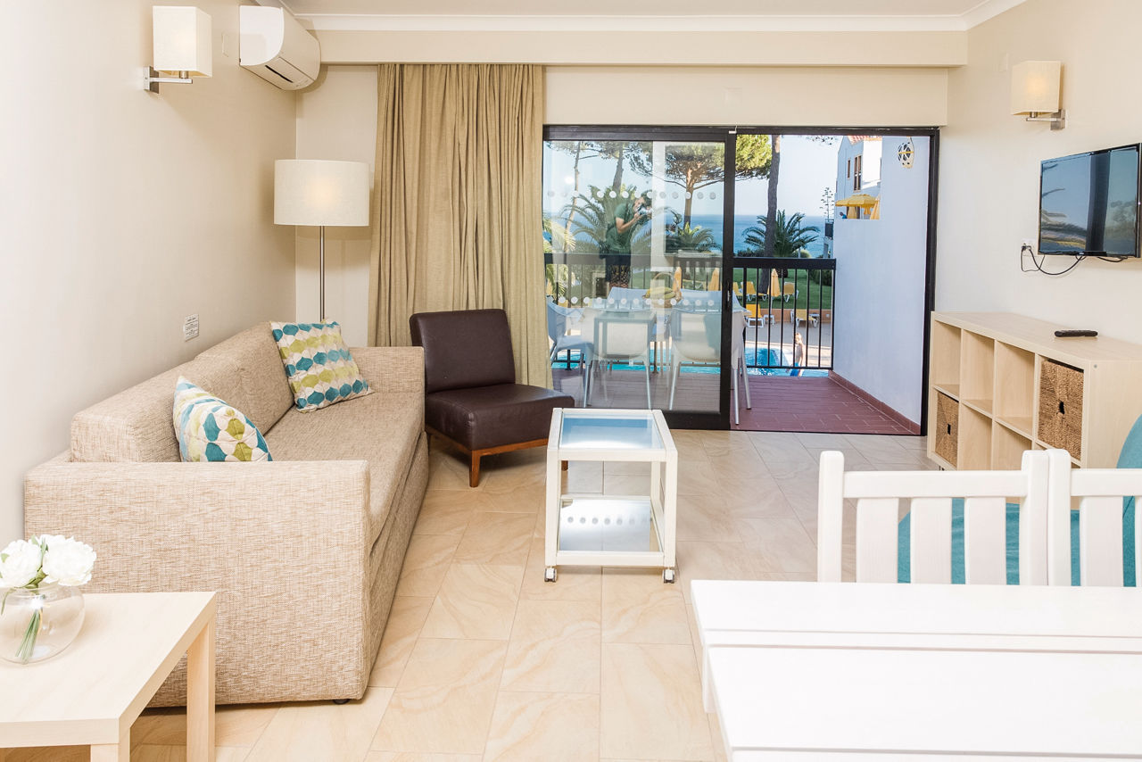 Perched on a clifftop, overlooking the glistening Atlantic Ocean is the Alfagar Village. Set in a protected area of natural beauty made up of eleven hectares of gardens, these apartments offer stunning panoramic views of the Algarvian coastline. Kids will love the fun-filled entertainment and aqua park to splash around in. Whilst the kids are occupied, soak up the sun around the pool or enjoy a relaxing lunch at the Bouganvilla Restaurant. Families love the Alfagar Village and you can too!One Bedroom apartments with garden view sleep up to 4 adults. All apartments include bathroom/shower, living area with sofa, dining table and chairs, balcony/terrace, satellite TV and fully fitted kitchen with kettle, toaster, microwave or oven, fridge, 4 cooking rings and oven and ironing board . Sea View apartments and Two bedroom apartments are also available.
