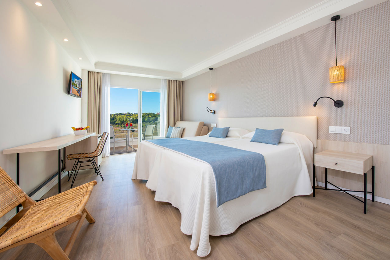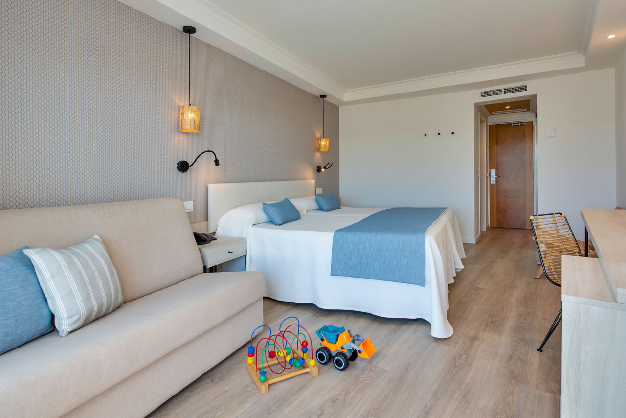 Twin/double rooms sleep up to 3 adults and have a bathroom, hairdryer, air conditioning, satellite TV, and balcony or terrace. Single rooms are also available at a supplement.