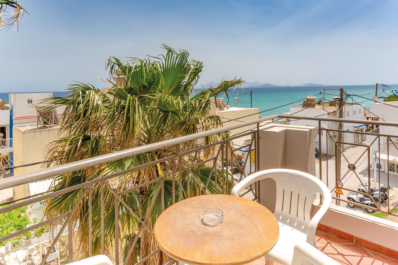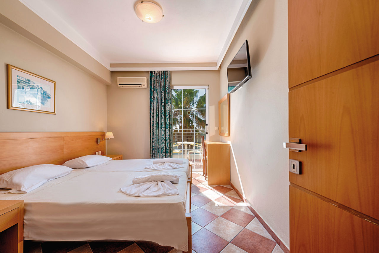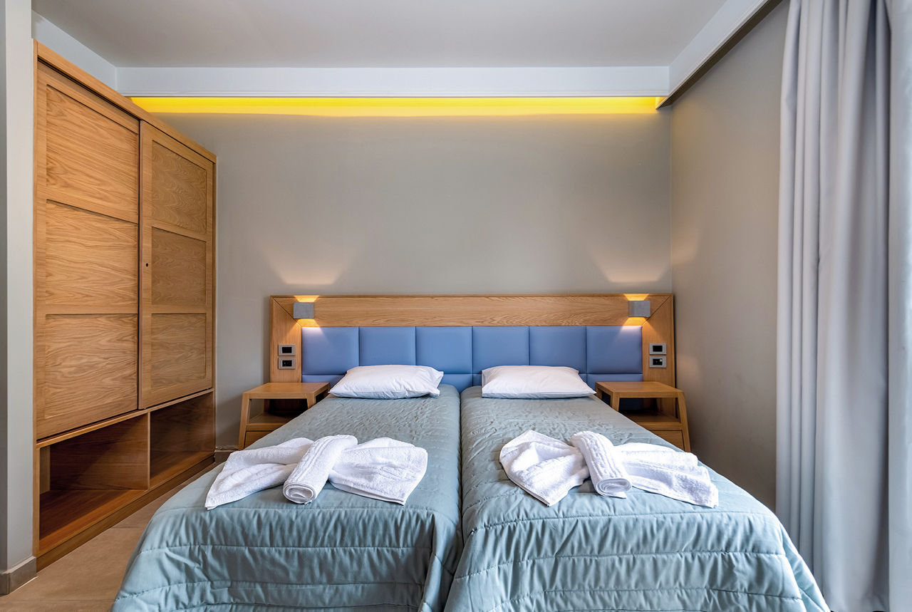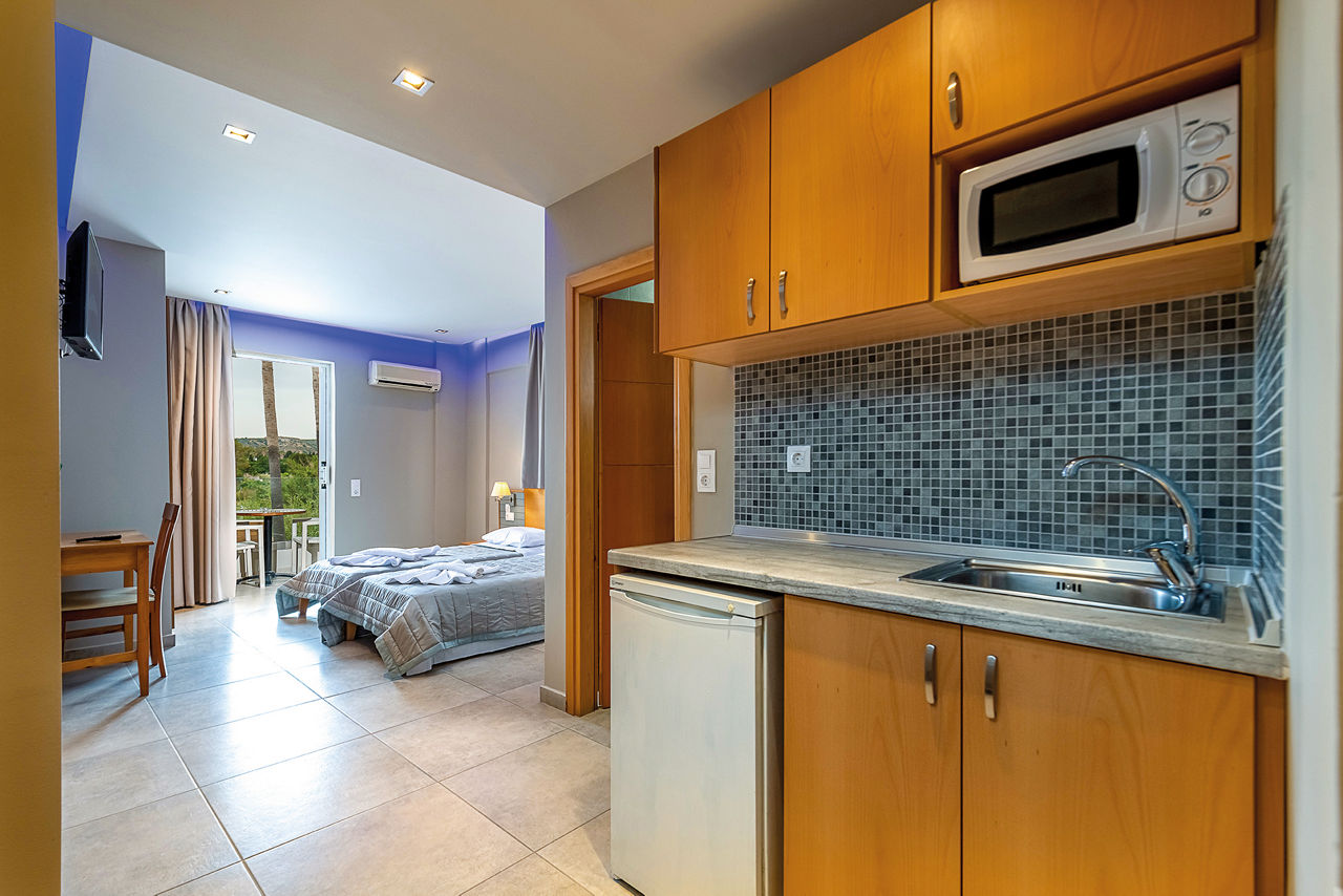 Studios sleep up to 2 adults have twin beds, bathroom with shower, air-conditioning, fridge and balcony or terrace. One bedroom apartments sleep up to 3 adults with twin beds plus sofa bed and kitchenette. Two bedroom apartments sleep up to 4 adults with four twin beds and kitchenette. Double rooms sleep up to 2 adults with mountain view, twin beds, bathroom with shower, air-conditioning, fridge, TV and balcony or terrace.