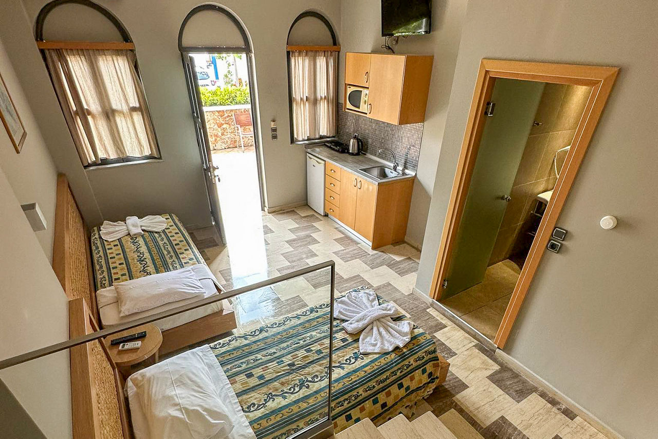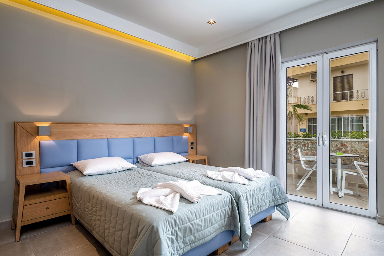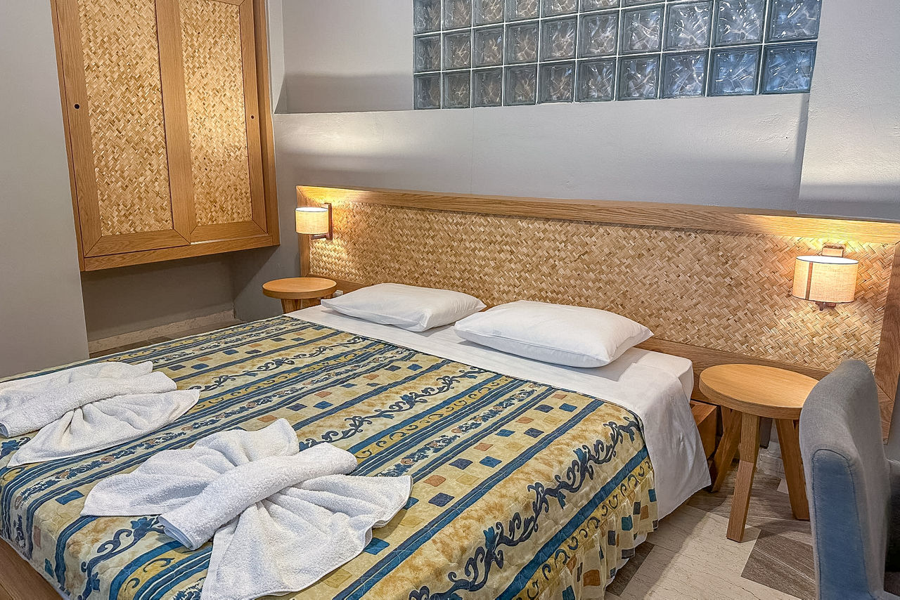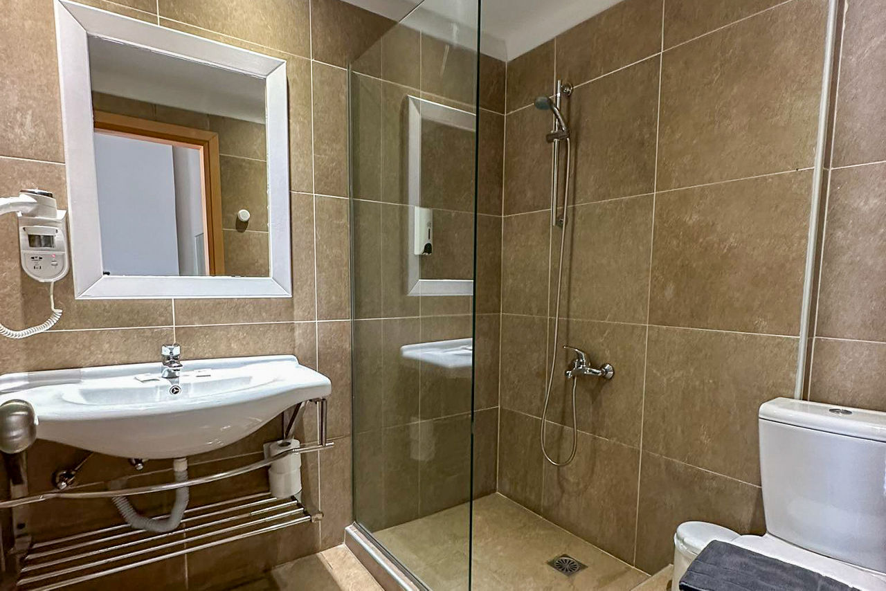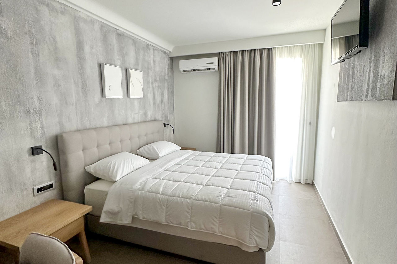 Studios sleep up to 2 adults have twin beds, bathroom with shower, air-conditioning, fridge and balcony or terrace. One bedroom apartments sleep up to 3 adults with twin beds plus sofa bed and kitchenette. Two bedroom apartments sleep up to 4 adults with four twin beds and kitchenette. Double rooms sleep up to 2 adults with mountain view, twin beds, bathroom with shower, air-conditioning, fridge, TV and balcony or terrace.
