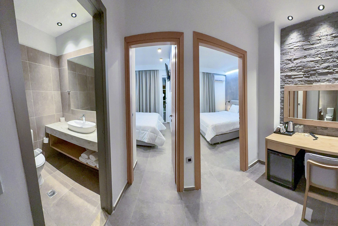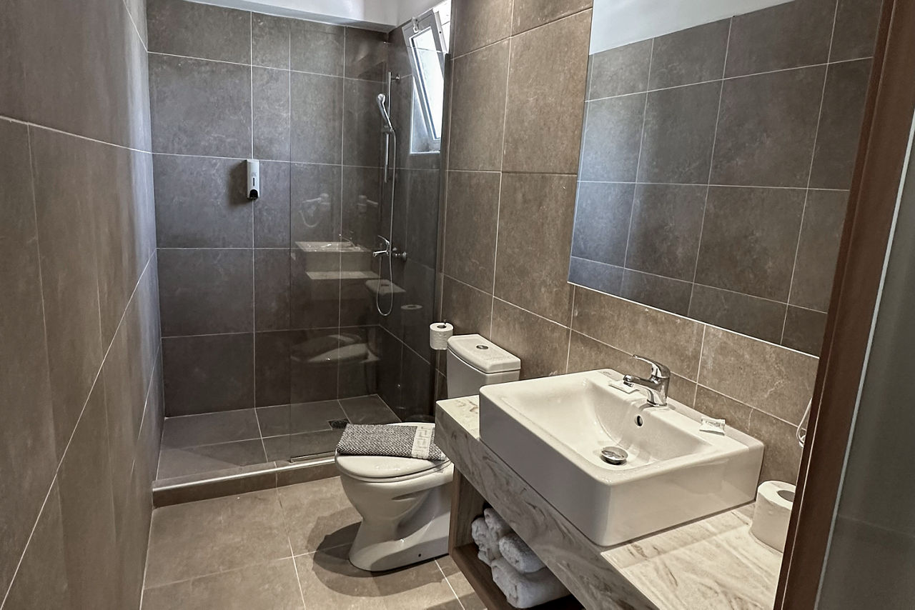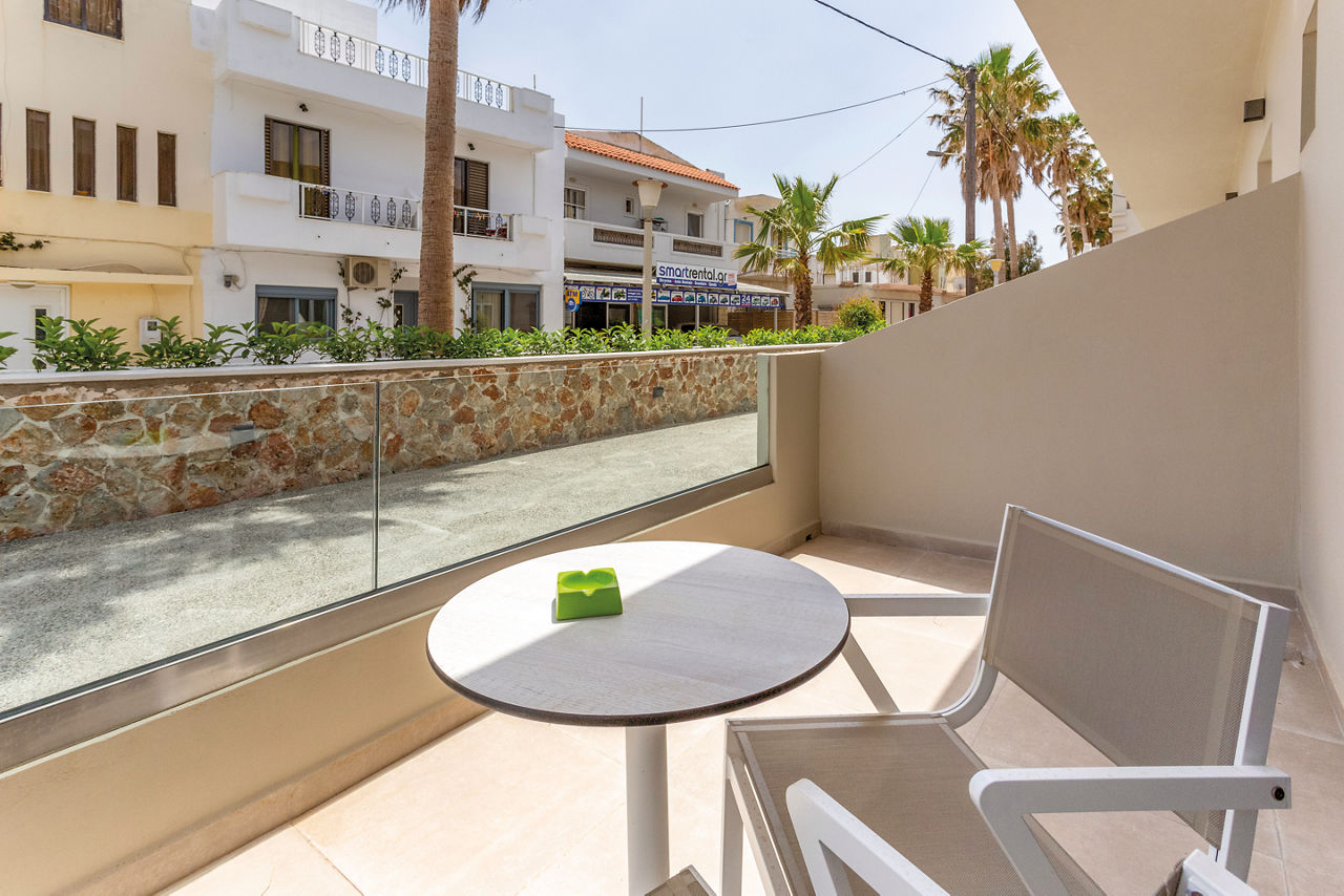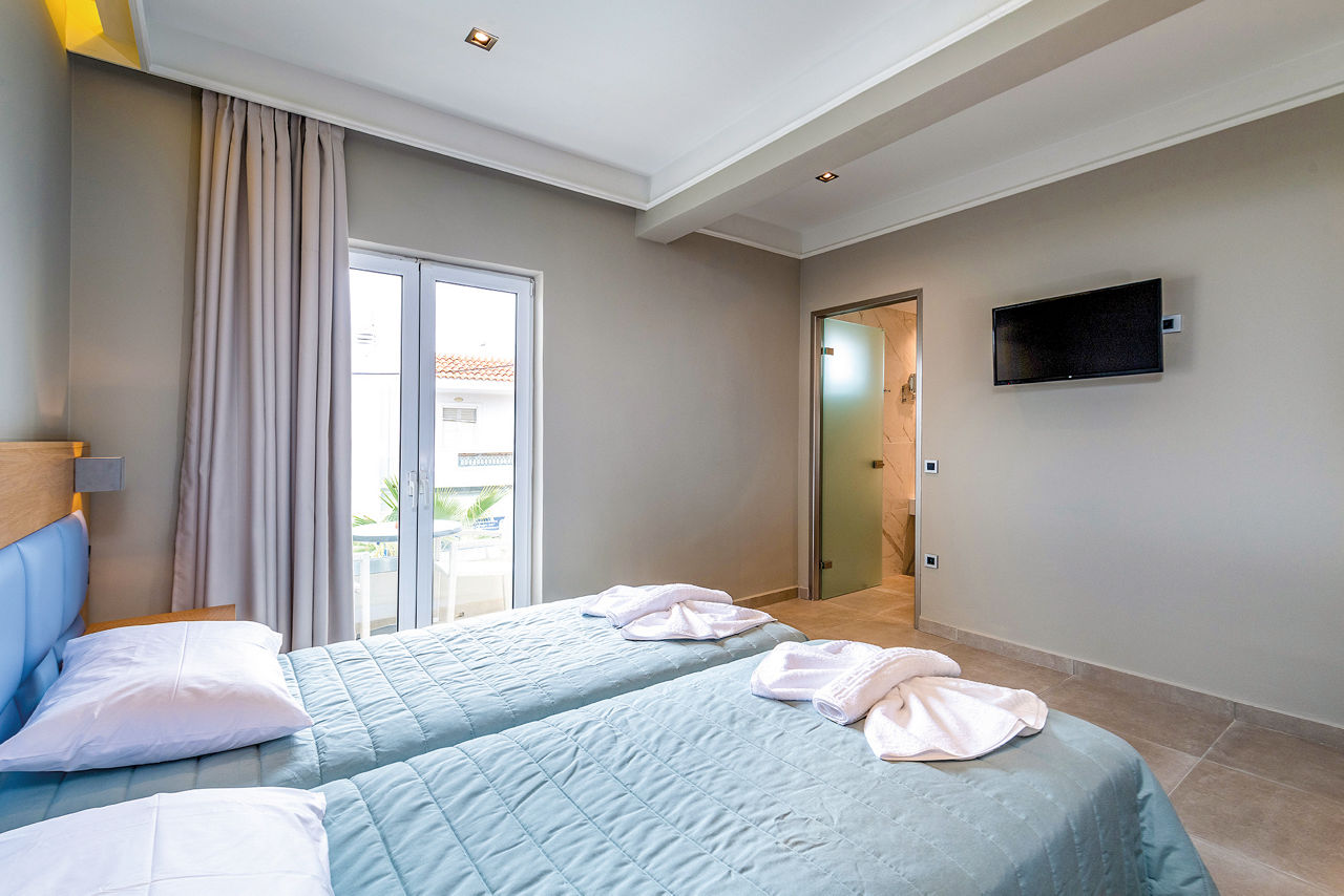Studios sleep up to 2 adults have twin beds, bathroom with shower, air-conditioning, fridge and balcony or terrace. One bedroom apartments sleep up to 3 adults with twin beds plus sofa bed and kitchenette. Two bedroom apartments sleep up to 4 adults with four twin beds and kitchenette. Double rooms sleep up to 2 adults with mountain view, twin beds, bathroom with shower, air-conditioning, fridge, TV and balcony or terrace.