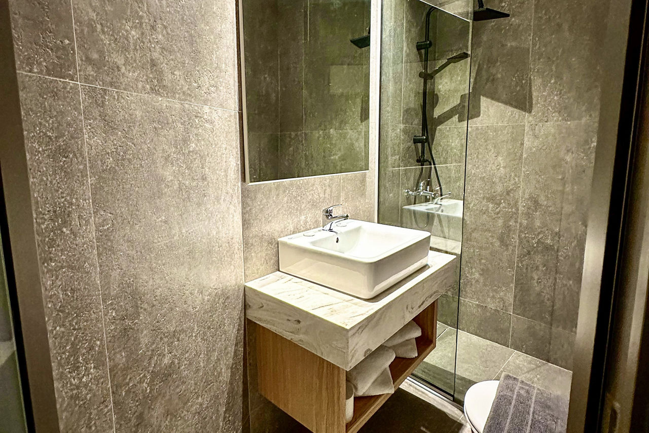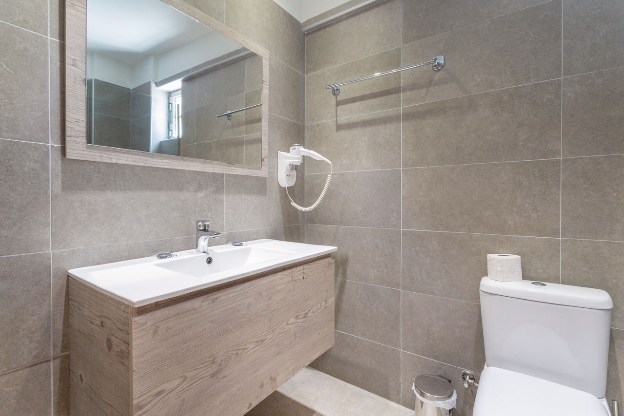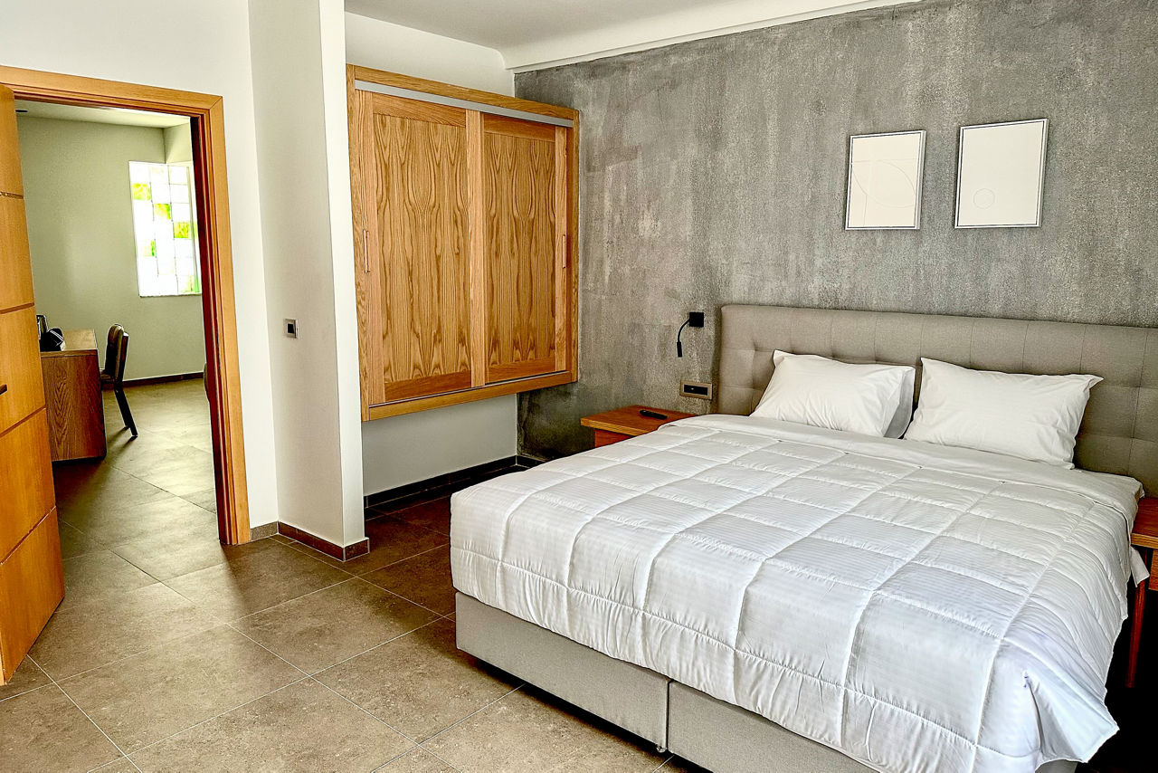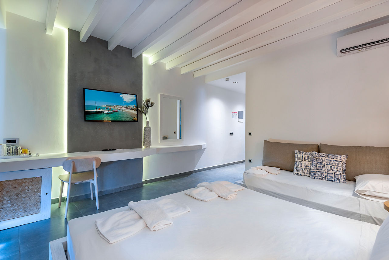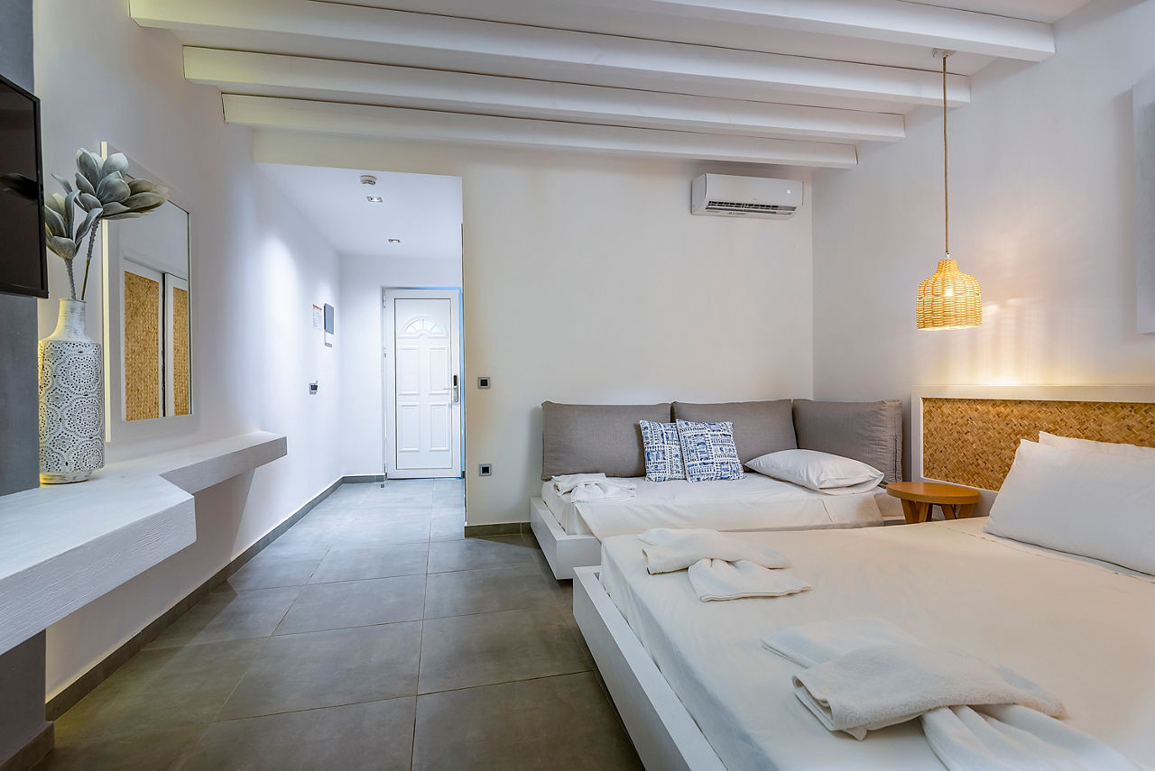 Studios sleep up to 2 adults have twin beds, bathroom with shower, air-conditioning, fridge and balcony or terrace. One bedroom apartments sleep up to 3 adults with twin beds plus sofa bed and kitchenette. Two bedroom apartments sleep up to 4 adults with four twin beds and kitchenette. Double rooms sleep up to 2 adults with mountain view, twin beds, bathroom with shower, air-conditioning, fridge, TV and balcony or terrace.