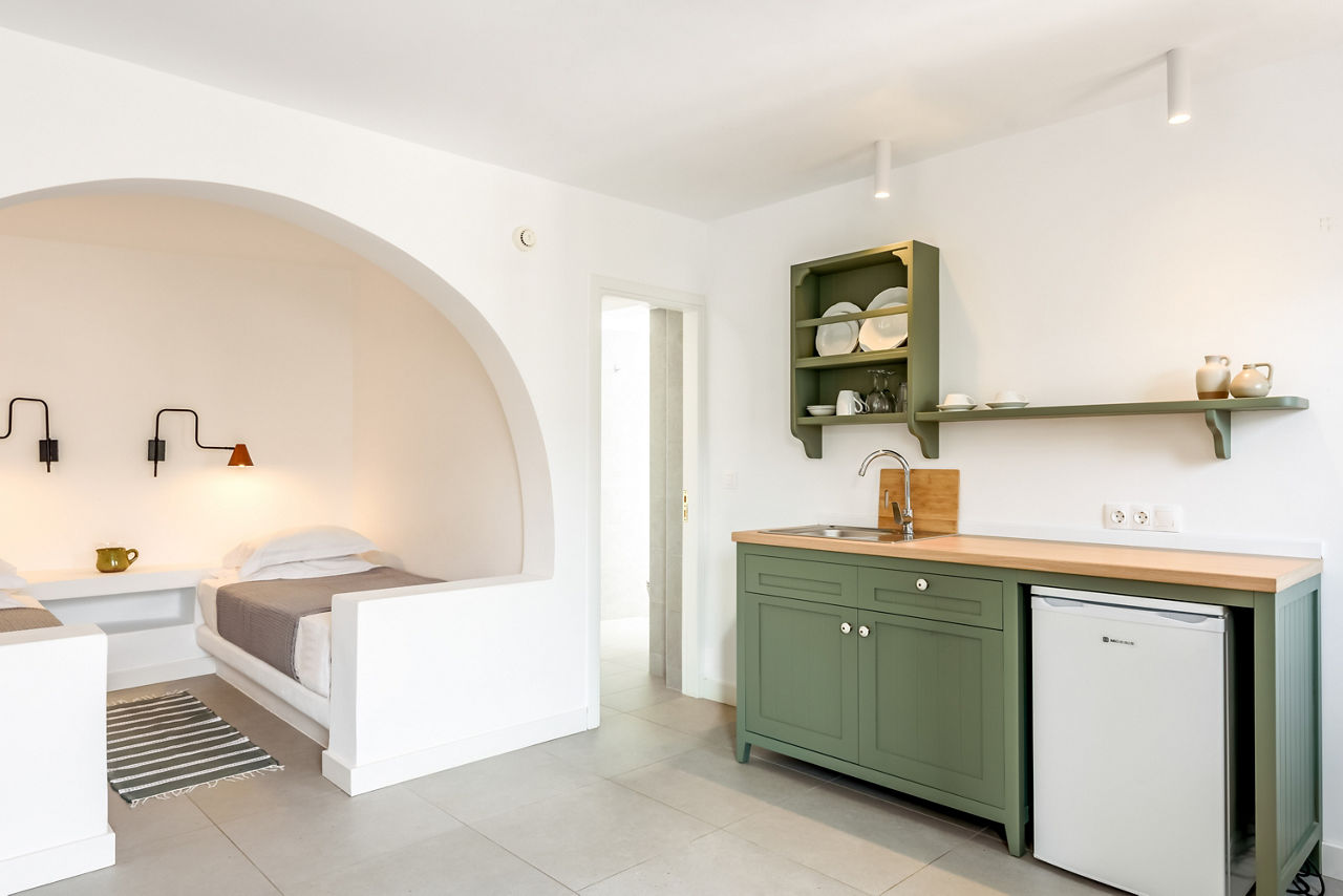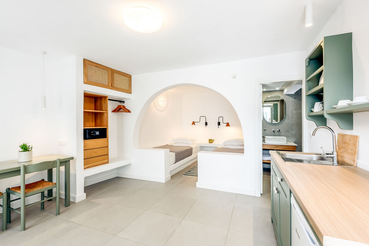 Built in distinctive traditional Greek island style, Nissia Kamares capsulate a tranquil holiday to Kos. With a relaxing atmosphere and friendly staff, you can opt to spend your days laying by the pool or immerse yourself in the beautiful gardens. If you want to explore the tastes of Kardamena then you are only a short distance away from several restaurants and bars. However you decide to tailor your holiday Nissia Kamares will make sure you have a great time.Studio room sleeps up to 2 adults and has bathroom containing shower, air conditioning, hairdryer, television, kitchenette with dining area and balcony.
