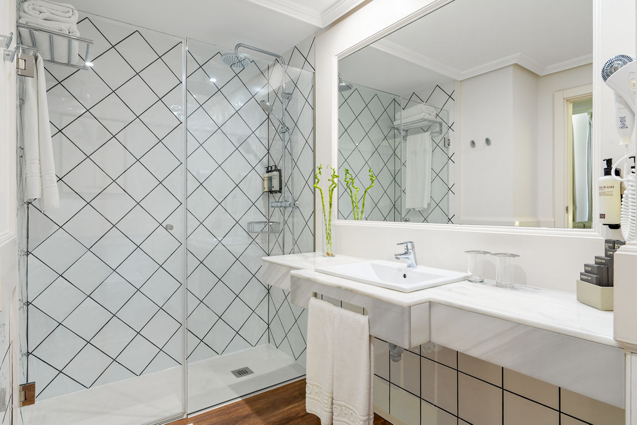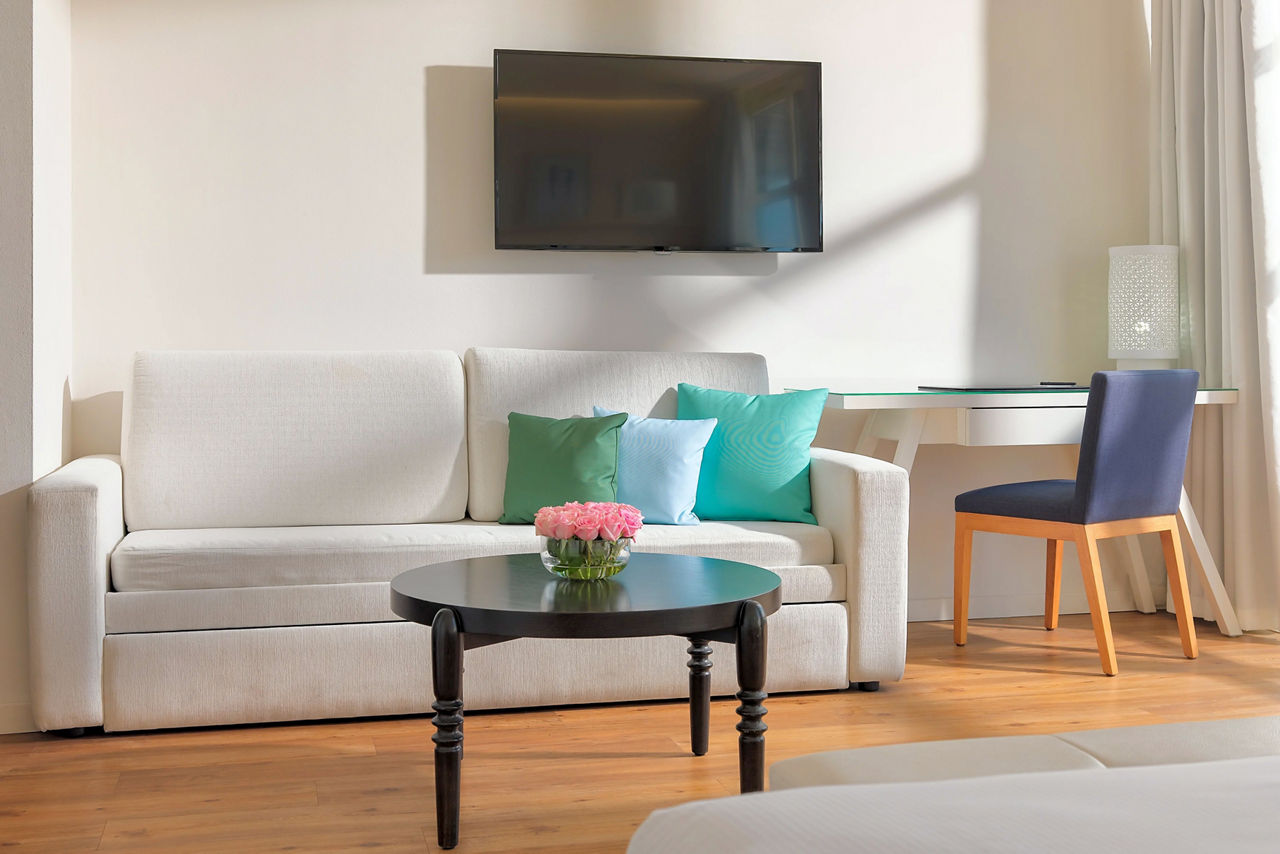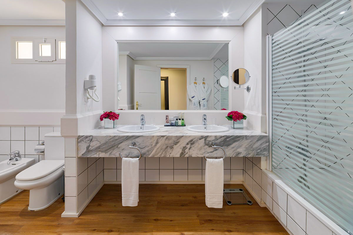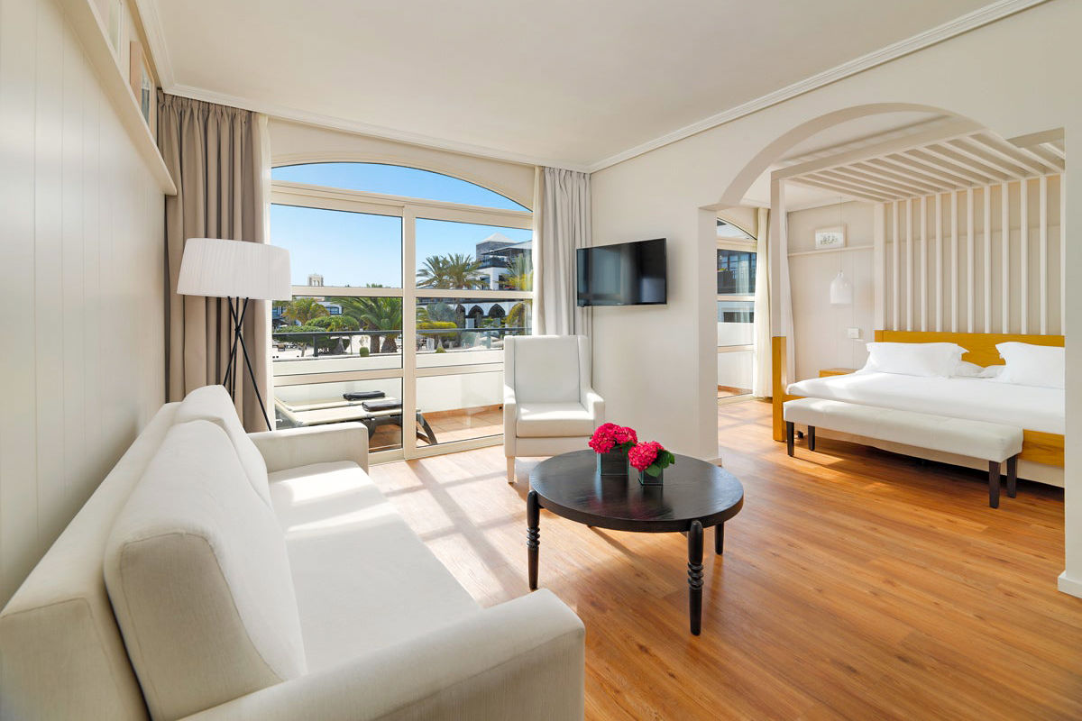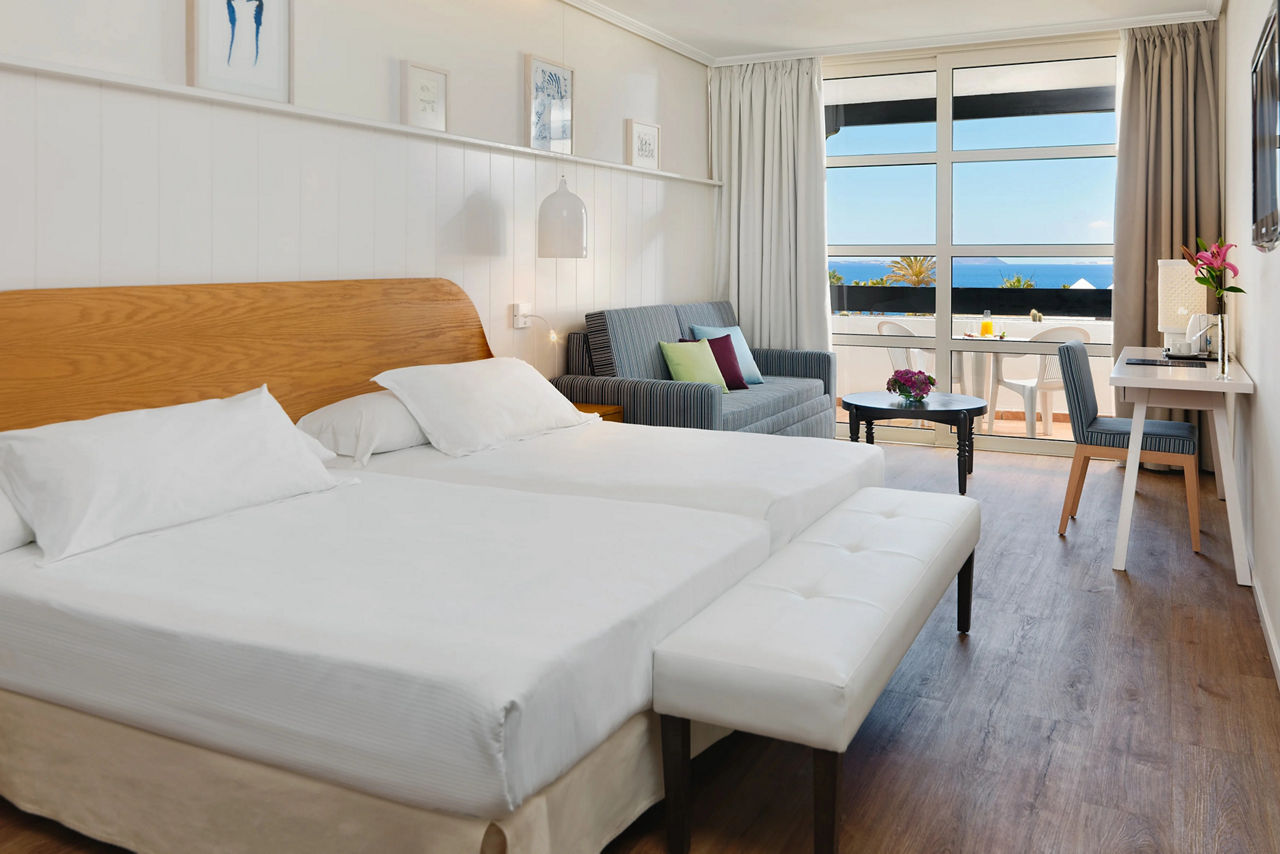 Double rooms sleep up to 3 adults or 2 adults and 2 children and full bathroom, hairdryer, air conditioning, flat screen satellite TV and a balcony or terrace. Double rooms with Sea View, Privilege Superior rooms with luxury extras including pillow menu, bathrobe and slippers, welcome gift, a la carte breakfast and dinner, one free spa session and exclusive lounge and terrace access, Superior Deluxe rooms with bathrobe and slippers, MP3 dock and pillow menu, Junior suites and Double rooms for Sole Use are also available.