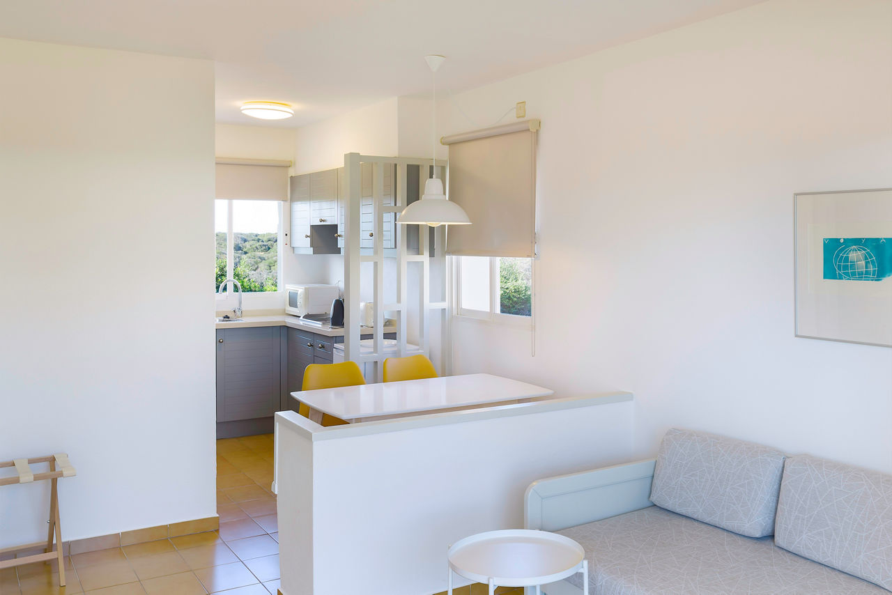 AluaSun Mediterraneo is located next to the wonderful natural area of Rafalet in the laid-back resort of S?Algar. The huge lagoon-style pool takes centre stage at the hotel with lots of space to relax. The hotel offers a range of spacious well equipped apartments with a bright and airy feel. In terms of facilities there is a range of sporting activities, entertainment, a wonderful restaurant and a shuttle bus to Punta Prima, making for a perfect holiday in peaceful S'Algar!Standard Village rooms sleep up to 4 adults and have bathroom containing a bath with shower attachment, air conditioning, hairdryer, flat screen television, coffee making facilities, fridge, kettle and balcony or terrace. Room upgrade options are also available.