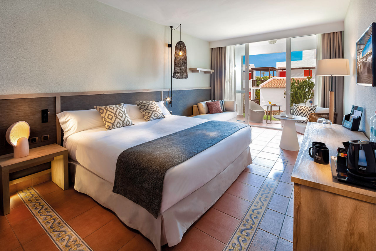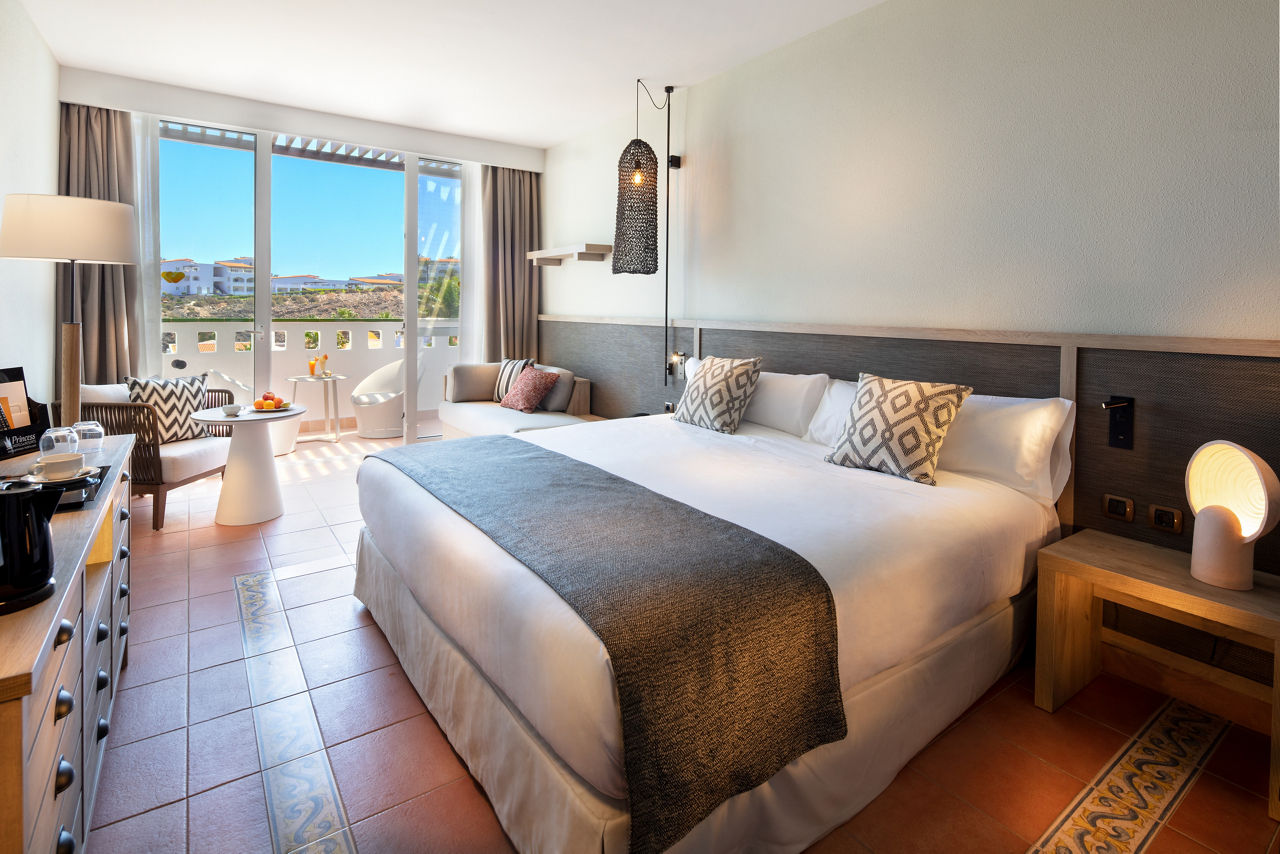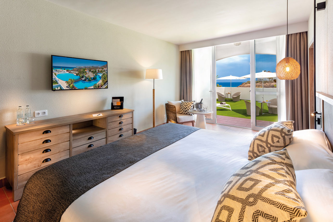 The Fuerteventura Princess, encased in luscious tropical gardens with direct access to the incomparable beauty of Esquinzo de Jandia beach, will not disappoint those looking to soak up the sunshine and dine overlooking the glistening sea. This hotel is ideal for couples and families with plenty of activities to keep everyone entertained including tennis courts, a wellness centre and a maxi club specifically for teenagers. A selection of board basis is available too, so decide if you?re going all-out with All Inclusive or maybe just mealtimes to suit you. Don?t forget to check out the Esencia upgrade, which includes access to exclusive facilities including a pool area, restaurant and many more.Double rooms sleep up to 3 adults and 1 child or 2 adults and 2 children and have twin beds with air-conditioning, mini bar*, satellite TV, safety deposit box*, full bathroom with shower over bath, hairdryer and a balcony or terrace. Double rooms with Side Sea View, Double rooms with Sea View, Family Interconnecting rooms and Double rooms for Sole Use are also available.