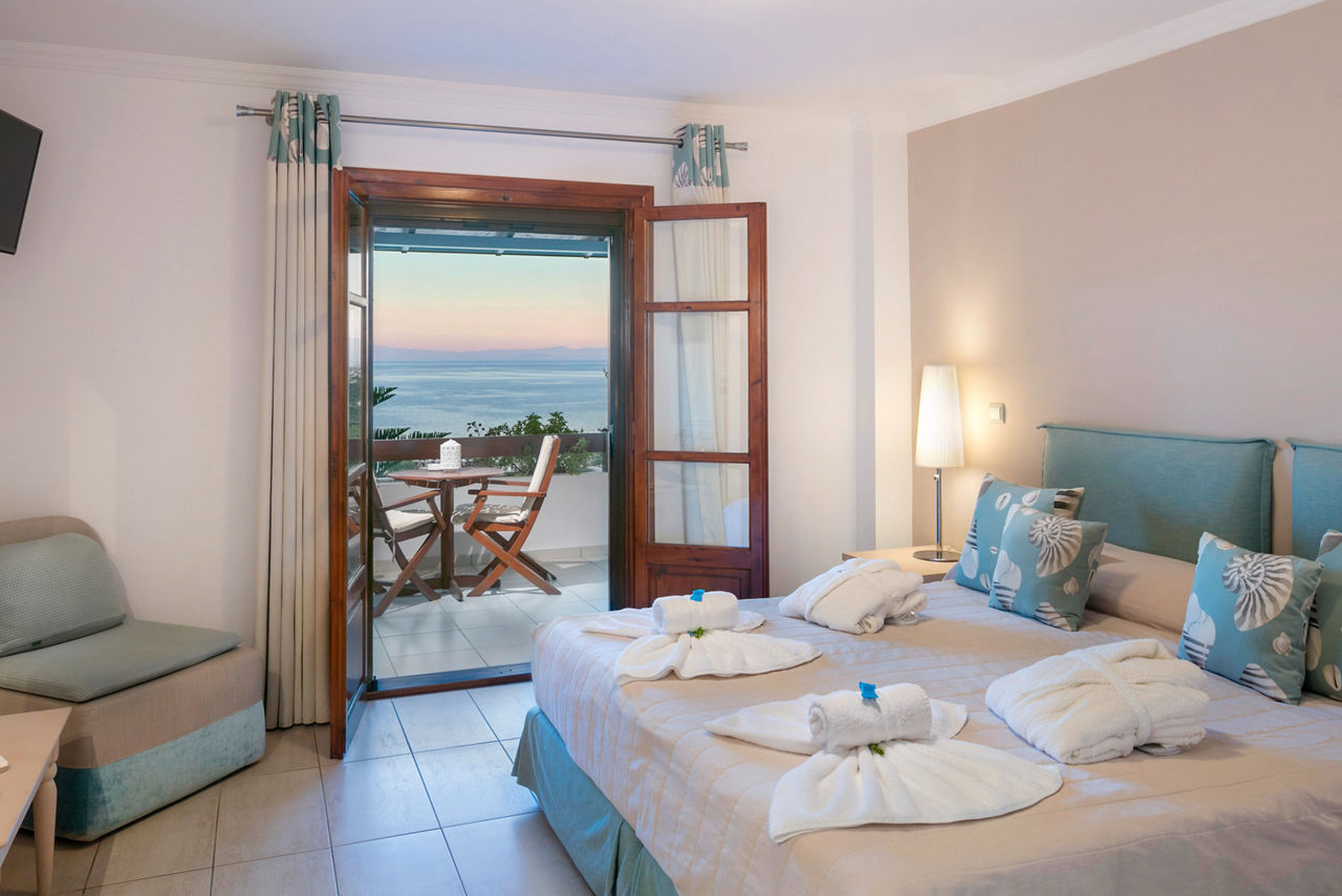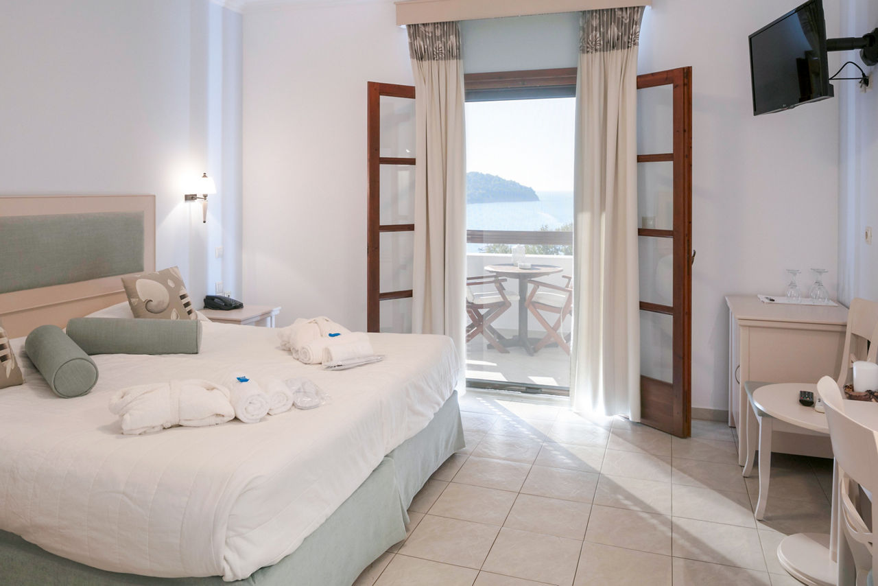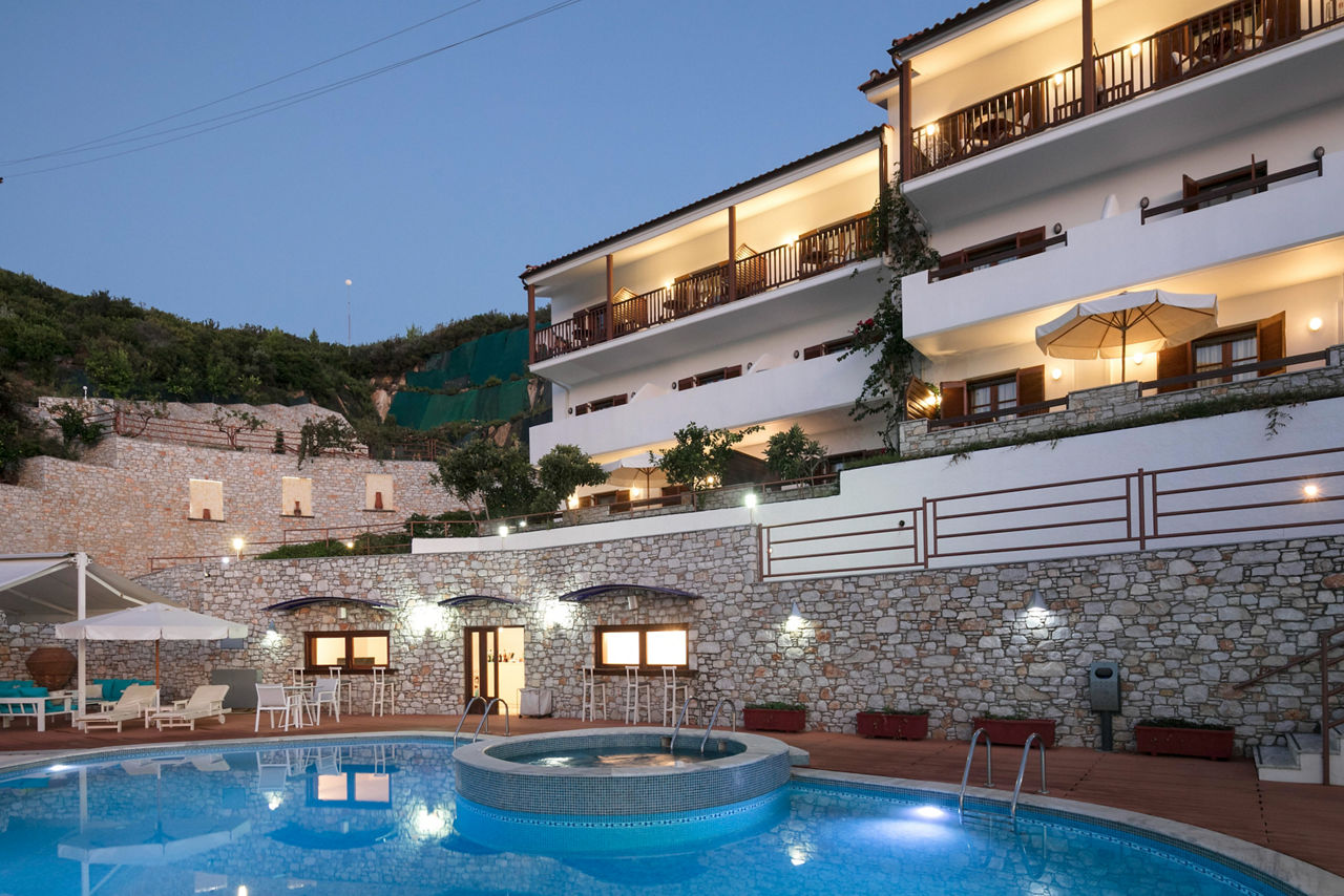 This family-run hotel is located in a quiet hillside position and features a relaxing pool area with spectacular views. The comfortable rooms offer a tranquil environment and come complete with a range of amenities to ensure you can relax following a day of sightseeing in this beautiful area. A variety of bars and restaurants can be found close by and a beautiful, small beach just a short stroll away.Deluxe Double rooms sleep up to 2 adults and have bathroom containing a shower, air conditioning, hairdryer, bathrobe and slippers, flat screen television, fridge and balcony. Room upgrade options and Sole Use rooms are also available.