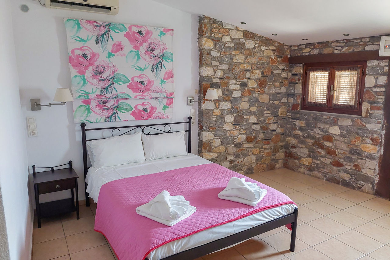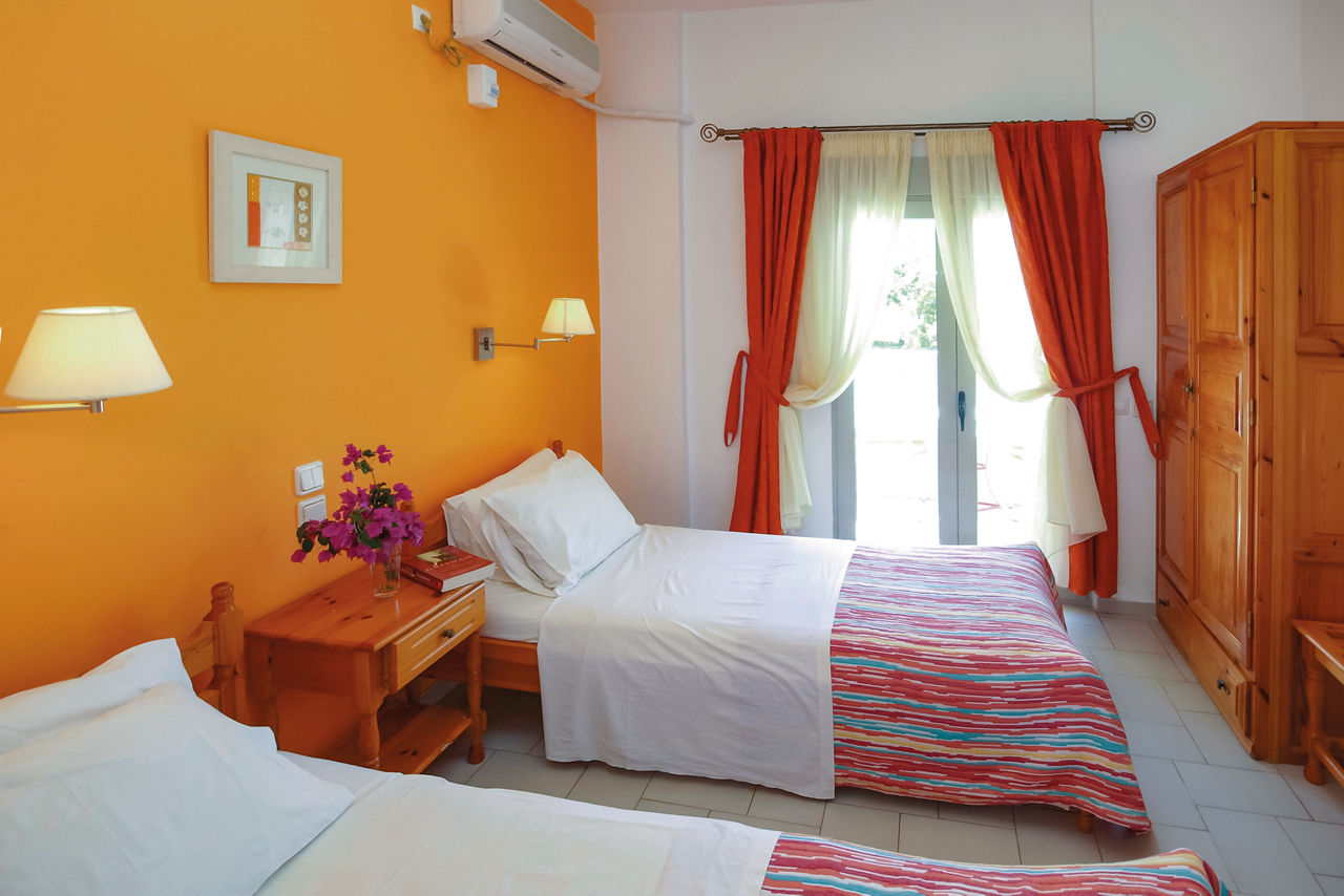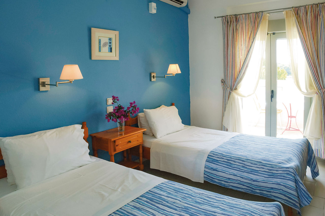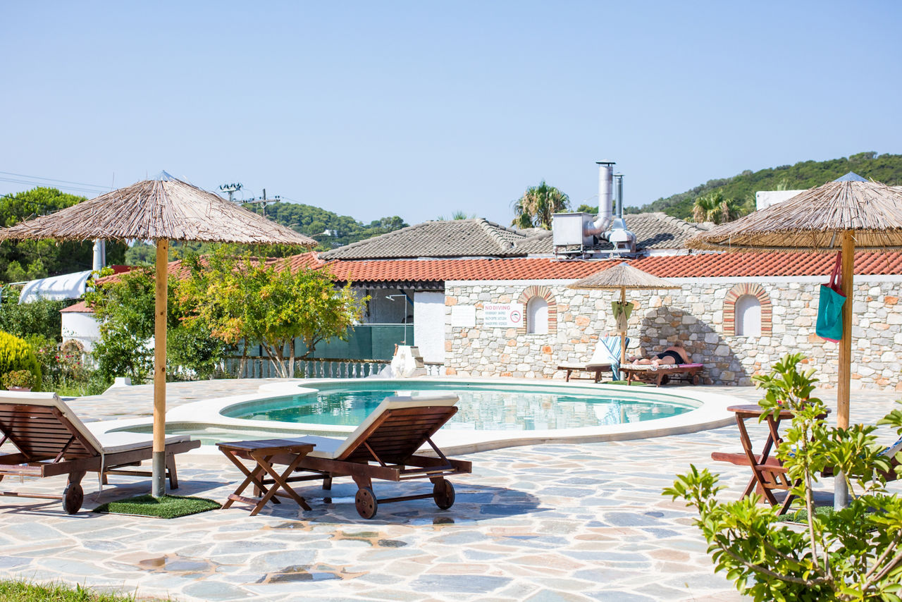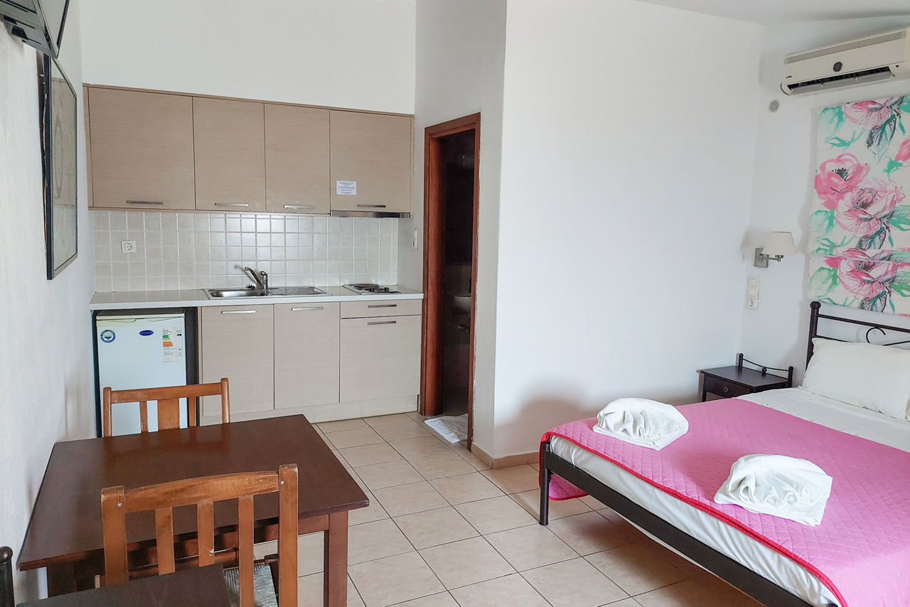 With their own pool and ample sun terrace, these friendly apartments are a great base to discover this beautiful island. Restaurants with a local flavour are close by so look forward to tasting all the traditional delicacies and even bringing some treats back for a meal al fresco on your balcony or terrace. Showcasing watersports galore and clear blue waters, the golden Koukounaries Beach is within easy reach making these simple apartments perfect for friends and couples looking for a quiet getaway.Double studios sleep up to 2 adults and have bathroom, fridge, kettle, double cooking rings and balcony or terrace.