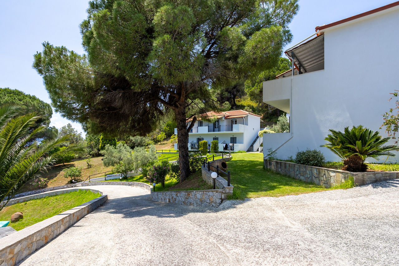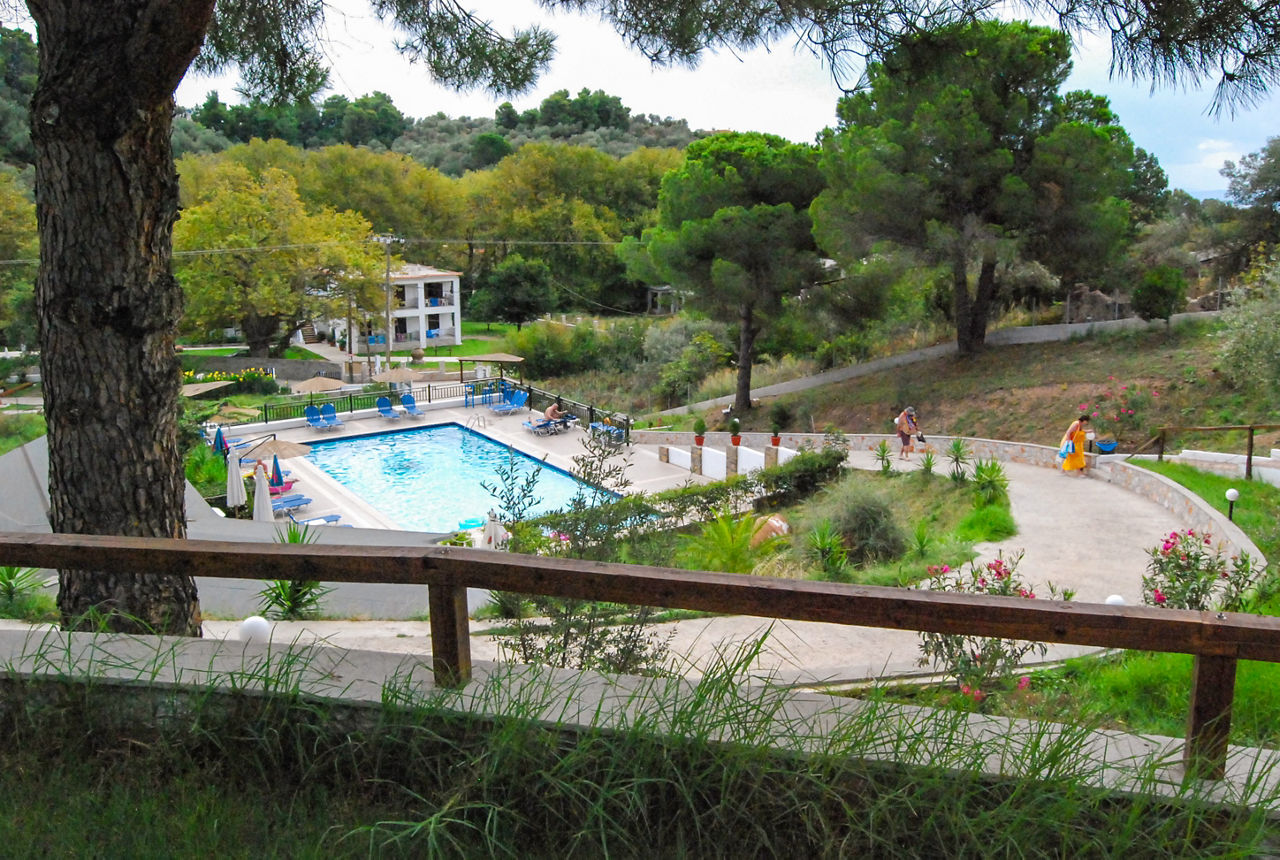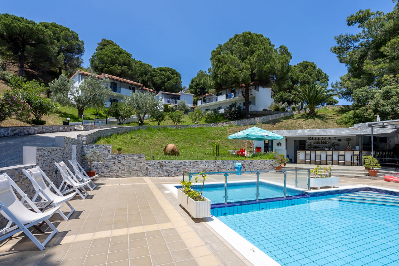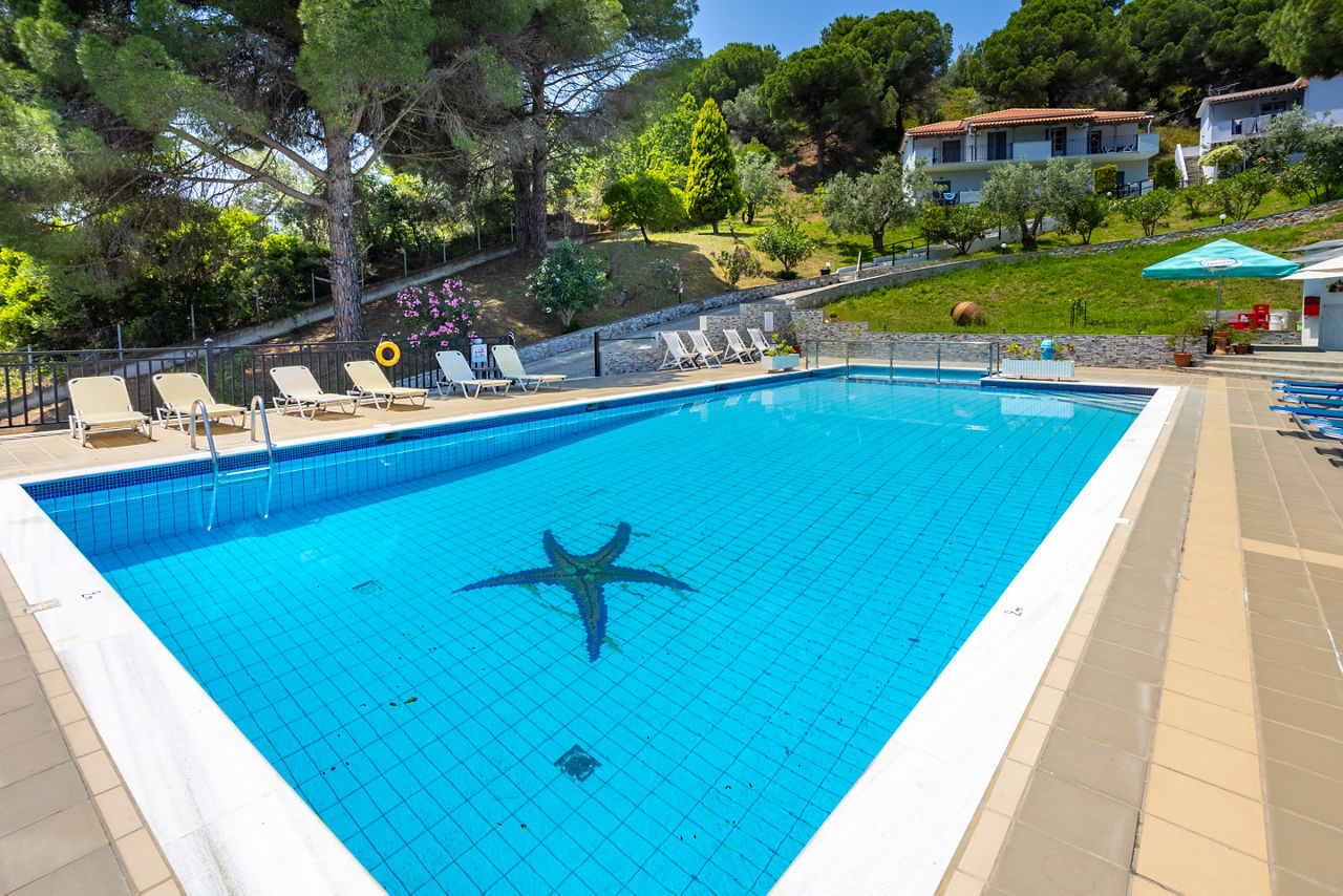 These apartments ooze traditional Greek charm in abundance, tucked away down a country lane with its dainty, whitewashed sugar cube houses and picturesque hillside setting. There's a good-sized pool on-site with a well-stocked bar surrounded by lush green pine trees. A short walk will bring you to Agia Parskevi's resort centre where a number of bars, restaurants and the golden sandy beach can be found.