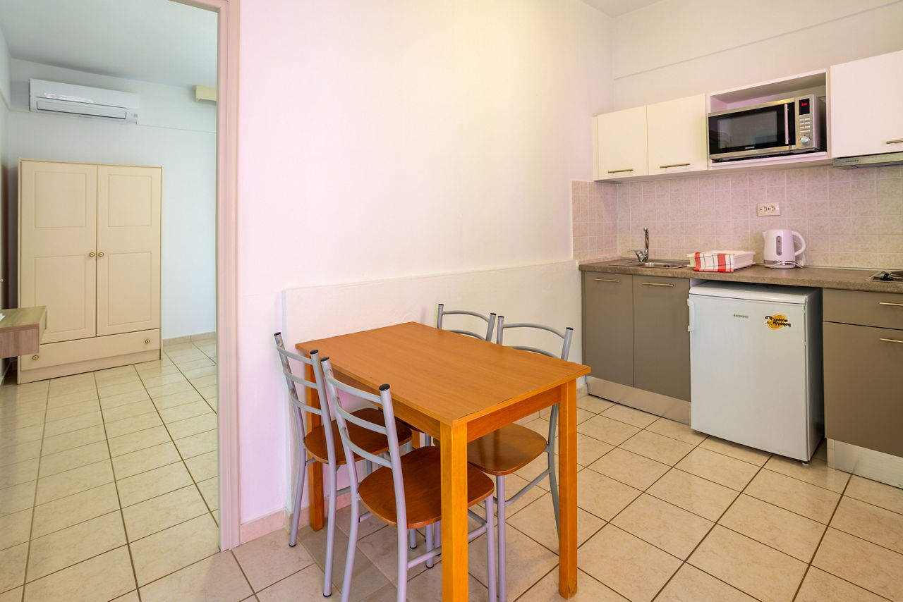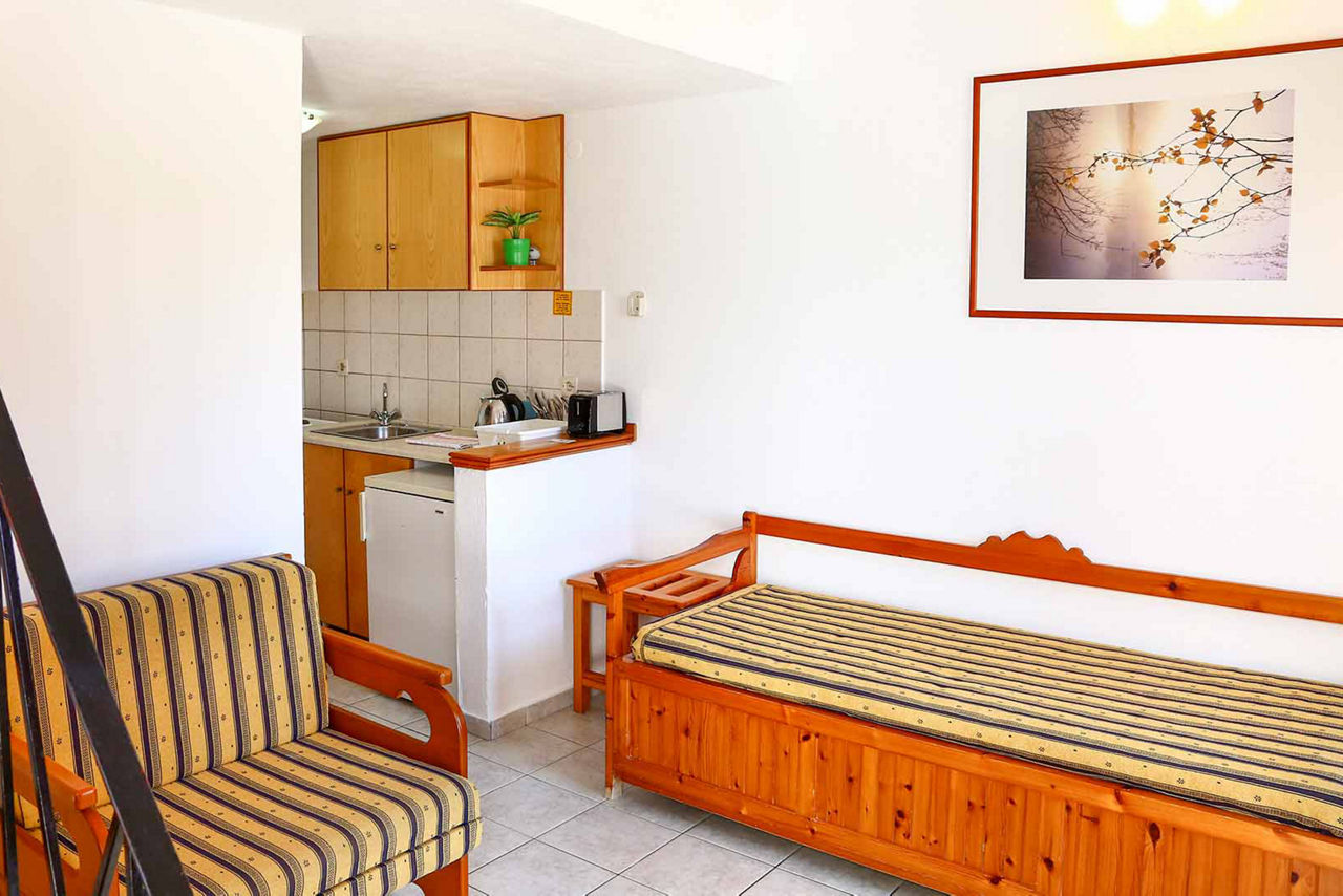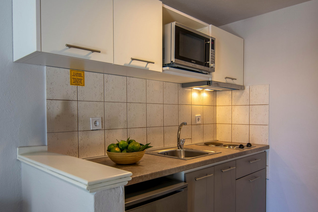 Studios sleep up to 2 adults and have bathroom containing a shower, air conditioning*, kitchenette and balcony or terrace. Triple studios sleeping up to 3 adults are also available.