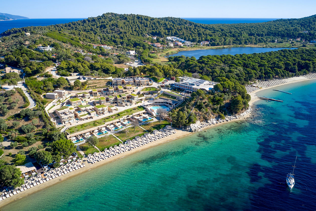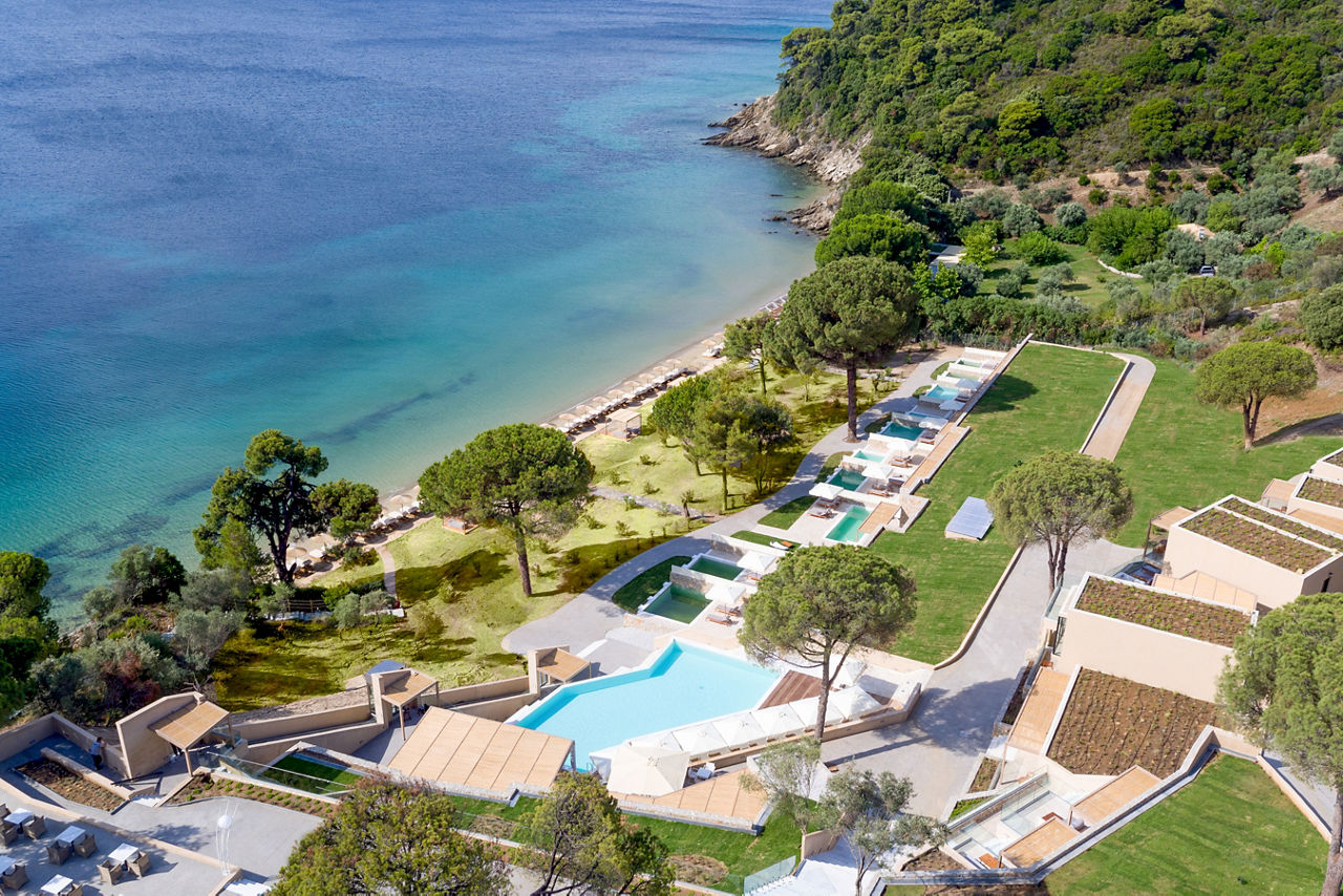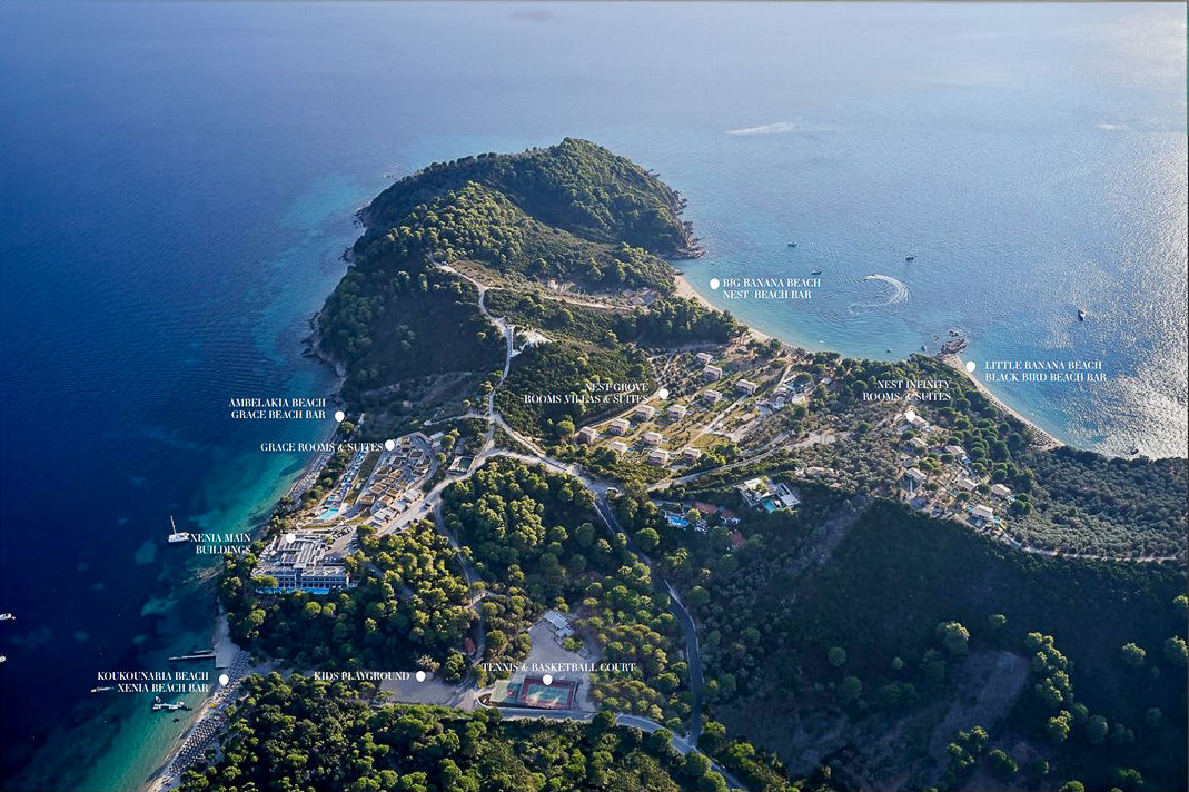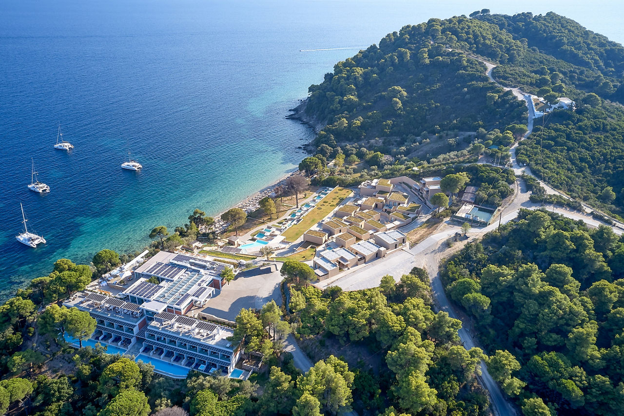 Located on the south-western tip of Skiathos, Elivi Resort is a modern and luxurious property set amongst stunning pine forests, offering access to several beautiful beachfront areas within the complex. The spacious resort is arranged across three areas - Xenia, Nest and Grace - all thoughtfully spread among gardens and natural landscapes, creating a strong sense of space and a calm, nature-filled atmosphere. Guests can enjoy a wide choice of restaurants and bars alongside stylish facilities, contemporary accommodation and attentive service, making this a peaceful yet well-rounded resort experience.