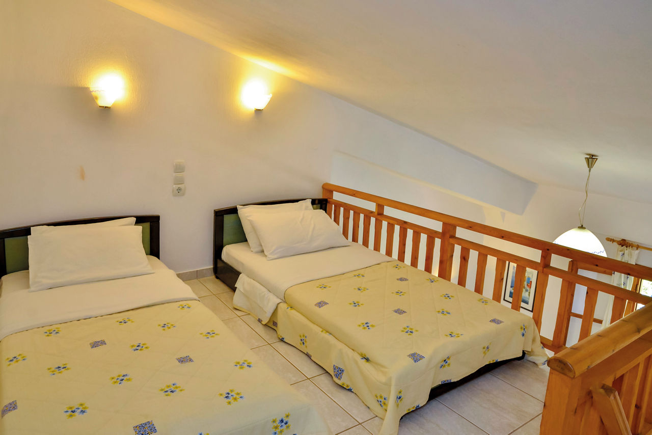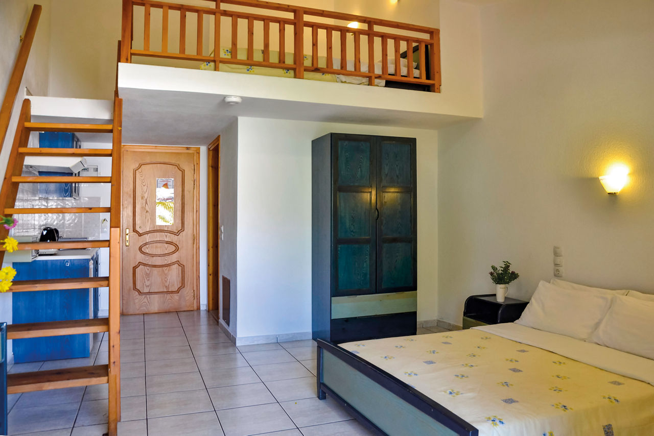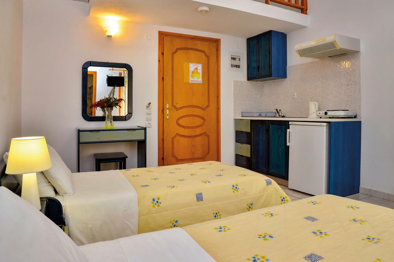 Standard Double studios sleep 2 adults and have bathroom, air conditioning*, fridge, kettle, cooking ring and balcony or terrace. Standard Triple studios sleeping 3 adults, Maisonettes sleeping 4 adults and Two Bedroom apartments sleeping 4 adults are also available.