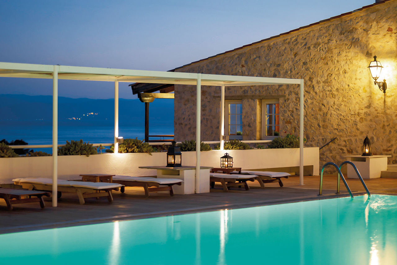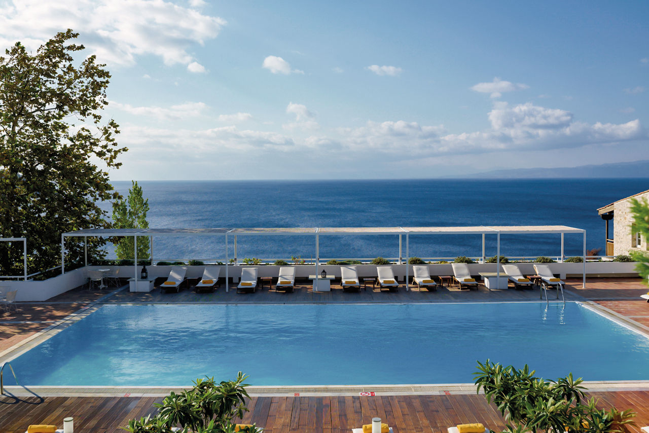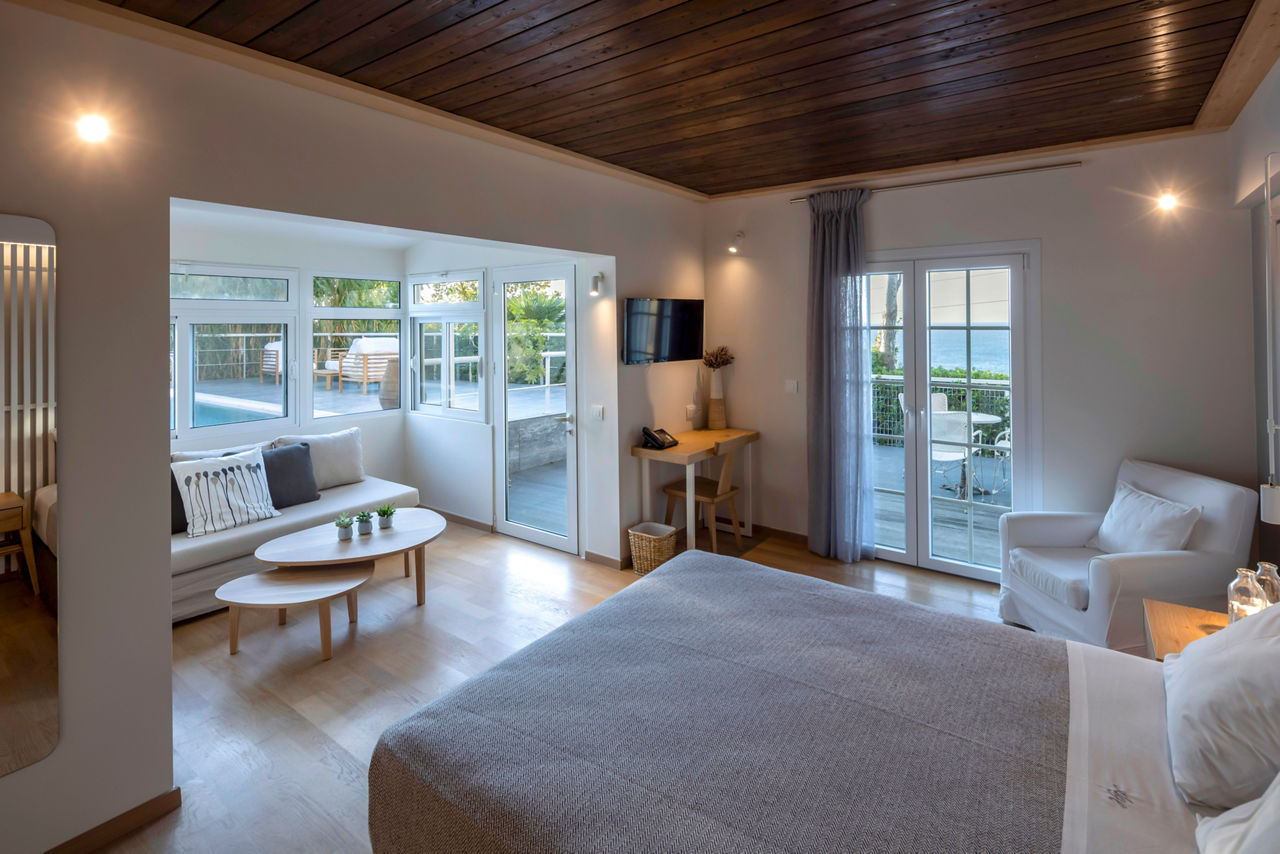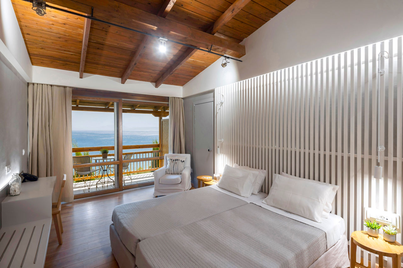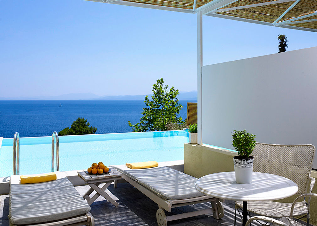 Sensational sea views are the order of the day at this idyllic Skiathos hotel. The design was influenced by a traditional Greek monastery and it was built using local stone ? it doesn?t get much more charming than that! Unwind on the stunning sun terrace before enjoying lunch in the vine-covered, al-fresco restaurant. It?s true bliss! Within minutes, from this hillside spot, you can stroll down to Agia Paraskevi Beach, which was made for lazy days. You?ll find a great range of restaurants in the area. Pick up a tasty gyros for lunch then savour a meze feast for dinner. Foodies, you?ll be in your element!Deluxe Double rooms with Sea View sleep 2 adults and have bathroom containing a bath with shower attachment, air conditioning, fridge, flat screen television and balcony. Junior suites sleeping up to 3 adults are also available.