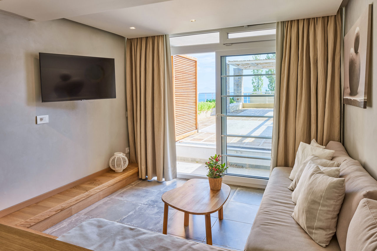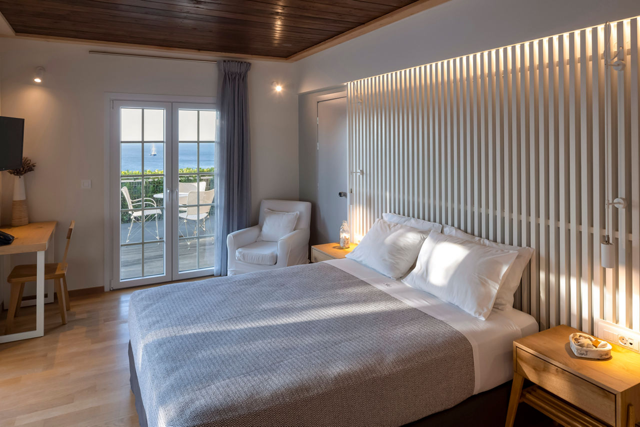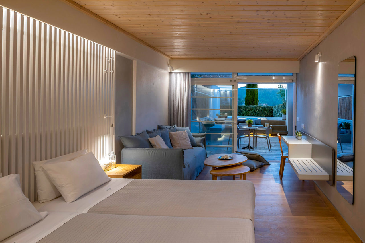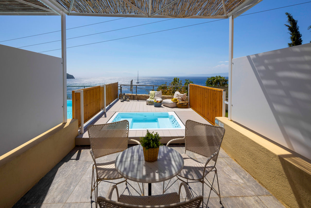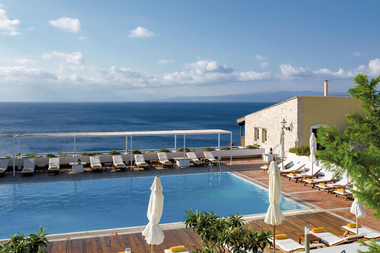Sensational sea views are the order of the day at this idyllic Skiathos hotel. The design was influenced by a traditional Greek monastery and it was built using local stone ? it doesn?t get much more charming than that! Unwind on the stunning sun terrace before enjoying lunch in the vine-covered, al-fresco restaurant. It?s true bliss! Within minutes, from this hillside spot, you can stroll down to Agia Paraskevi Beach, which was made for lazy days. You?ll find a great range of restaurants in the area. Pick up a tasty gyros for lunch then savour a meze feast for dinner. Foodies, you?ll be in your element!Deluxe Double rooms with Sea View sleep 2 adults and have bathroom containing a bath with shower attachment, air conditioning, fridge, flat screen television and balcony. Junior suites sleeping up to 3 adults are also available.