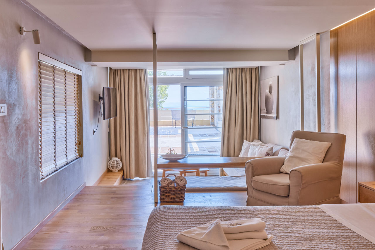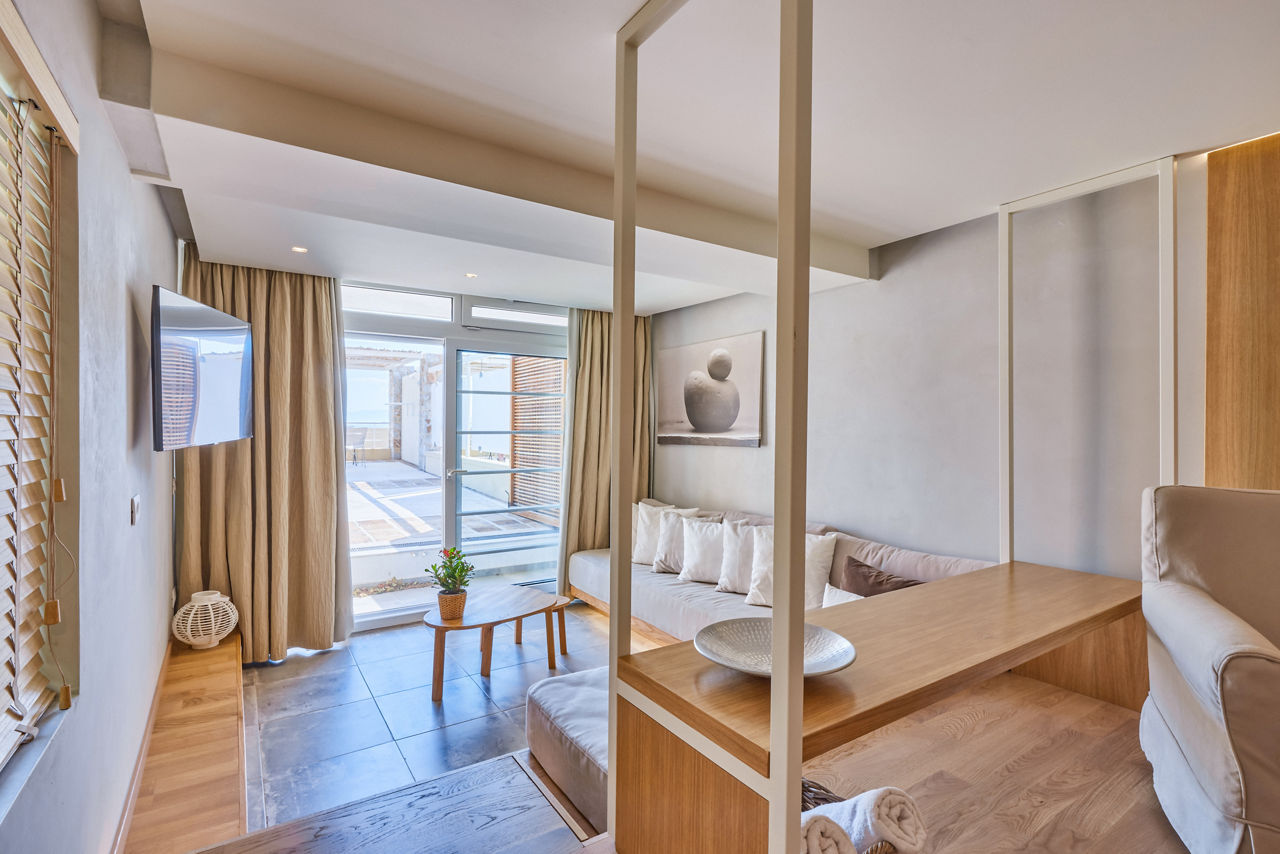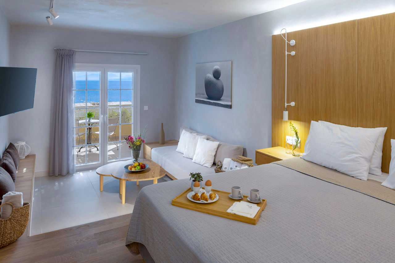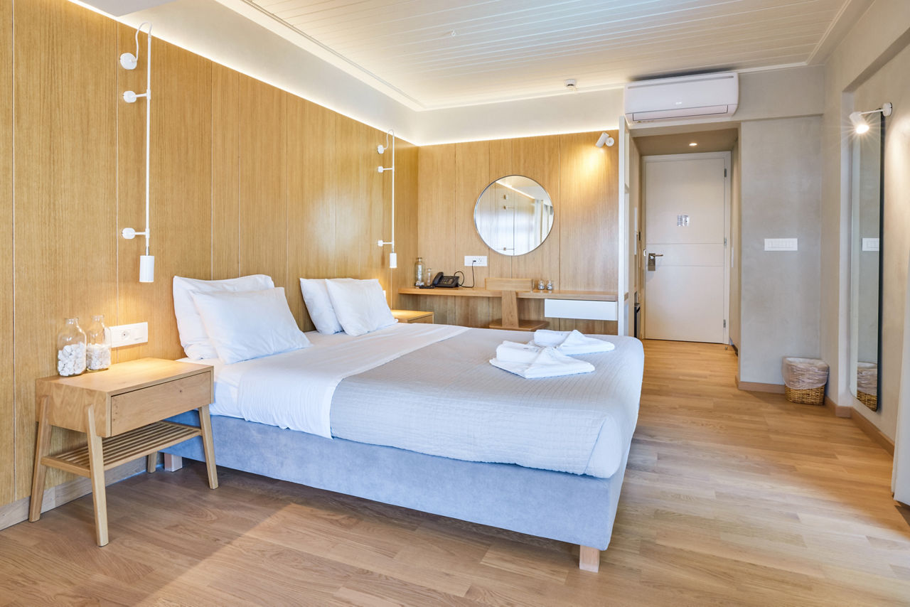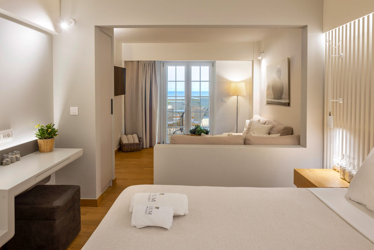 Deluxe Double rooms with Sea View sleep 2 adults and have bathroom containing a bath with shower attachment, air conditioning, fridge, flat screen television and balcony. Junior suites sleeping up to 3 adults are also available.
