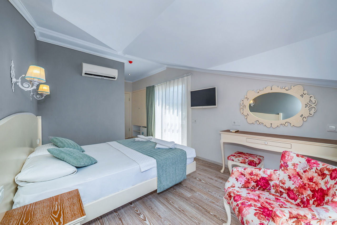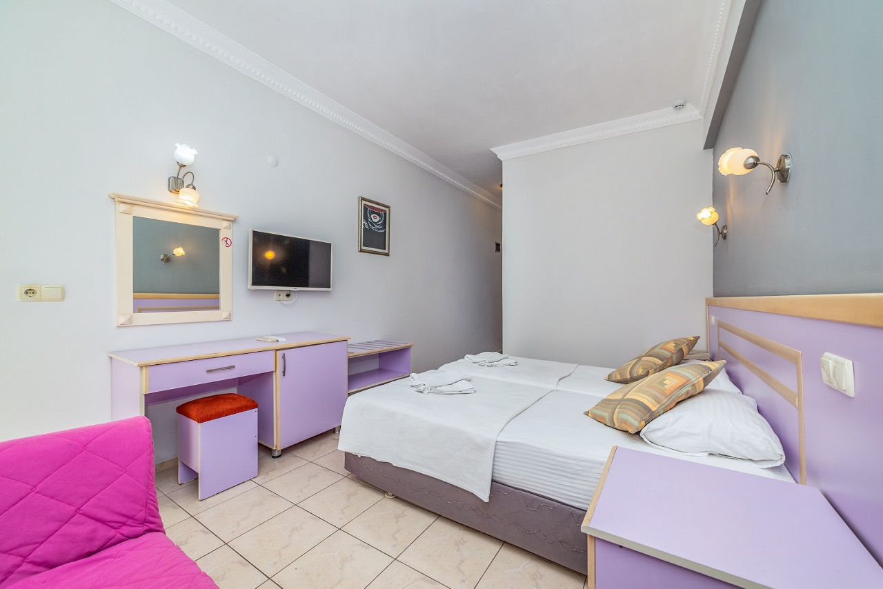 Surrounded by palm-fringed gardens and set in a picturesque mountainous backdrop, the Majestic Hotel has a truly relaxing and laid-back atmosphere, especially around the hotel?s pool area. The hotel is in a great location with everything you could need close by, near to the famous and stunning Blue Lagoon, as well as the shops, bars and restaurants of Olu Deniz.Standard Double and Twin rooms sleep up to 3 adults or 2 adults and 1 child and have bathroom with shower, hairdryer, air conditioning*, TV, mini-bar* and a balcony or terrace. Standard Double and Twin rooms for Sole Use, Superior Double and Twin room with Sea View and Half Board are also available.