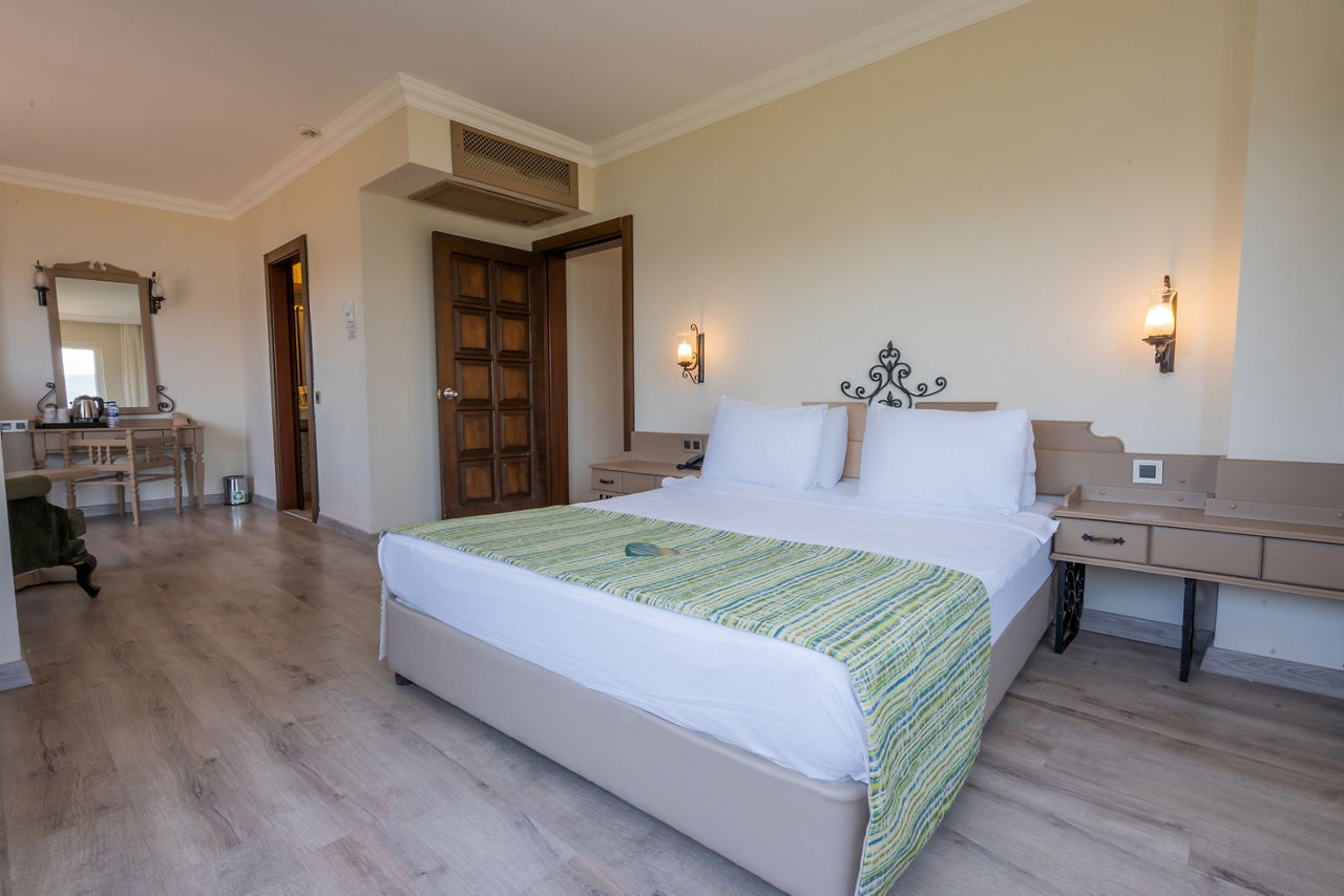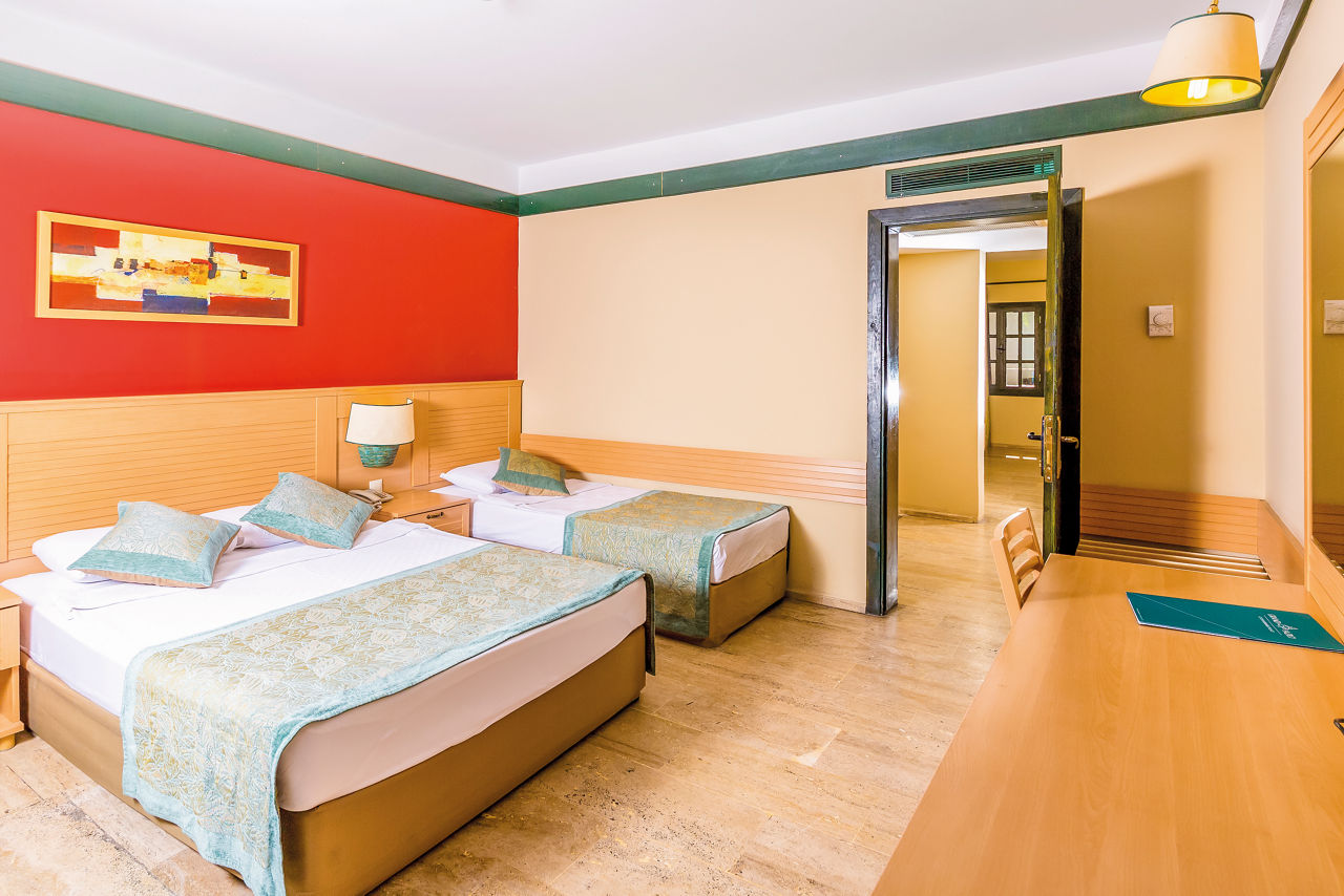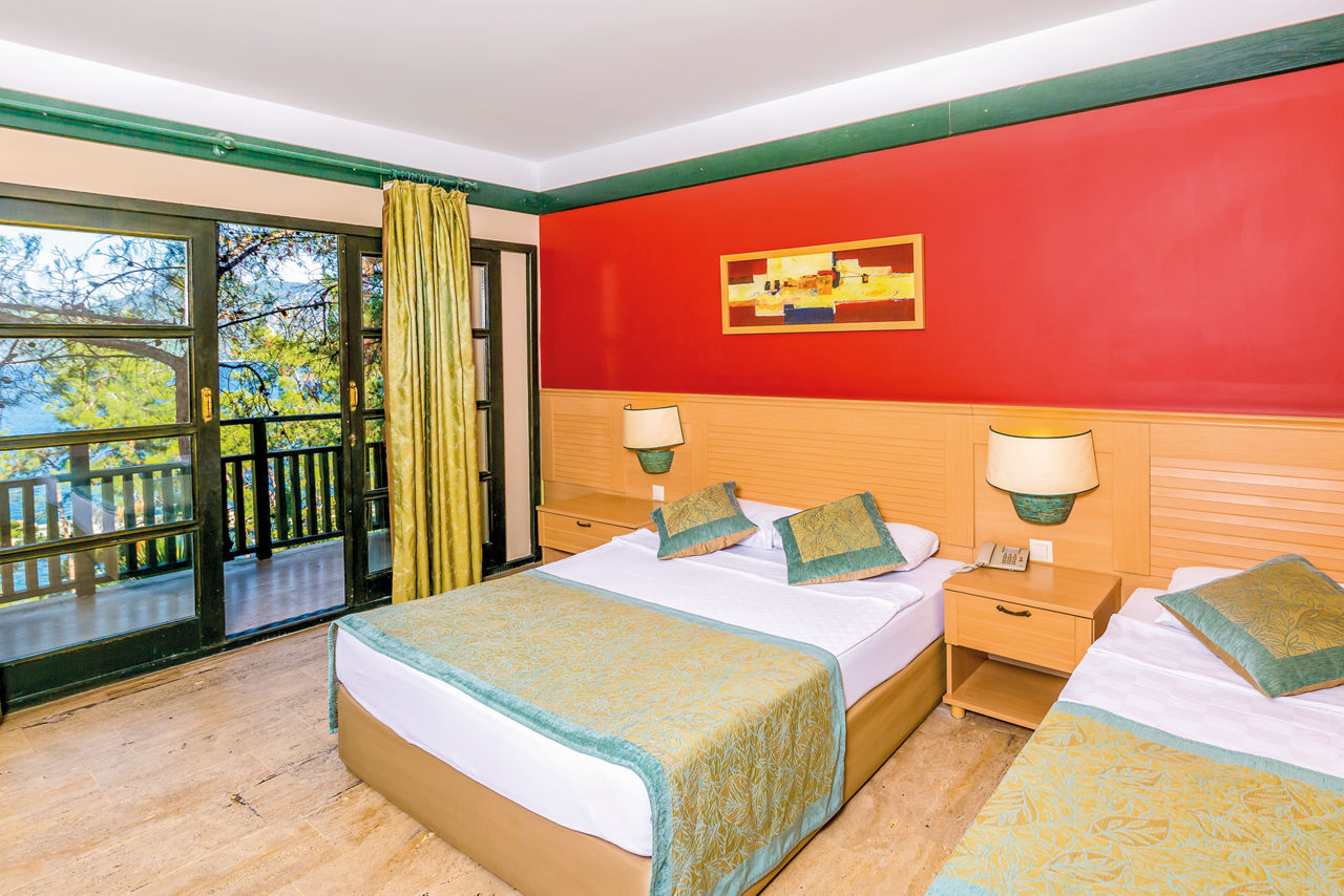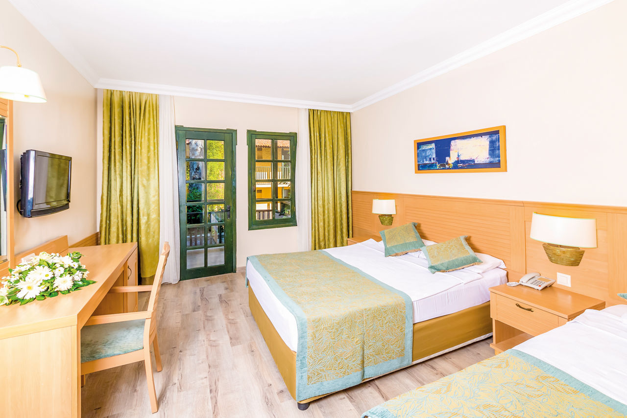 Looking out onto the stunning Marmaris Bay, Grand Yazici Club Marmaris Palace sits within lush pine forests surrounded by the deep blue sea. Perfect for families, this hotel is well-equipped for those travelling with little ones as it offers a colourful kids' club, pool with slides and adventure play house as well as lots of other fun activities! There's also plenty of facilities for adults in search of relaxation or action. Offering two lovely pool areas, a wooden sunbathing jetty stretching into the sea, a spa centre and tonnes of sports, there is something for everyone at this secluded hotel.Standard bungalows sleep up to 3 adults and 1 child and have bathroom containing a shower, air conditioning*, television, hairdryer, safety deposit box* and balcony or terrace. Room upgrade options and Sole Use rooms are also available.