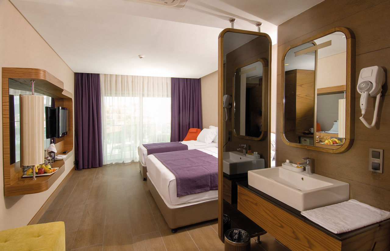 Standard Double or Twin rooms sleep up to 3 adults and 1 child and have bathroom containing a shower, air conditioning, hairdryer, flat screen television, safety deposit box*, coffee making facilities, free Wi-Fi and balcony. Standard Double or Twin rooms with Side Sea View, Standard Double rooms with Sea View and Sole Use rooms are also available.