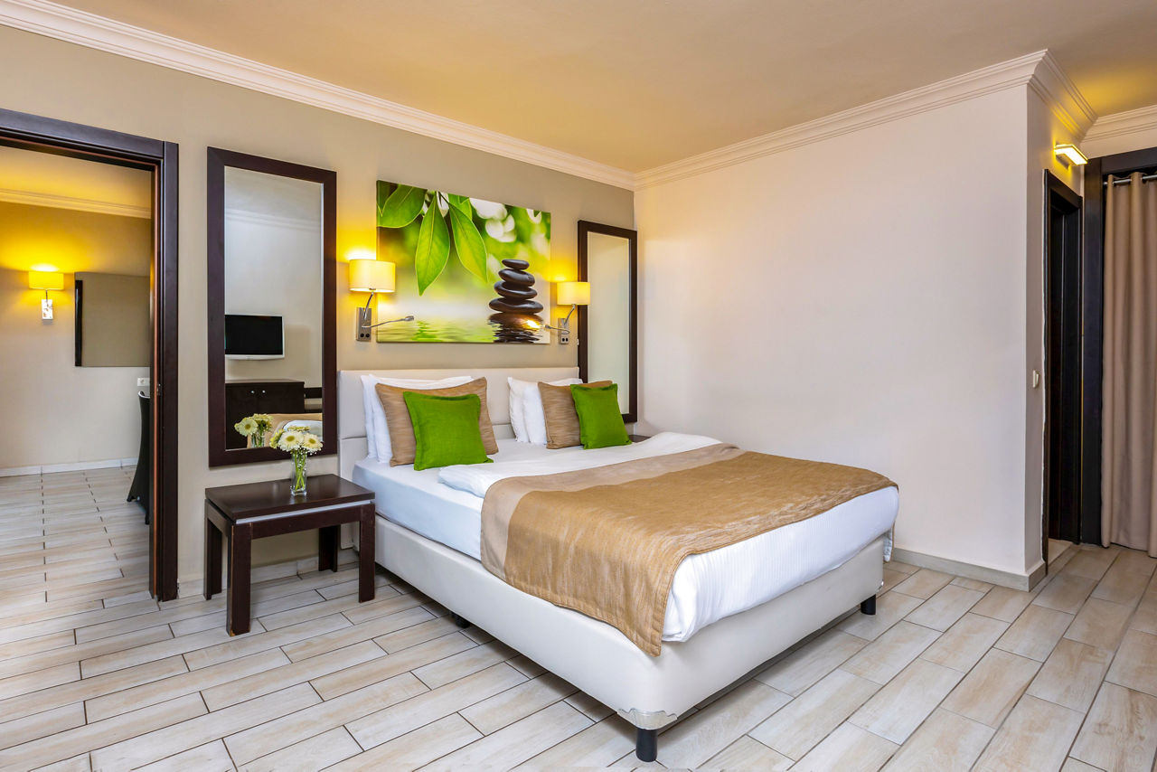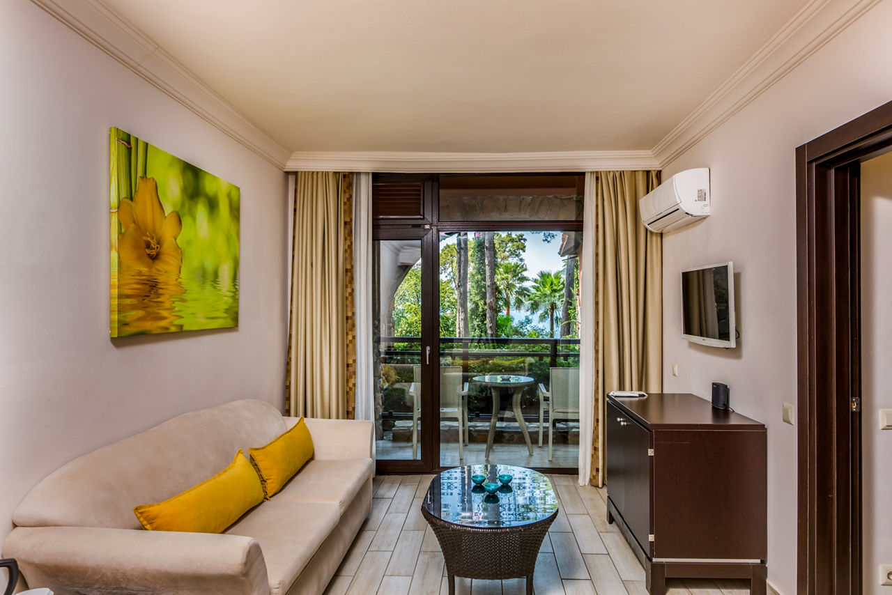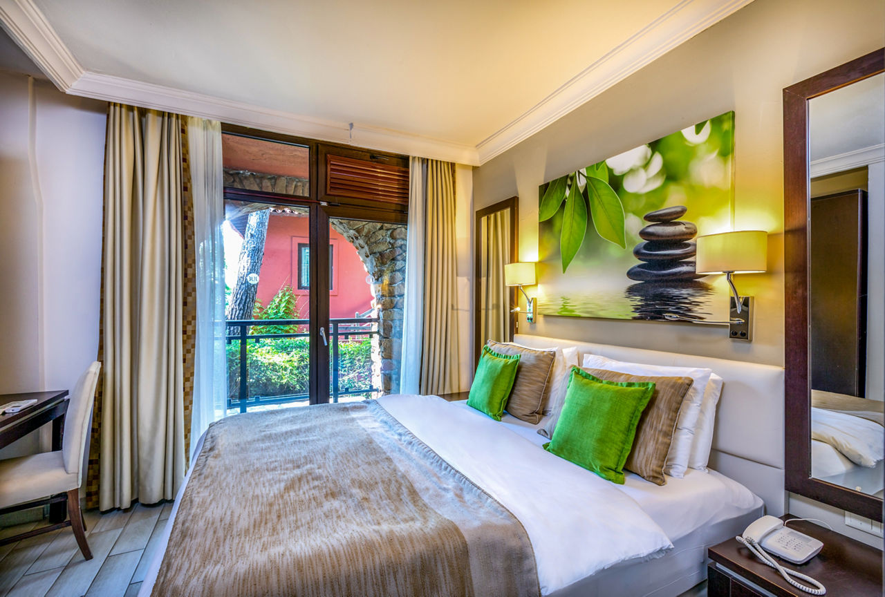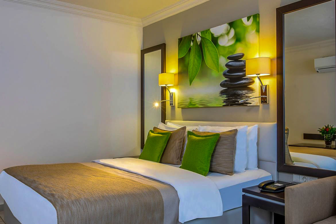 Marmaris Bay Resort is surrounded by lush green gardens and situated in a serene location. The hotel boasts stunning sea views which can be enjoyed from the lovely outdoor pool area or while you dine al fresco. For those wanting to get involved in some fun activities, try out the tennis courts or even some beach volleyball! Alternatively, you can lounge on the hotel?s private beach while you sip on a drink from the beach bar, indulge at the hotel?s peaceful spa or try out some relaxing yoga. As well as all this, accommodation is bright, comfortable and modern. All this makes Marmaris Bay Resort the perfect choice for all!Standard Double and Twin rooms with Garden View sleep up to 3 adults and have bathroom, hairdryer, television and balcony or terrace. Room upgrade options and Sole Use rooms are also available.