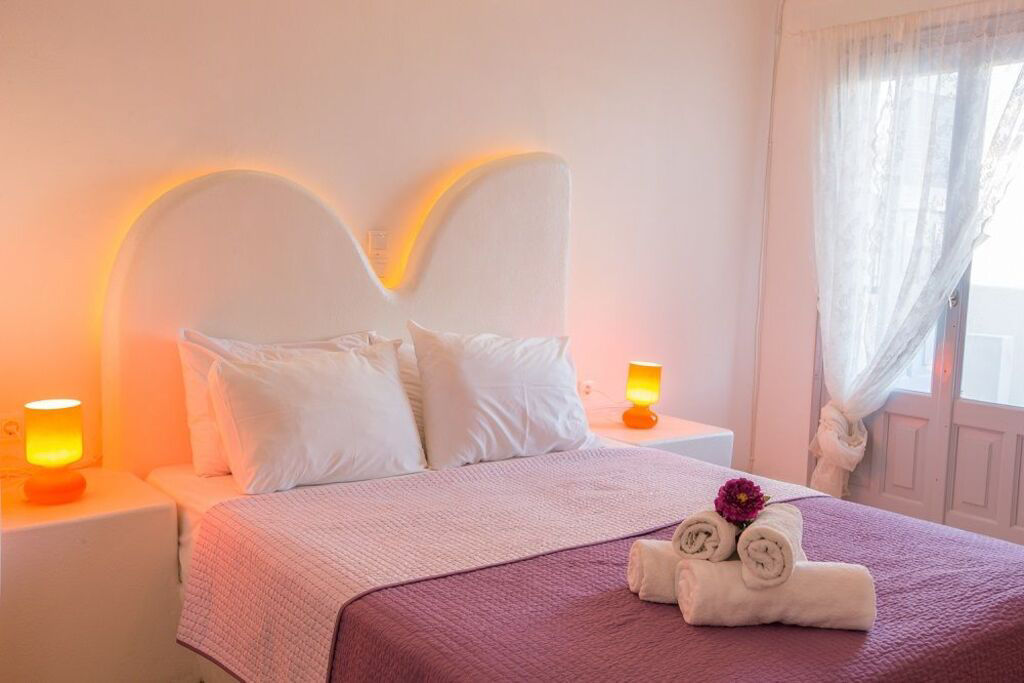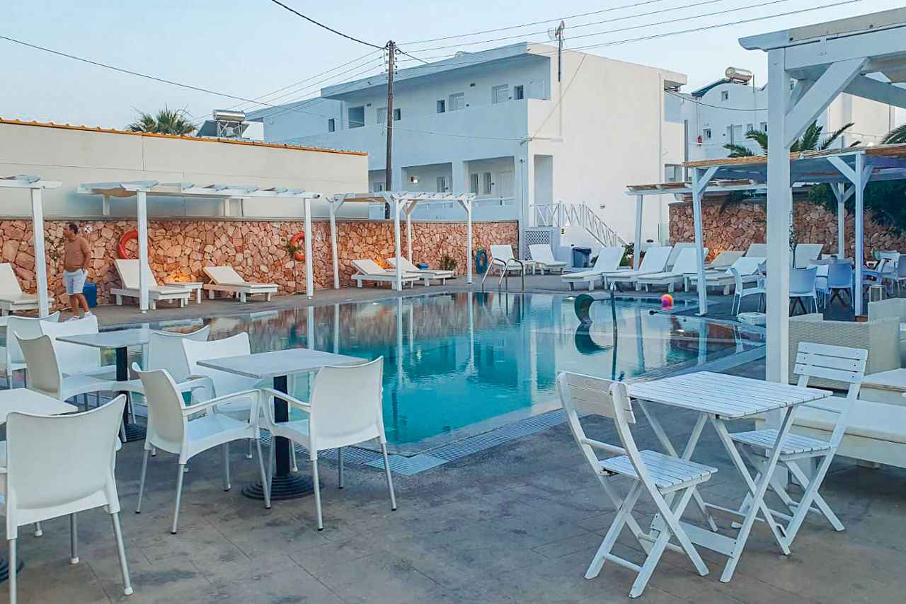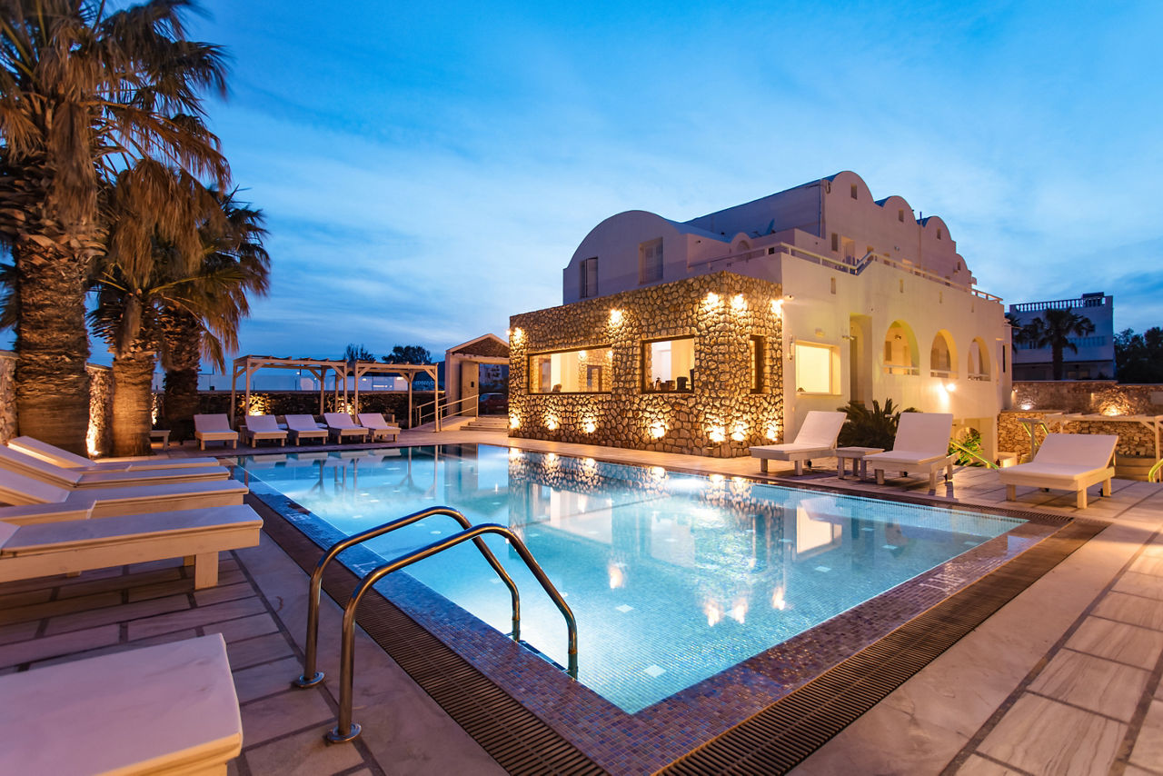 Just a short walk from the black sandy beach of Perivolos and several beach bars and tavernas. Iliada Odysseas Hotel boasts a prime location for a beach holiday. The traditional Cycladic architecture of dainty white sugar cube houses blends perfectly with the turquoise outdoor pool, complemented by a terrace with white sunbeds and cool poolside cabanas. Spacious and tastefully furnished rooms are decorated in neutral tones throughout and offer great value for money.
