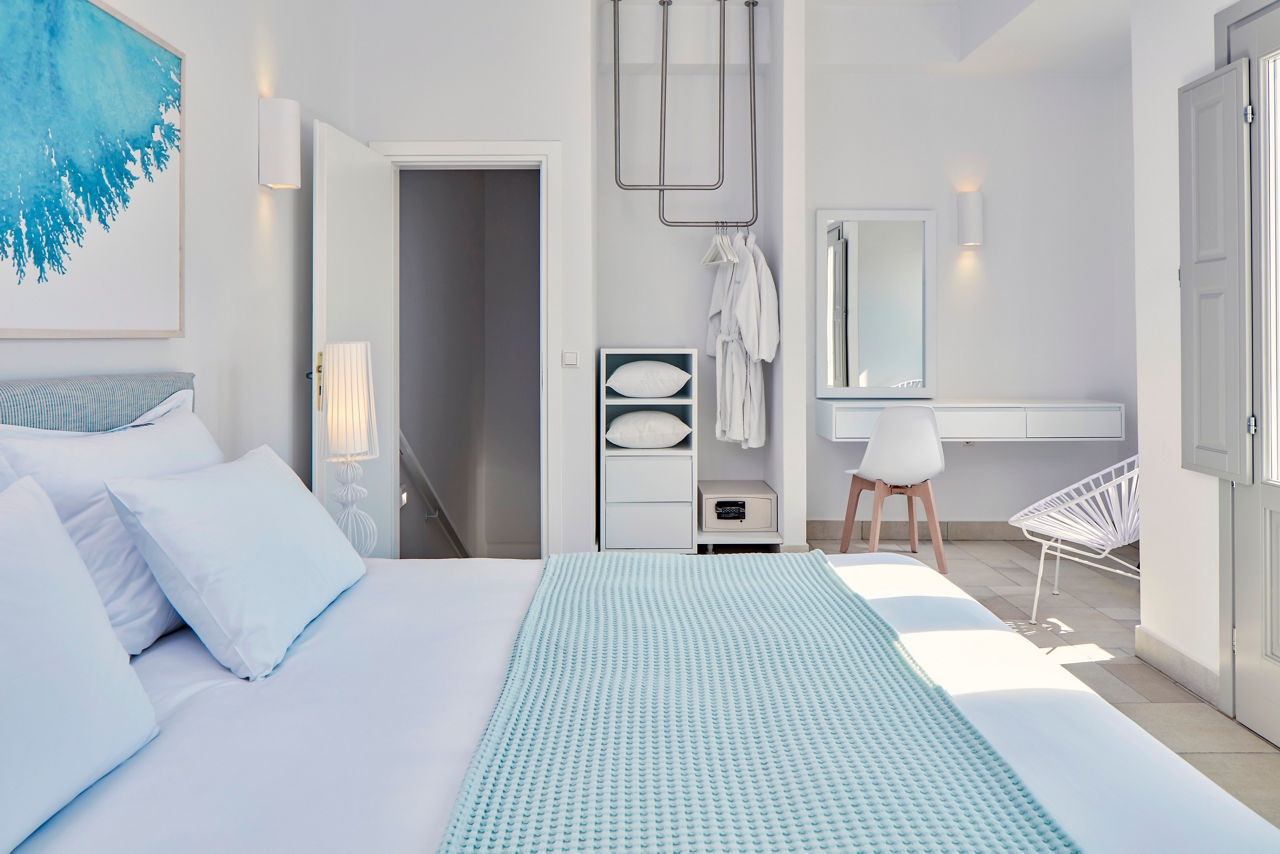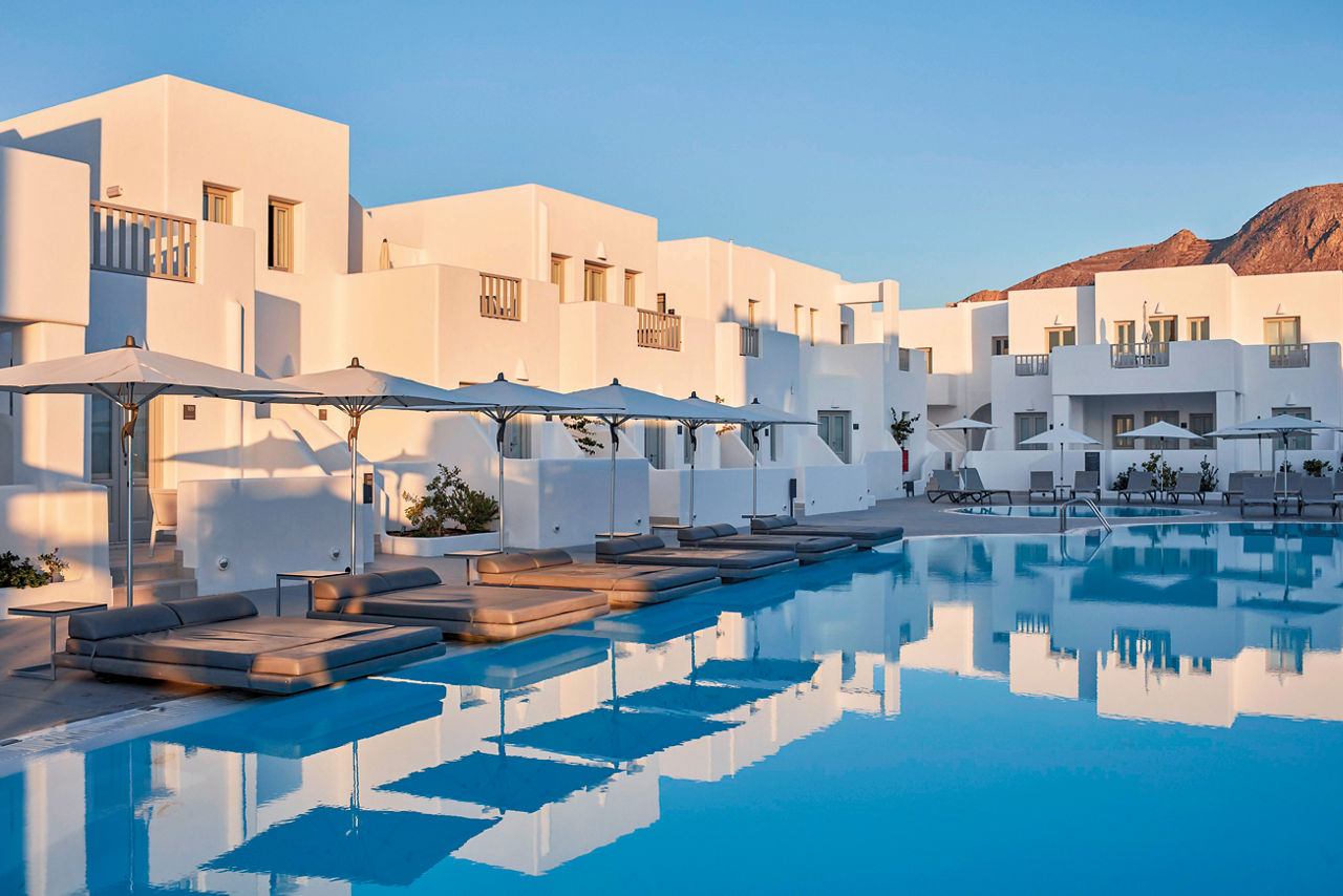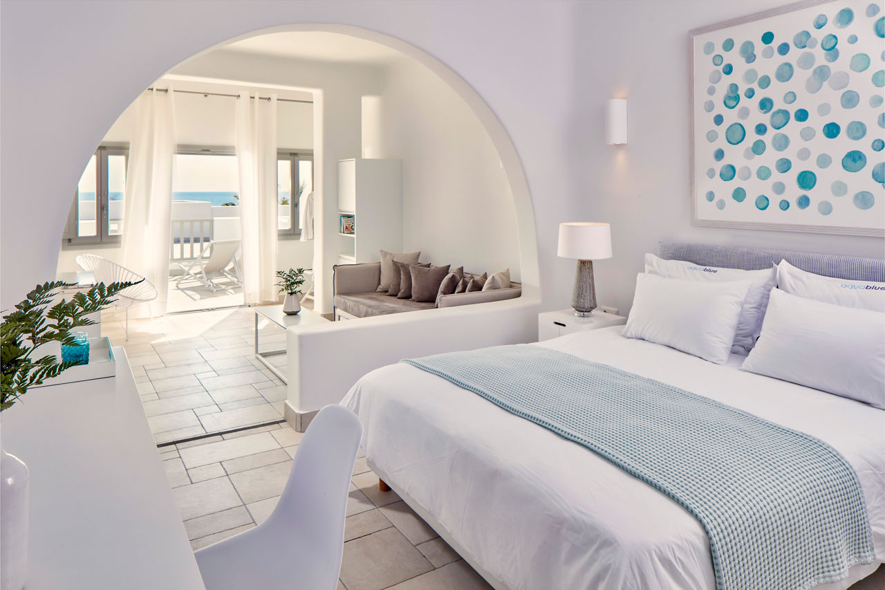 This just-off-the-coast complex has a rural look and feel. Surrounded by mountains and just a stone?s throw from a black-sand beach, it?s a natural gem. Classic sugar-cube buildings finish off this Cycladic stunner and they?re wrapped around the two outdoor pools and sun terrace. Relaxation is the order of the day here. Grab a lounger or even stroll to the seafront. If you fancy exploring, central Perissa isn?t far either. White, grey and blue hues give the Aqua Blue Hotel a chic, contemporary style. What?s more, there?s a kids? pool, full spa, gym and cardio area, pool bar and Greek restaurant. Bliss.Double rooms sleep 2 adults and have bathroom containing a shower, air conditioning, hairdryer, flat screen television, fridge and balcony or terrace. Family rooms sleeping up 3 adults are also available.