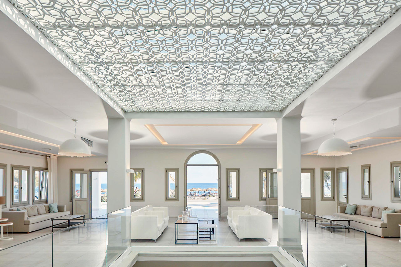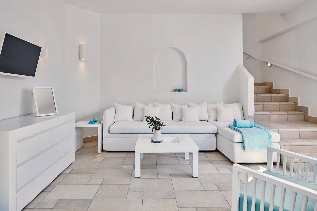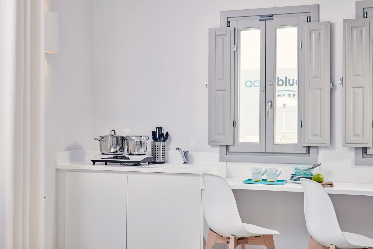 This just-off-the-coast complex has a rural look and feel. Surrounded by mountains and just a stone?s throw from a black-sand beach, it?s a natural gem. Classic sugar-cube buildings finish off this Cycladic stunner and they?re wrapped around the two outdoor pools and sun terrace. Relaxation is the order of the day here. Grab a lounger or even stroll to the seafront. If you fancy exploring, central Perissa isn?t far either. White, grey and blue hues give the Aqua Blue Hotel a chic, contemporary style. What?s more, there?s a kids? pool, full spa, gym and cardio area, pool bar and Greek restaurant. Bliss.Double rooms sleep 2 adults and have bathroom containing a shower, air conditioning, hairdryer, flat screen television, fridge and balcony or terrace. Family rooms sleeping up 3 adults are also available.