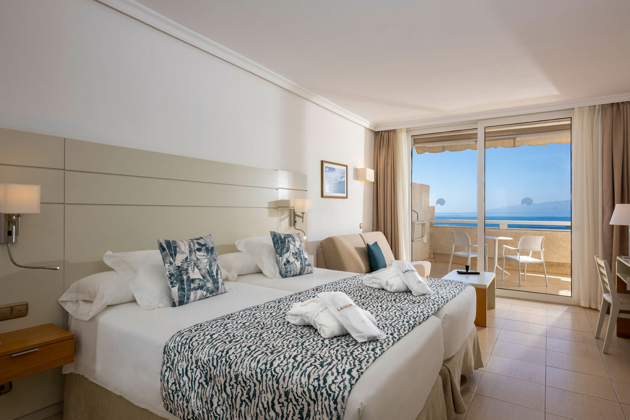 Landmar Playa La Arena offers both luxury and location. Featuring pretty gardens, stunning sea views and a great range of facilities, this Tenerife hotel is the ultimate place to de-stress and unwind. So pick a sunbed, grab a drink from the pool bar and relax in this perfect paradise. Venture onto the black volcanic sand of the nearby beach or check out central Puerto De Santiago. From a gorgeous pool area and sports facilities to a relaxing outdoor Thalasso pool and entertainment programme, the wide-range of facilities make this Tenerife hotel ideal for both couples and friends.Twin rooms sleep up to 2 adults and have bathroom containing a bath and separate shower, air- conditioning, hairdryer, flat screen television, hairdryer and a balcony or terrace. Room upgrade options and Sole Use rooms are also available.