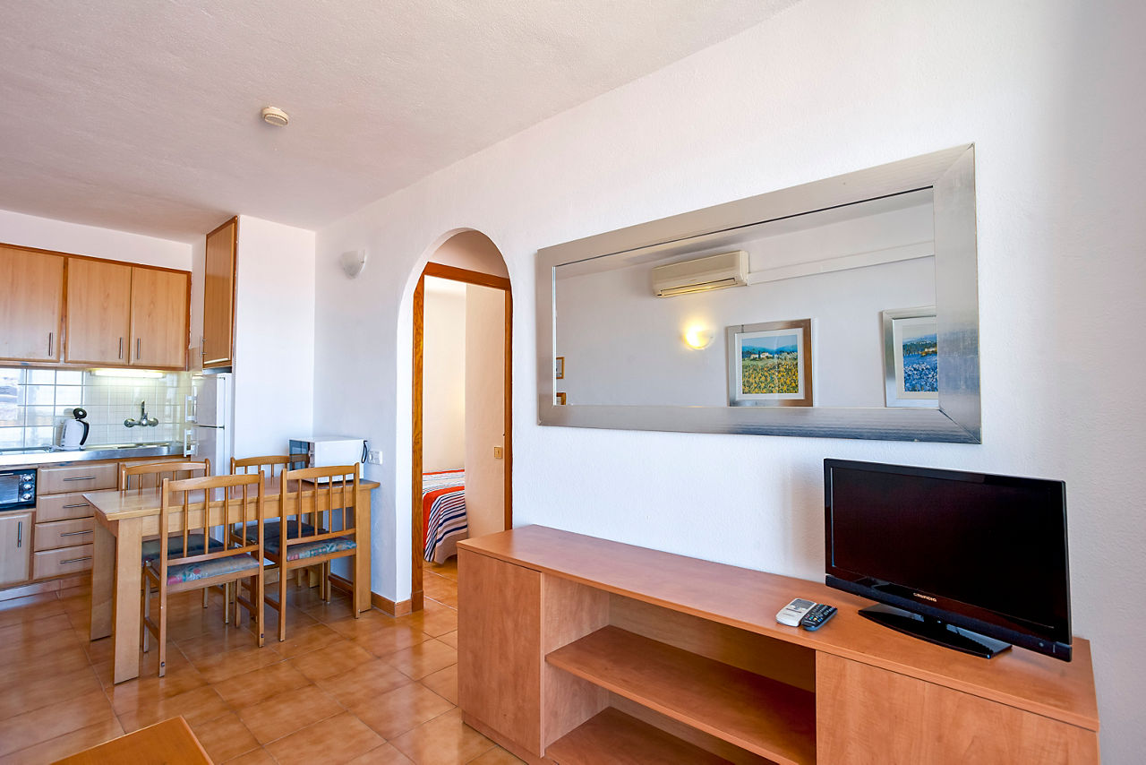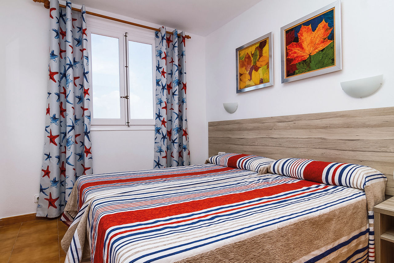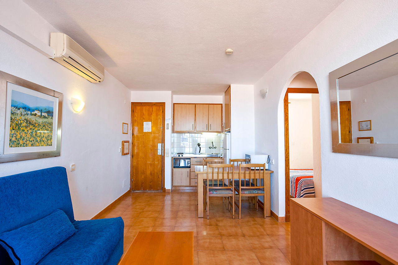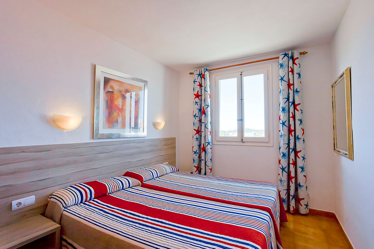 Nestled into the hillside, Sa Mirada Apartments offer a quiet and picturesque setting where relaxing and enjoying the stunning views come as standard. There are three board options here from Self Catering to Bed and Breakfast or Half Board. Whichever option you choose, there is plenty of space to sit back, relax and enjoy the sea views.Two Bedroom apartments sleep up to 4 adults or 3 adults and 2 children and have one bedroom with a double bed and one bedroom with twin beds plus a sofa bed in lounge, bathroom with shower, air conditioning, kitchenette with mini-oven, cooking rings and fridge, and a balcony or terrace.