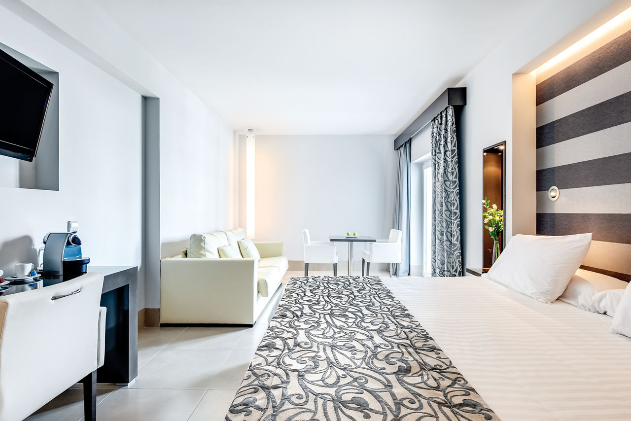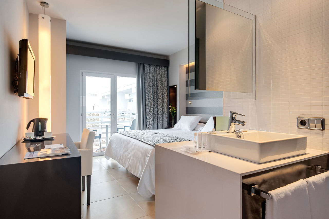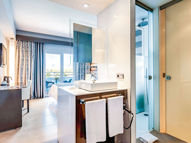 Superior rooms with Pool View sleep 2 adults and have bathroom with shower, hairdryer, air conditioning, satellite TV, free Wi-Fi, tea and coffee making facilities and balcony or terrace. Superior rooms with Sea View sleeping 2 adults, some with balconies, Junior suites sleeping 2 adults and Junior suites with Sea View sleeping 3 adults are also available. Please Note: the bathroom images shown are the style across the whole hotel.