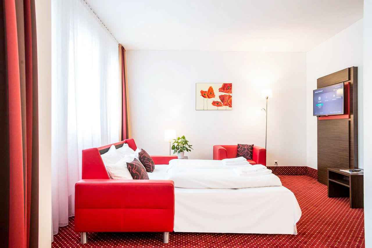 Boasting a fabulous location in the city?s third district, this Vienna hotel has everything you need for a cosy city break be that enjoying the festive markets or summer strolling along the Danube. From signature red d?cor to modern furnishings, the range of rooms are well-equipped for a comfortable stay. Make the most of the hotel?s lavish buffet breakfast of Austrian delicacies, before a day of exploring enchanting Vienna. Looking to relax after shopping the stalls and seeing the sights? Unwind at Best Western Plus Amedia Wien?s on-site sauna or head down to the bar for an evening tipple.Standard Double or Twin rooms sleep up to 2 adults and have bathroom containing a shower or bath with shower attachment, air conditioning, hairdryer, flat screen television, mini-fridge and a safety deposit box. Room upgrade options and Sole Use rooms are also available.