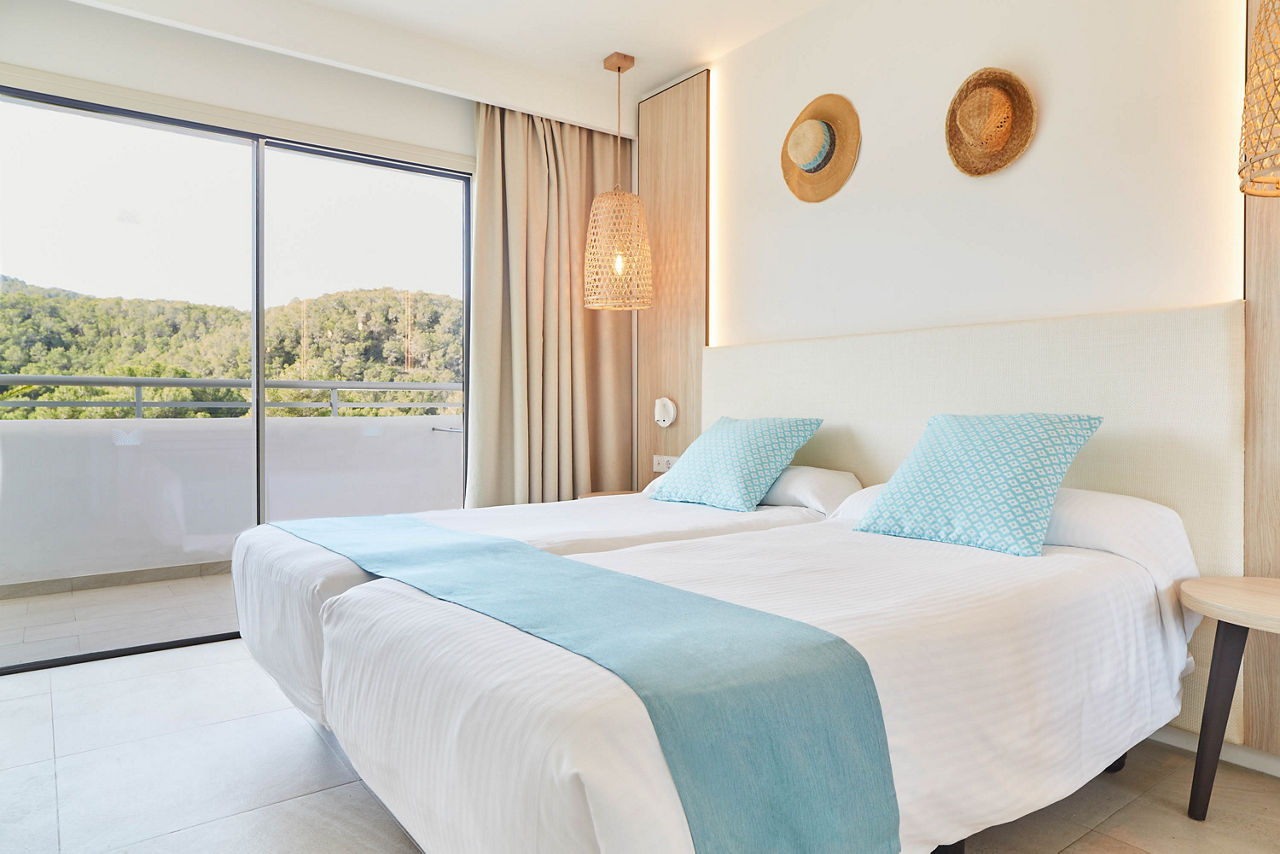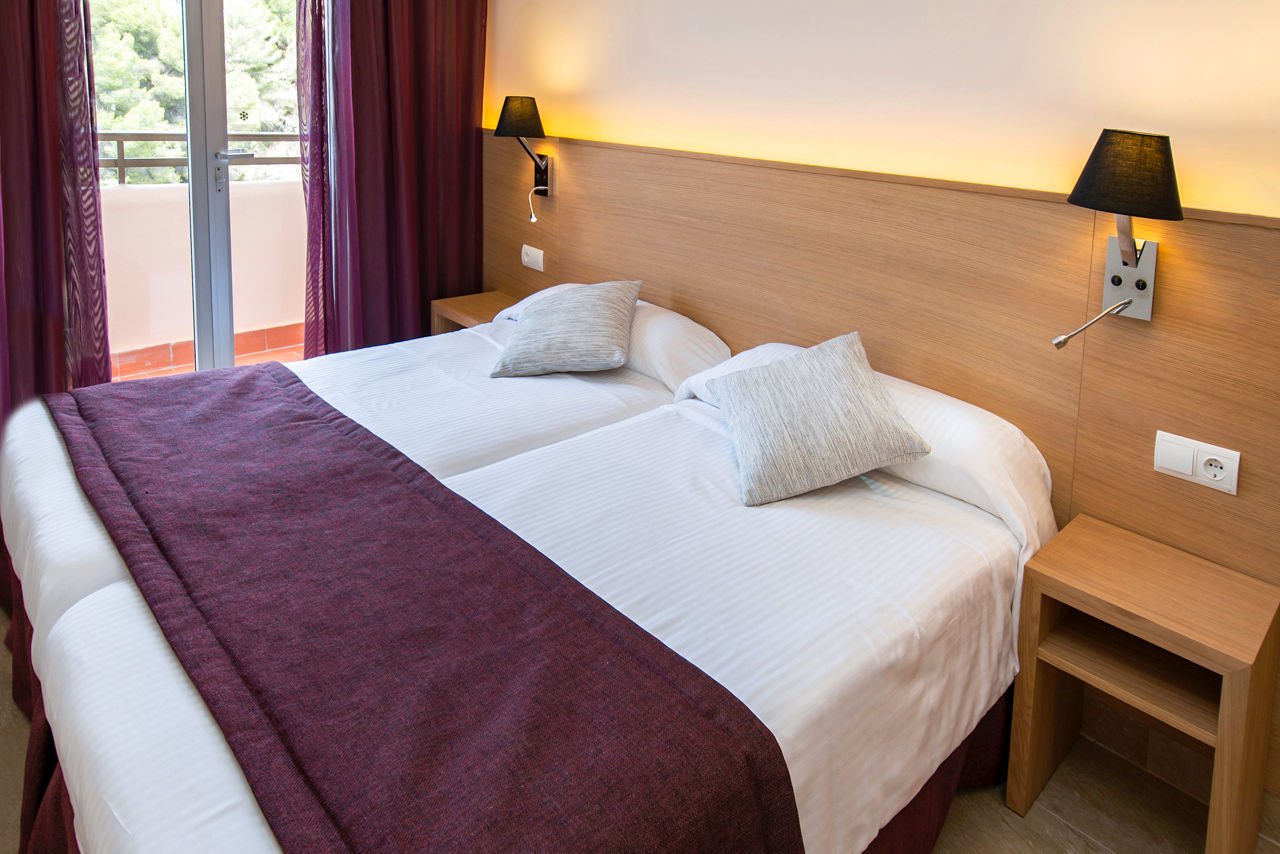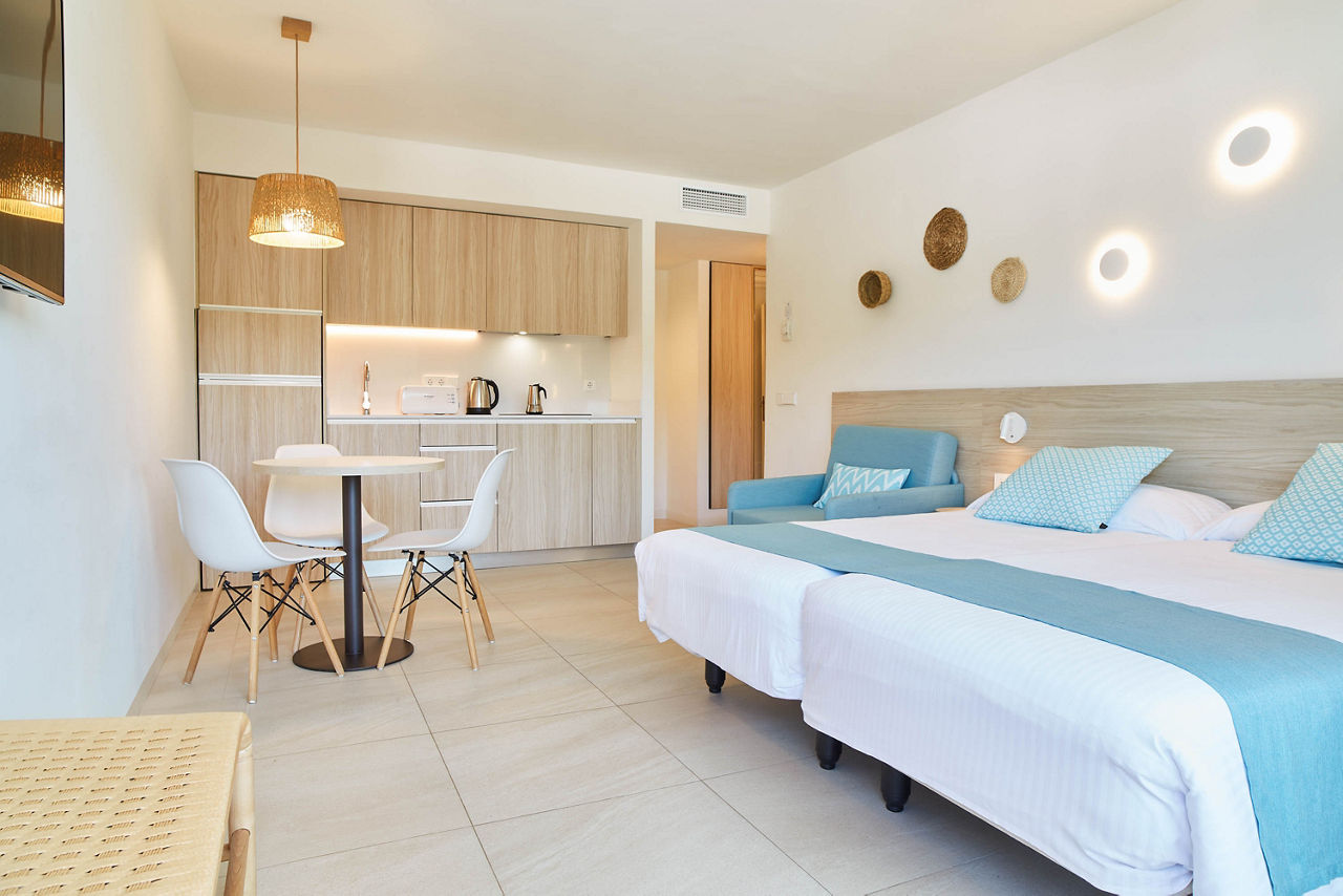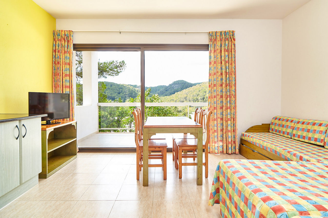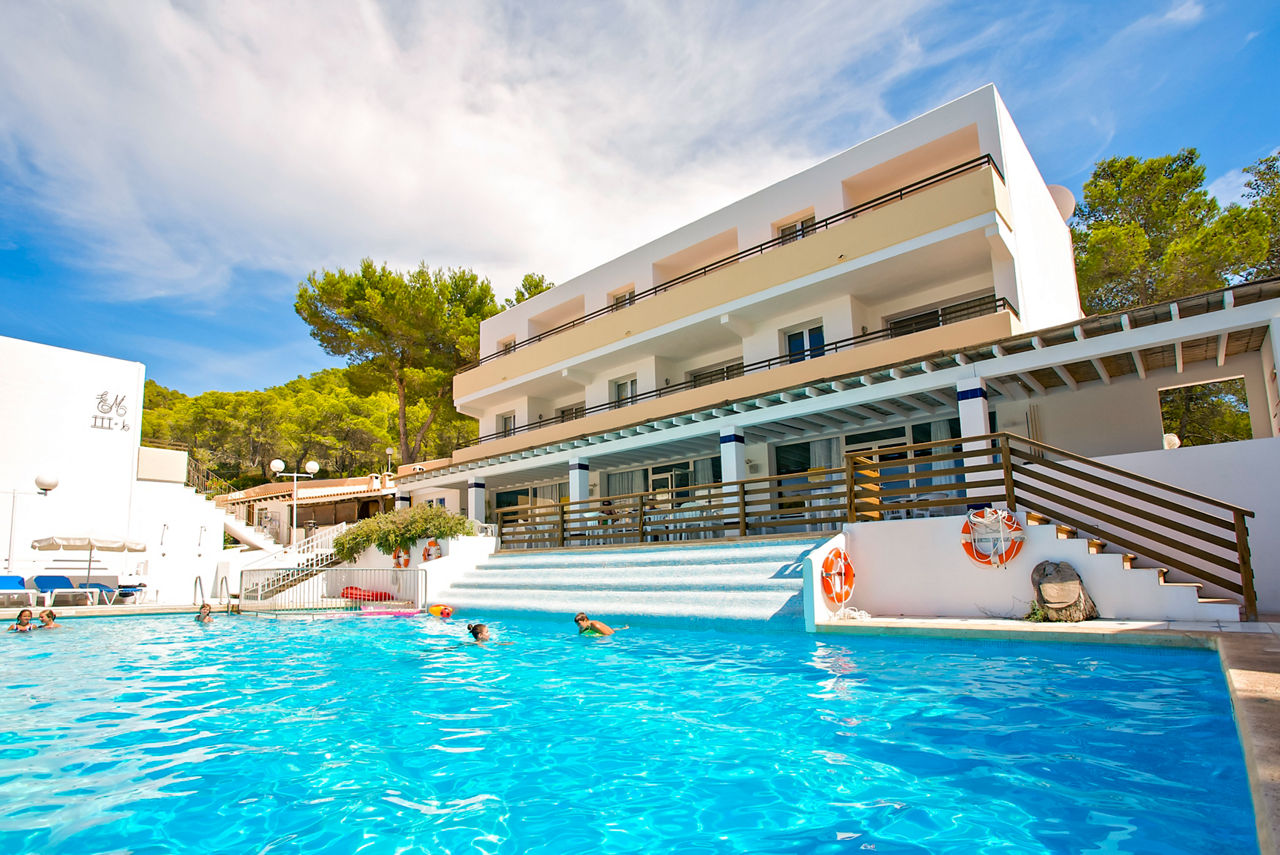 The Apartments San Miguel Park Esmeralda Mar are in a great location with the most stunning views, nestled in the pine trees, above the resort and beach. You can enjoy a short stroll to the beach or relax by one of the pools and soak up the Ibizan sun. There are plenty of activities so both couples and families will love this family-run complex. These apartments also offer All Inclusive so you can enjoy the best of both worlds, apartment facilities but with drinks and meals included!Studios sleep up to 3 adults and has a bathroom containing a bath with shower attachment, hairdryer, air conditioning, satellite TV, DVD and CD player, kitchenette with cooking rings, fridge, microwave and balcony or terrace. One Bedroom apartments sleep up to 4 adults with double or twin beds and sofa beds in the lounge area, One Bedroom Superior Sea View apartments which have been completely refurbished in a modern style with double or twin beds and sofa beds in the lounge area and have bathrobes (on request), 2 flat screen TVs, DVD players and beach towels*, Two Bedroom apartments sleep up to 5 adults with 2 double or twin rooms plus sofa beds in the lounge area, Single parent studios and All Inclusive are also available.