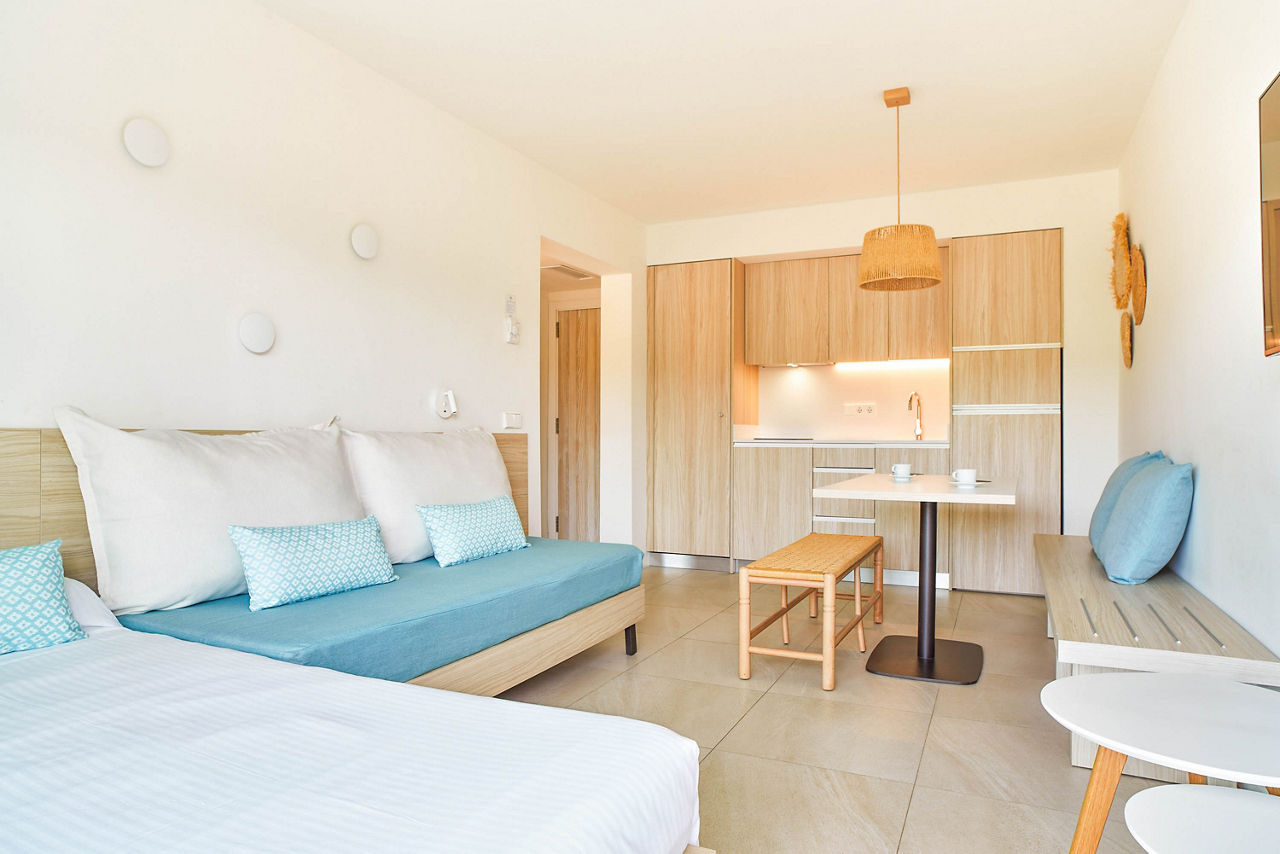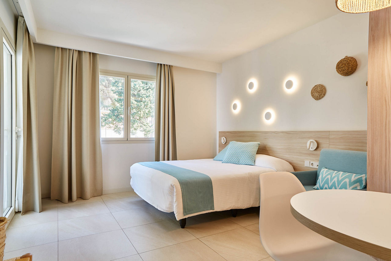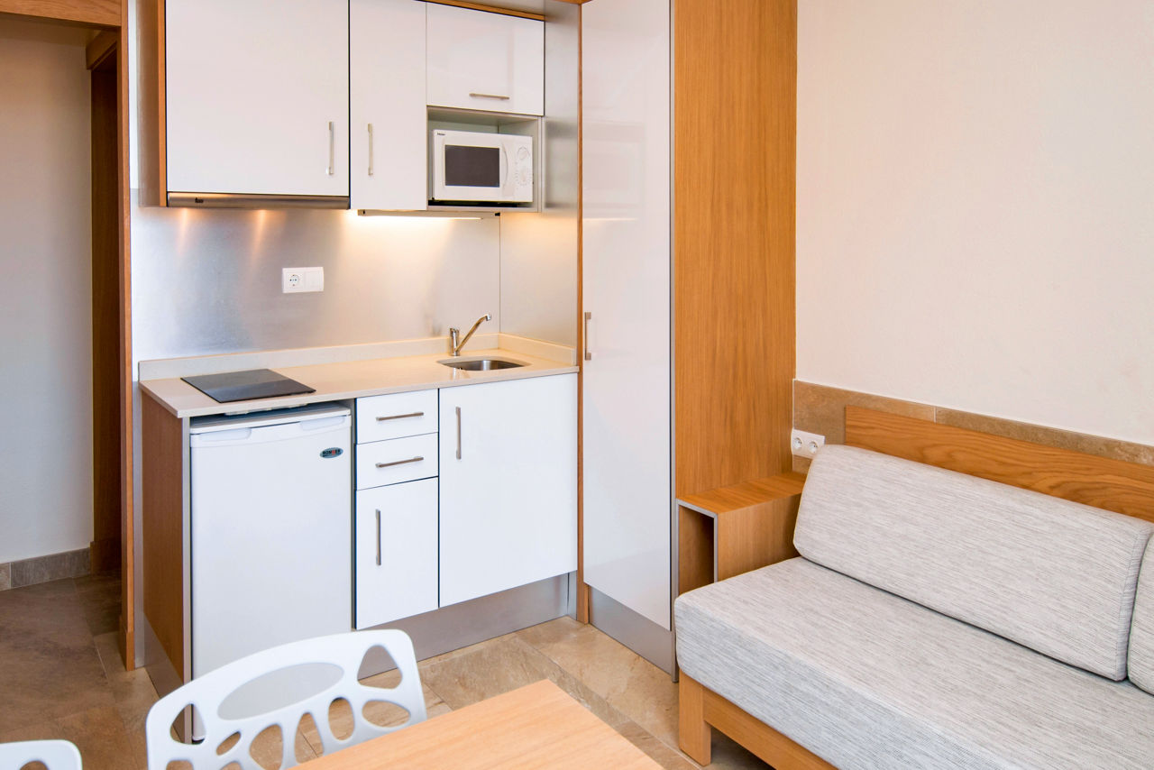 Studios sleep up to 3 adults and has a bathroom containing a bath with shower attachment, hairdryer, air conditioning, satellite TV, DVD and CD player, kitchenette with cooking rings, fridge, microwave and balcony or terrace. One Bedroom apartments sleep up to 4 adults with double or twin beds and sofa beds in the lounge area, One Bedroom Superior Sea View apartments which have been completely refurbished in a modern style with double or twin beds and sofa beds in the lounge area and have bathrobes (on request), 2 flat screen TVs, DVD players and beach towels*, Two Bedroom apartments sleep up to 5 adults with 2 double or twin rooms plus sofa beds in the lounge area, Single parent studios and All Inclusive are also available.